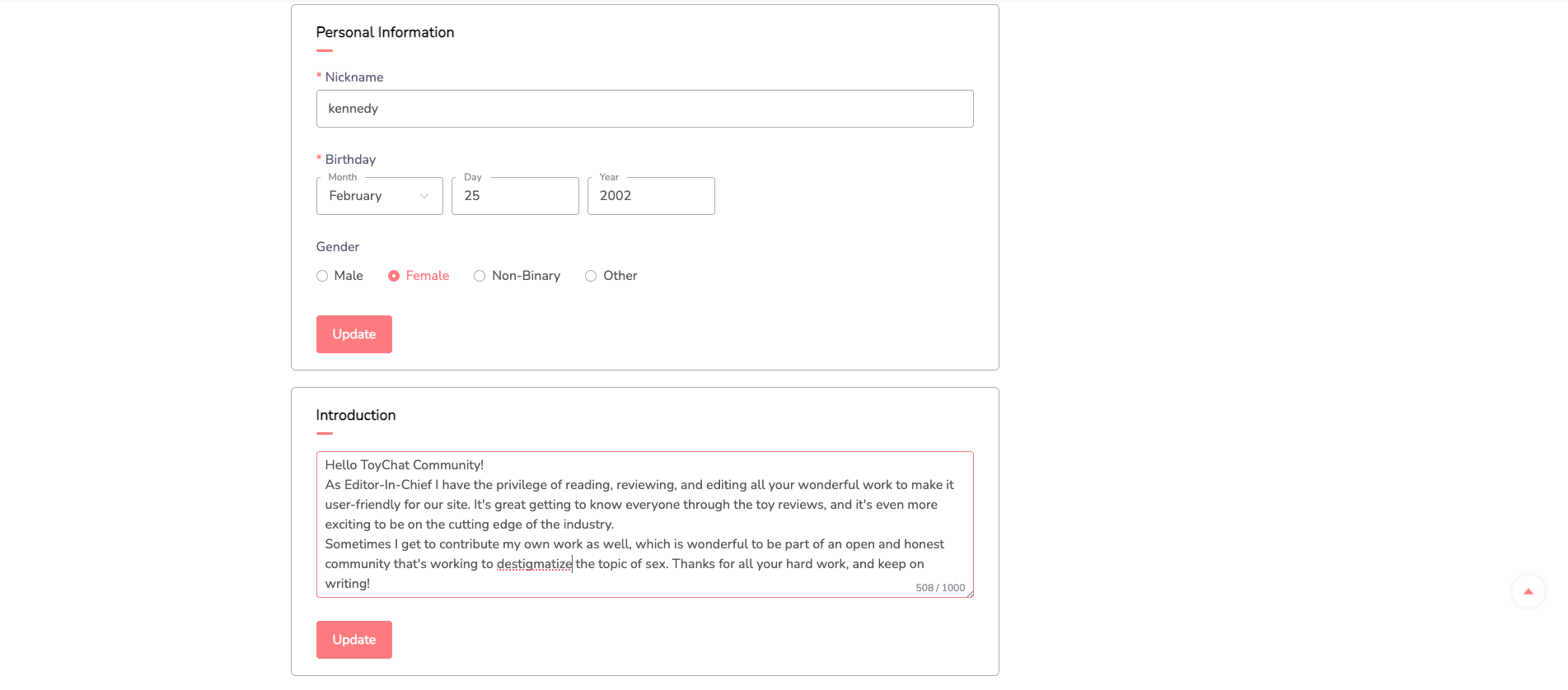 Your bio helps other users understand who you are and what you're interested in. A complete profile makes it easier to connect with others in the community and adds credibility to your contributions. Add a cheeky sentence or two about yourself, and don't forget to mention what toys you're into!