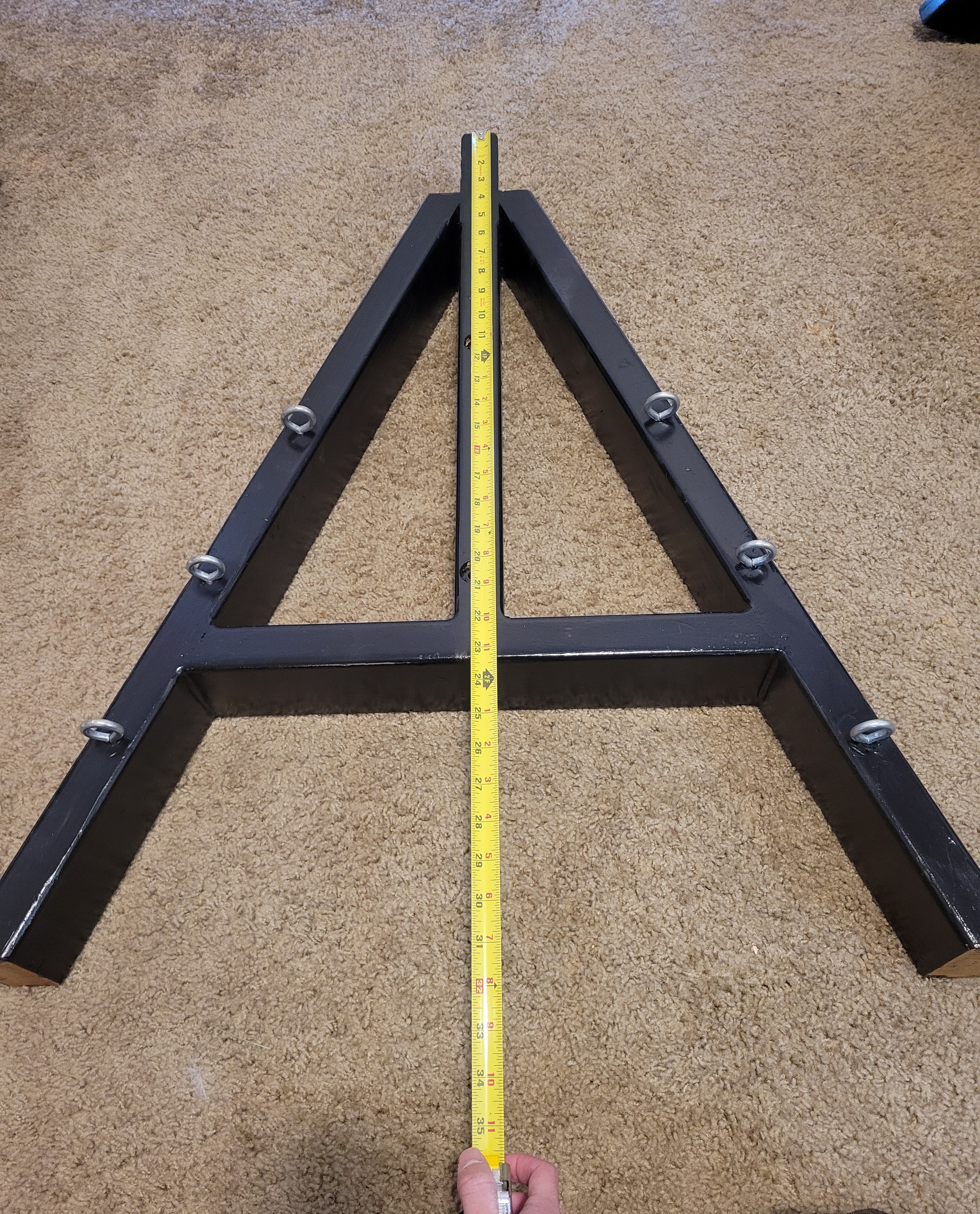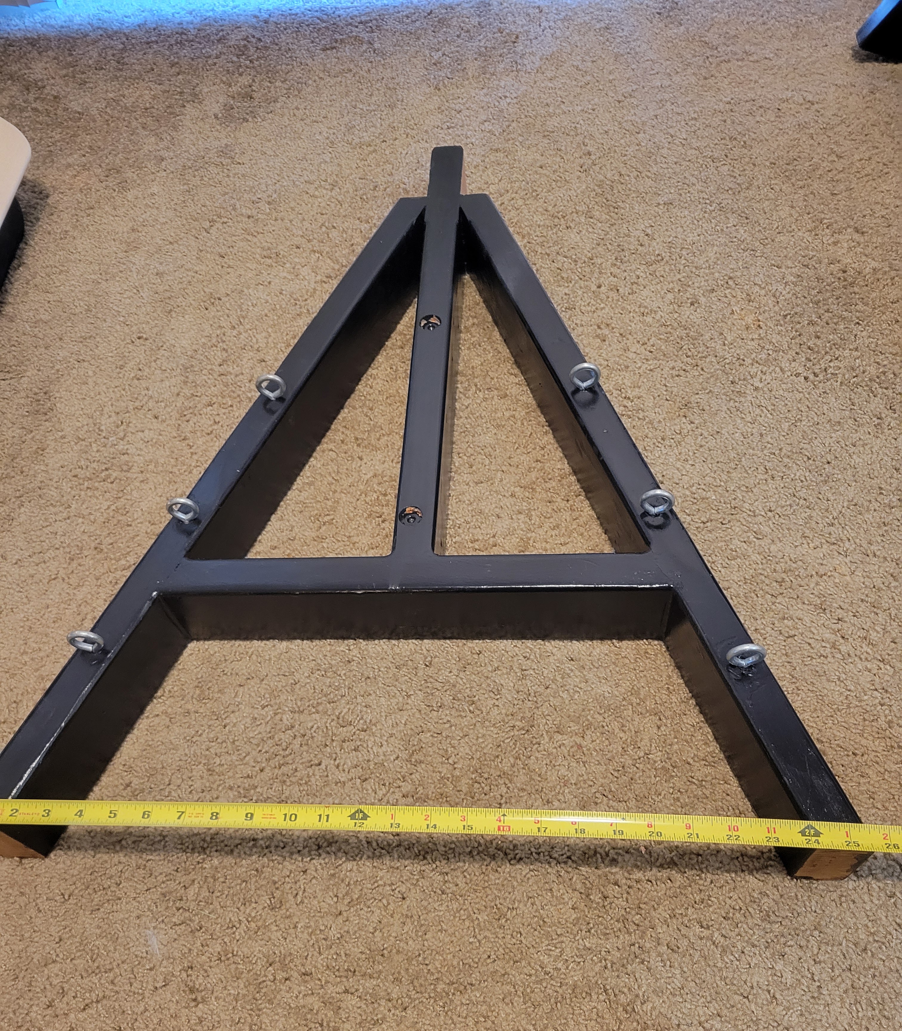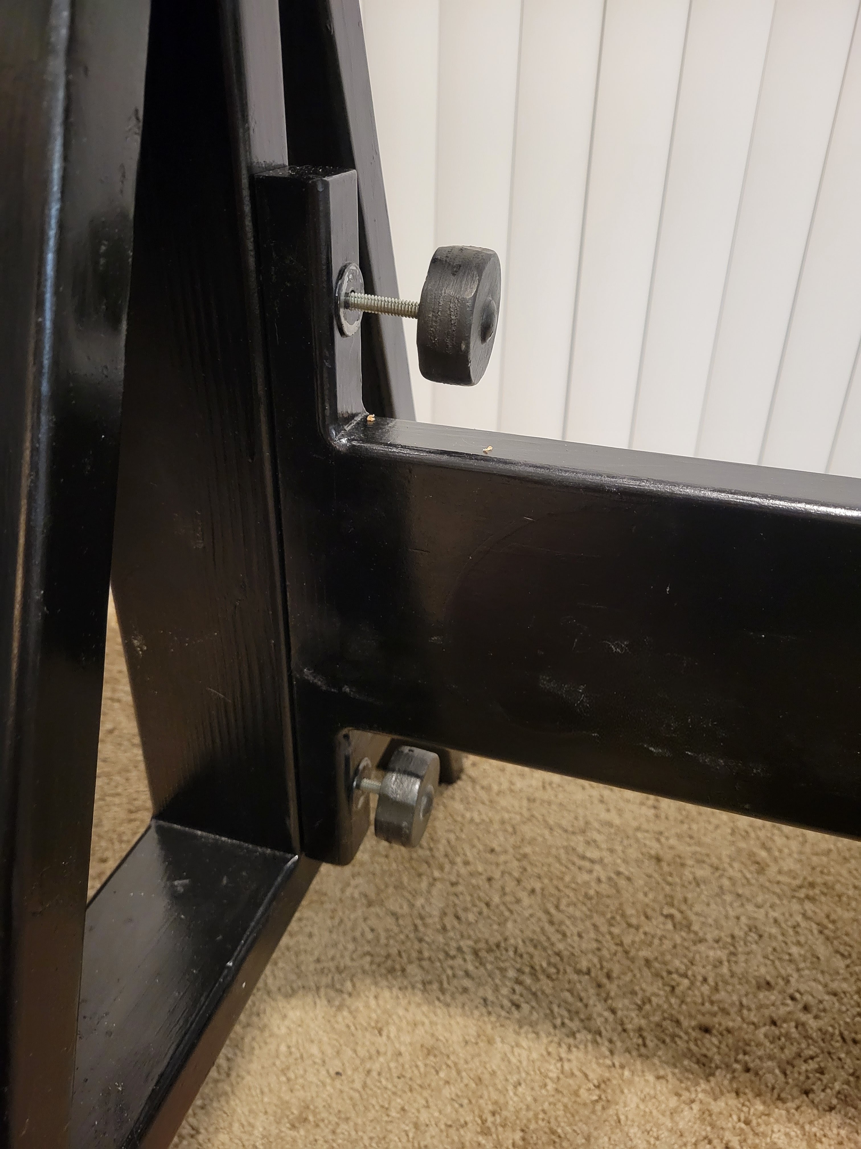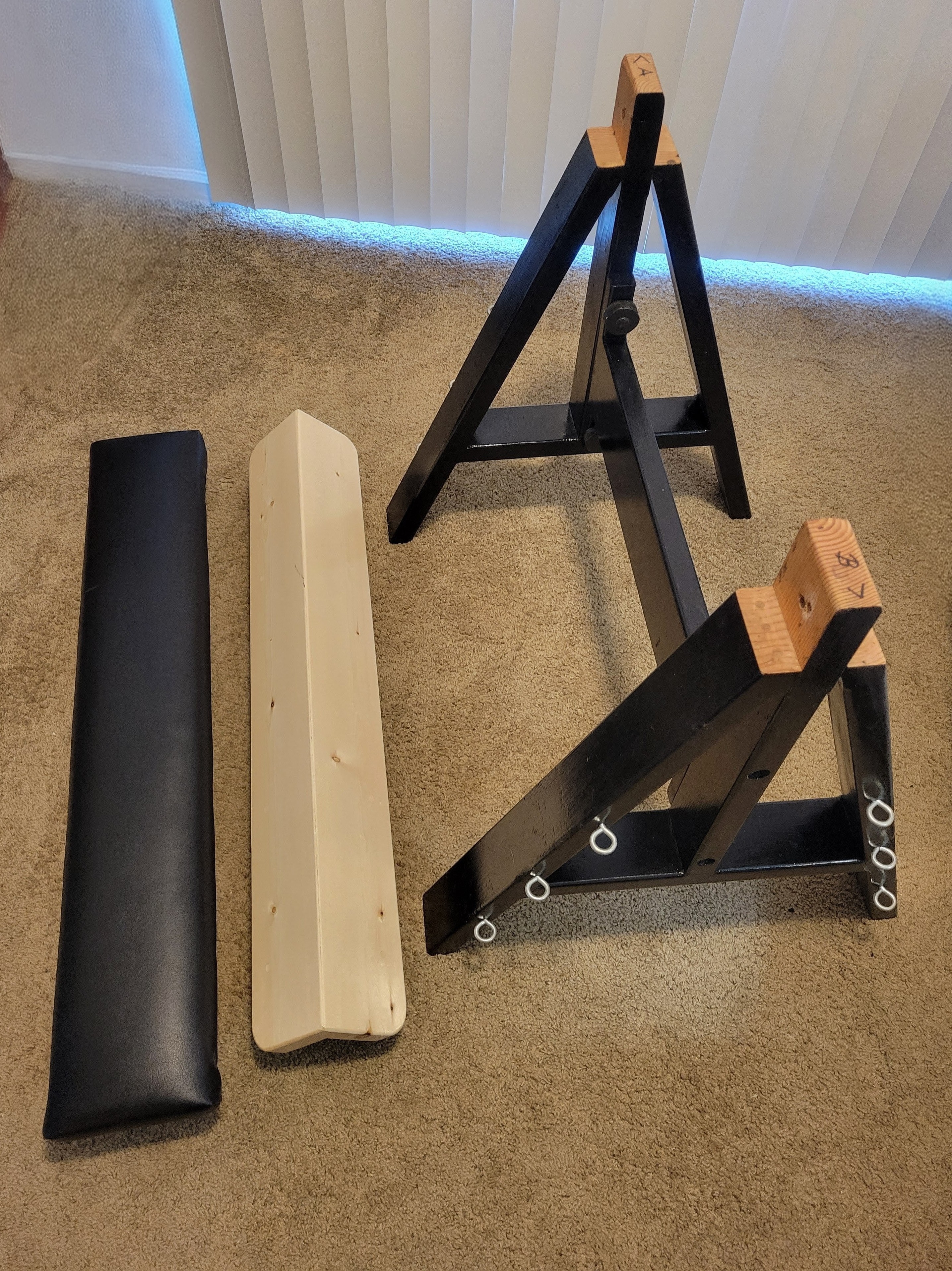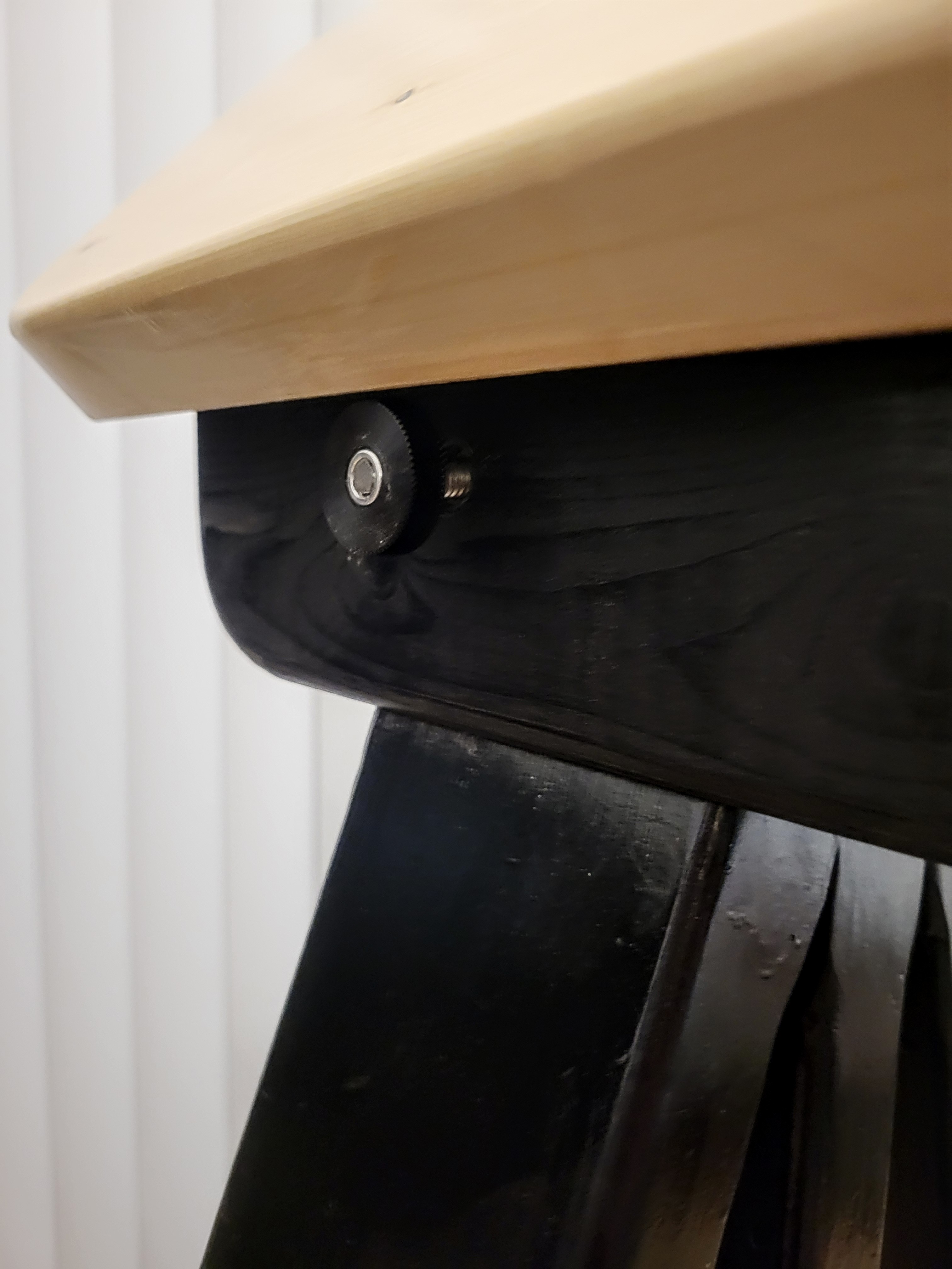 The design of this furniture piece is well thought out and was created to be able to take apart and store. There is a total of 5 parts to assemble and 8 handmade screws. It is lightweight and easy to carry both put together and disassembled. The total weight of the bondage bench is 34.8lbs (15.78kg) and the weight with the Spanish horse attachment is 33.2lbs (15.05kg). The bondage top alone is 13.6lbs (6.16kg) and the Spanish horse top is 12lbs (5.44kg). The base frame put together is 21.2lbs (9.61kg). Individually, triangle A is 9lbs (4.08kg), triangle B is 8.6lbs (3.90kg) and the center connector is 3.2lbs (1.45kg).