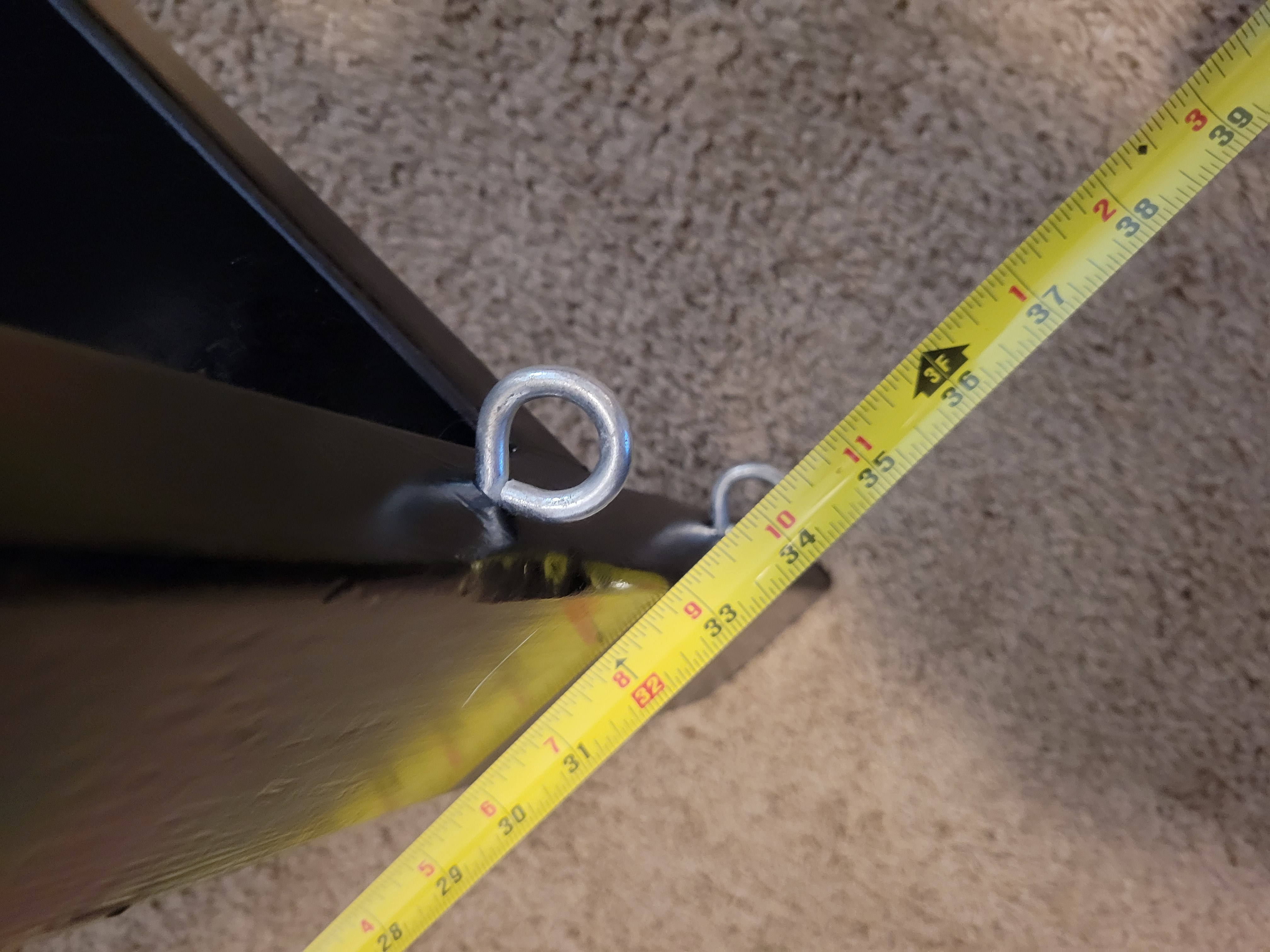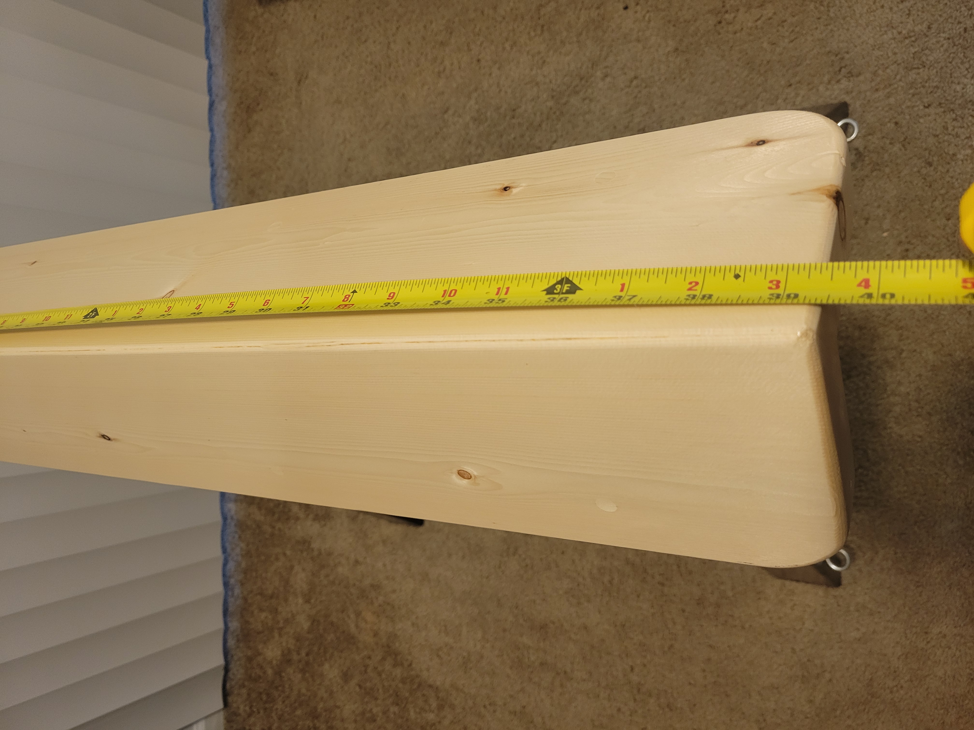 The length of the bench put together at the base is about 2ft 10in (86.36cm) with the eyelets on each side accounting for 2in (5.08cm). The bondage top is 3ft 6.5in (106.68cm) long and the Spanish horse is about 3ft 3.5in (99.06cm).