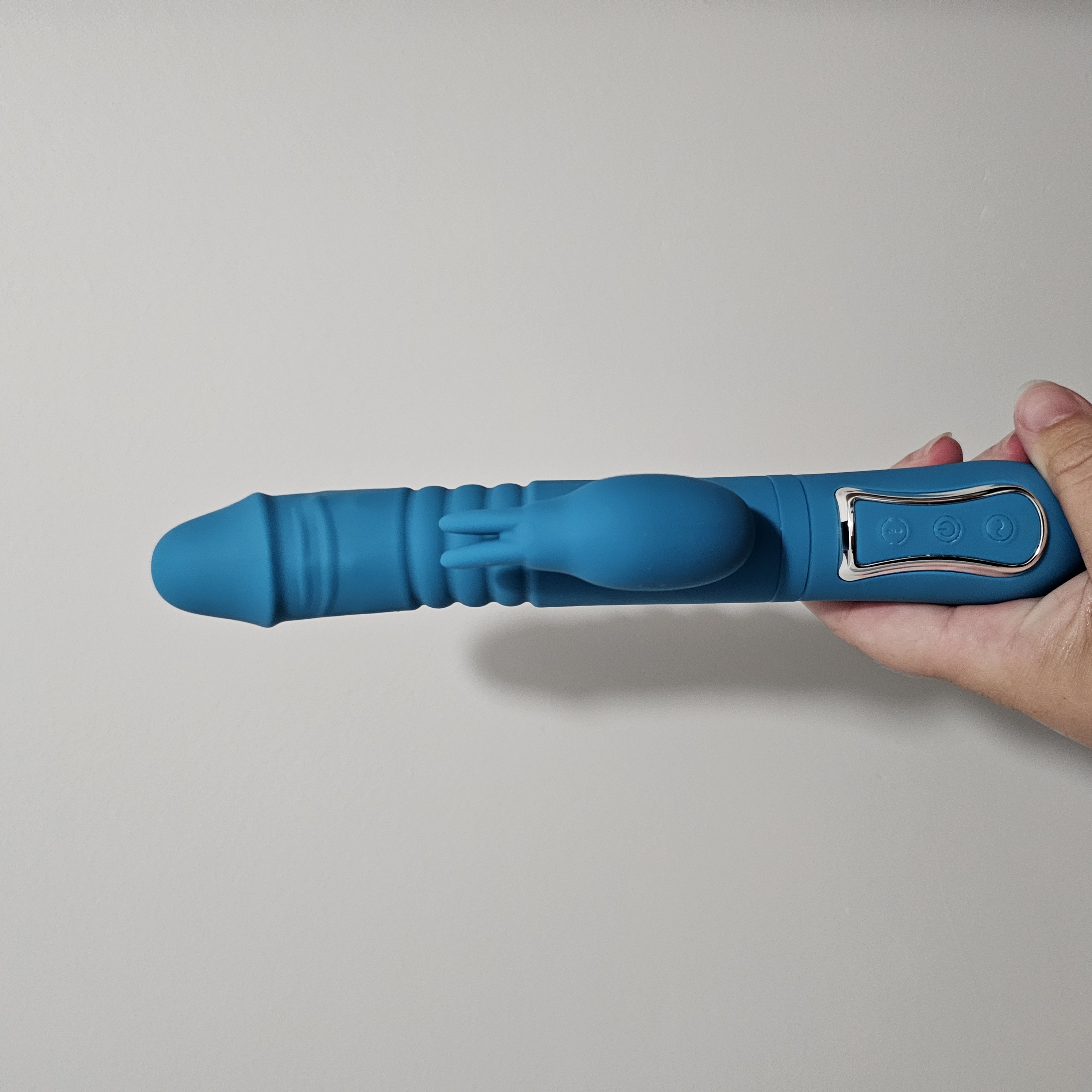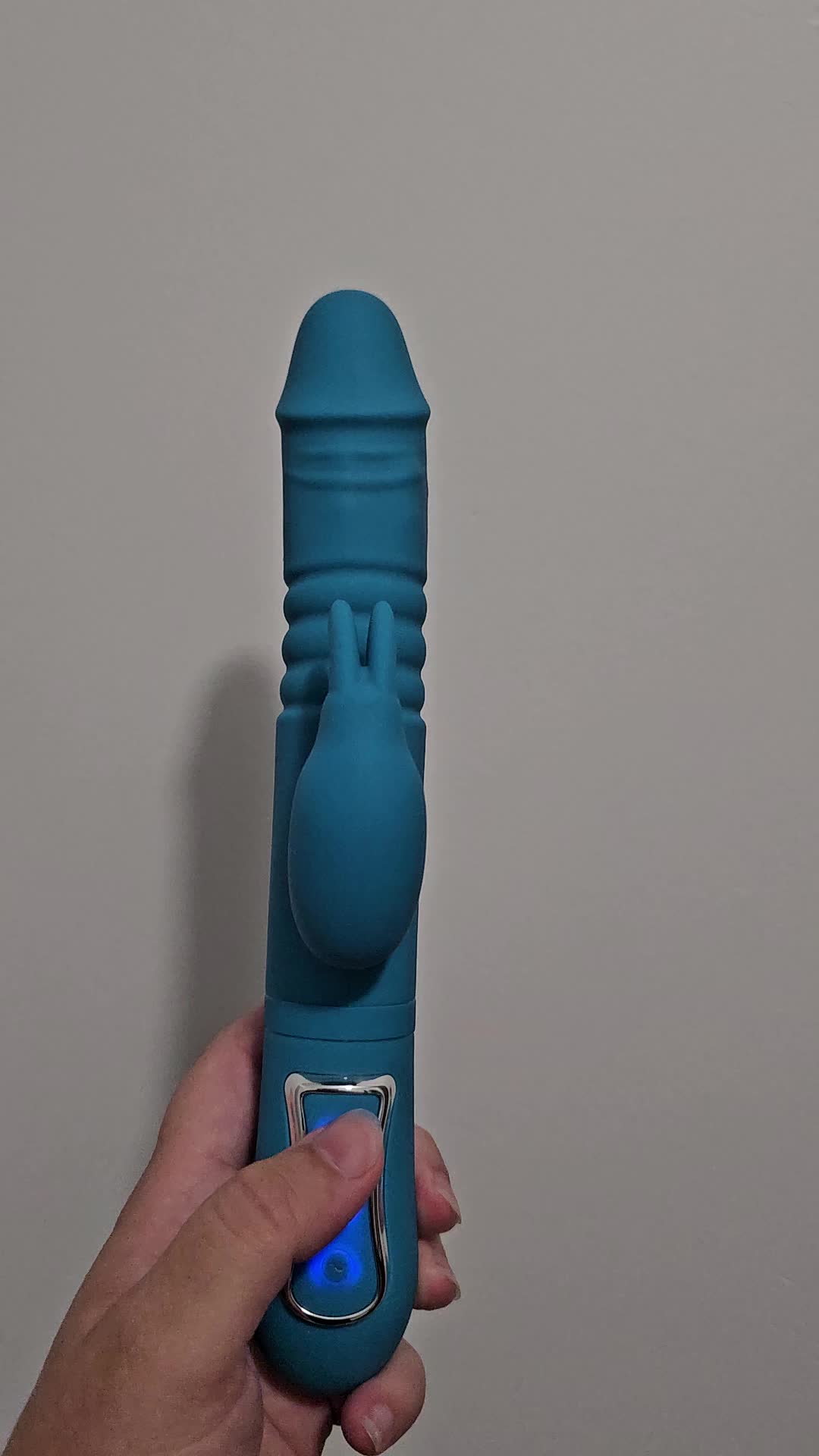 Eve's thrusting triple joy rabbit has a very sleek design, and I love the colour. It has a nice standard size rabbit clitoral stimulator and moderately generous shaft. Personally, I would like if the anal beads could reach further as I can only got the 2 end ones in. I have since tried holding it on a different angle and hold my hand further back and can fit 2-4 beads. I often get bummed out by the fact that men have longer arms and their genitals are right there, yet we have shorter arms and our genitals are tucked further away. Eve's thrusting triple joy rabbit is incredibly easy to use - hold middle button down to turn the power on, bottom button turns on the motor to the rabbit stimulator and anal beads and selects the mode and the top button activates the shaft and moves through the shaft speeds.