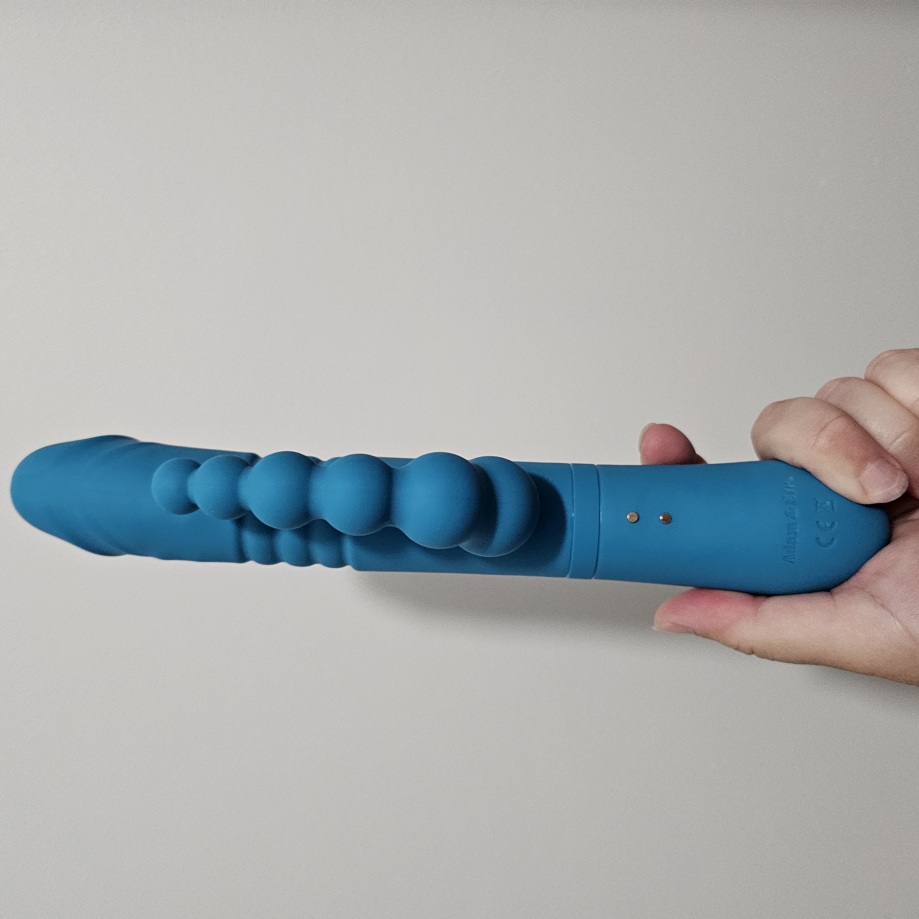 It is very smooth to insert the shaft of Eve's thrusting triple joy rabbit. The shaft movement is at a great level of intensity without having to increase the speed, of which there are 3 speeds for the shaft. The rabbit stimulator and anal bead shaft motors operate together with three constant vibration speeds and seven different vibration patterns. I usually just go for constant vibration with my toys but some of the vibration patterns surprised me and are my go to now. The shaft of Eve's thrusting triple joy rabbit moves in an upwards thrust while the beads under the silicone spin around just below the head of the shaft. When using Eve's thrusting triple joy rabbit I like to stand along side my bed and stand on my tip toes/ balls of my feet while also grounding my weight down through my pelvis for a two directional pull sensation that adds to the joyful sensations experienced while using the toy (this can also be achieved while using other toys, I am yet to try it while with a partner though).