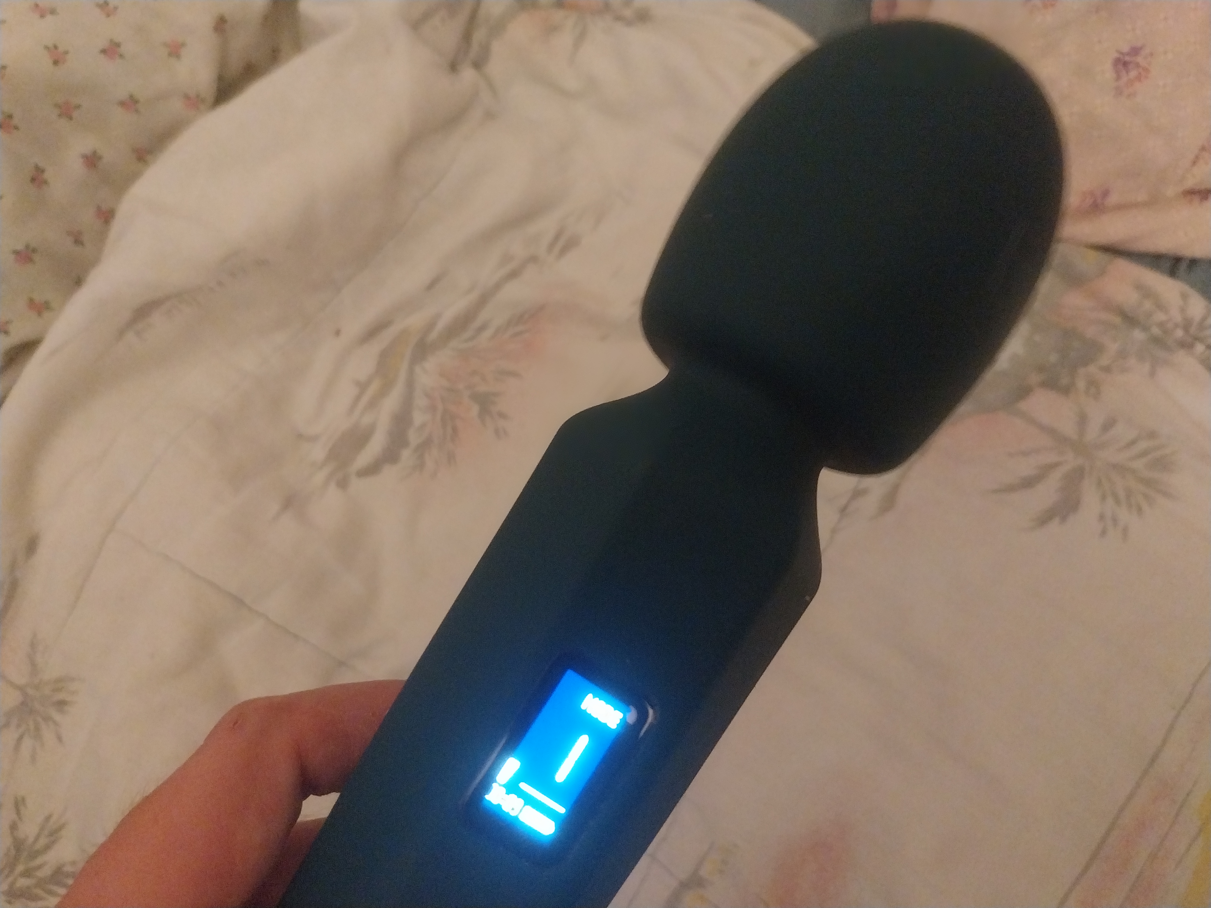 The AkuWand Next Gen’s design is striking. The large rounded head, extended handle, and smooth finish give it a professional, almost industrial feel. The control buttons are placed logically, and what really stands out is the built-in display. That screen is surprisingly helpful. It shows you the current vibration type and intensity, battery level, and even how long the wand has been running. I didn’t think I’d care much about that last part, but it’s actually useful to keep track of how long you’ve been at it. The toy looks sleek and clean, but again, its size is both a blessing and a curse. The scale adds to its aura of power but makes it less discreet and harder to handle in tighter angles.