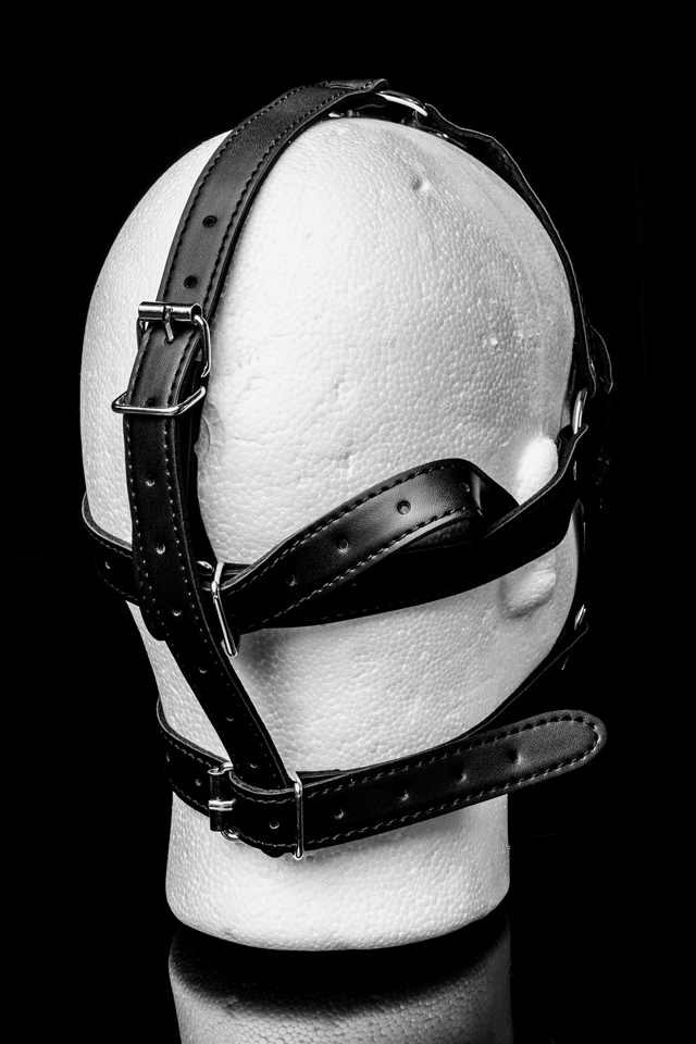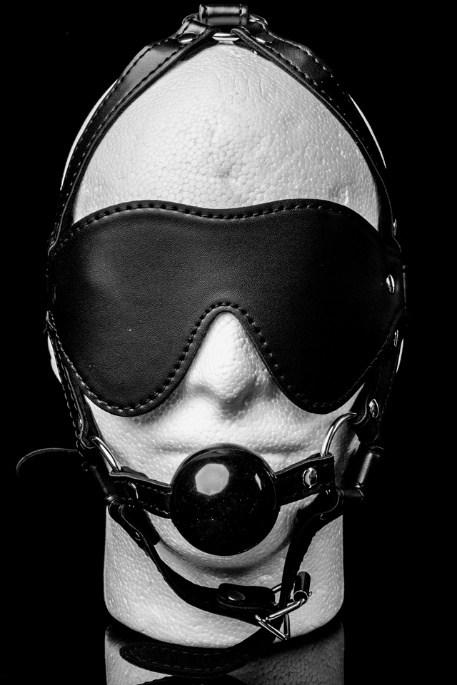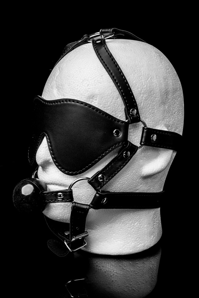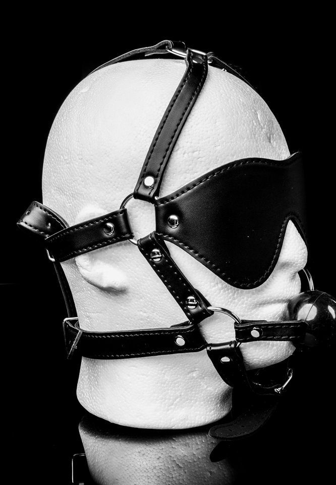 The Blindfold Harness and Ball Gag is a combination bondage tool designed to simultaneously restrict two major senses: sight and speech.