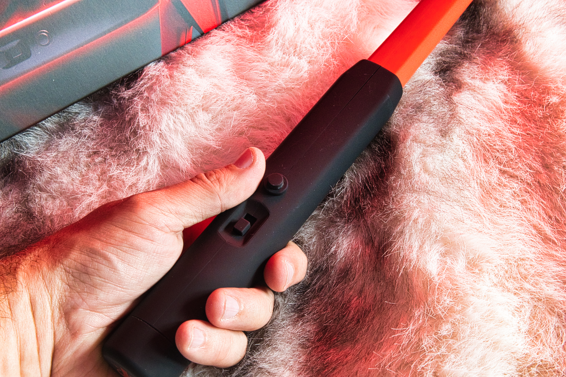 The total length of the wand is 15 inches, with a battery compartment at one end and two metal loops on the other. The controls are both simple and confusing, with a three-way switch to select the power level. The position closest to you is the strongest, and furthest away is the weakest—though counterintuitively, it's the lowest setting that seems to produce more of a visual zap and less pain.