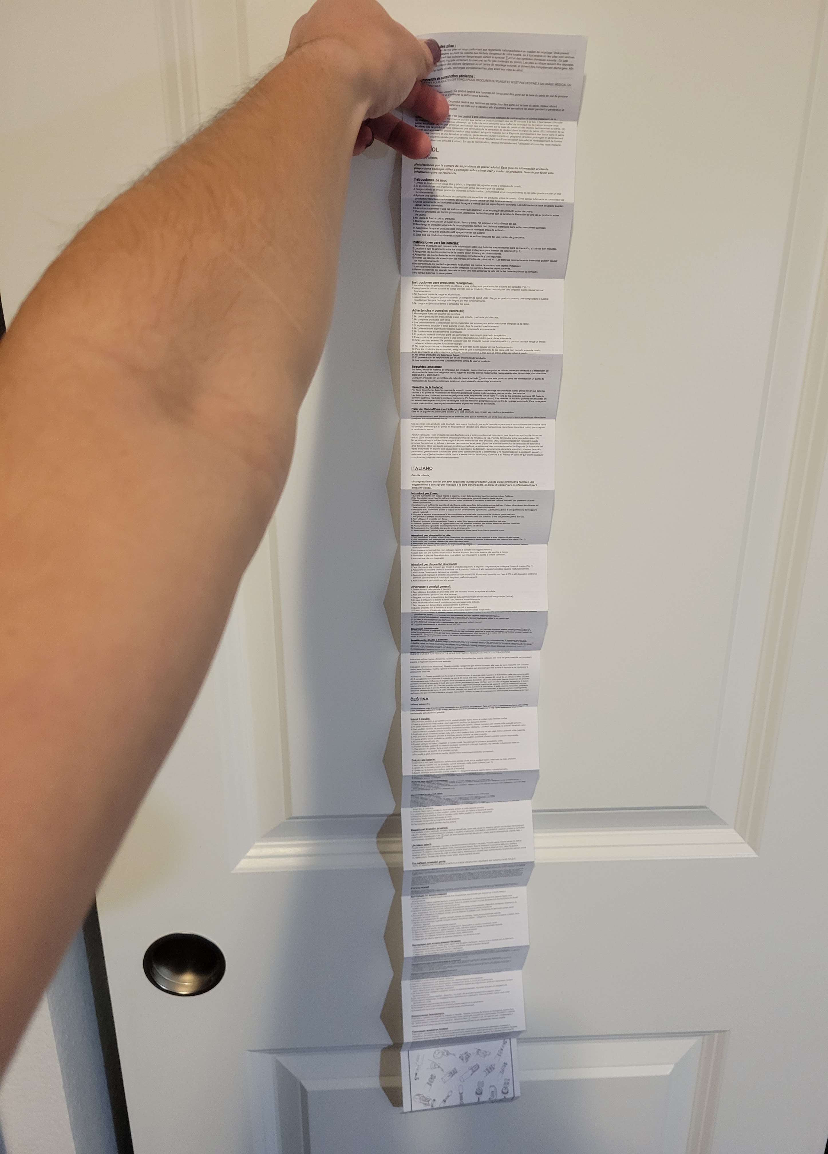 The packaging was broken down into three parts. The box was standard and very easy to open at the top. Inside, the toy and harness are packed in a plastic wrap with the harness in its own packaging. The plastic included tear areas, so opening the plastic was very quick and easy. The instructions that come with the product are base instructions for more than this specific product. The instructions go over cleaning, use, and battery-operated items. The battery operating instructions included a small visual of the different types of battery packs a toy could include. The biggest reason why the instructions are so long is that it includes nine different languages from English, Italiano to Russian. I feel this creates great accessibility when instructions can come in many different languages and pictures. I really appreciate this and would love to see it more for toys in general.