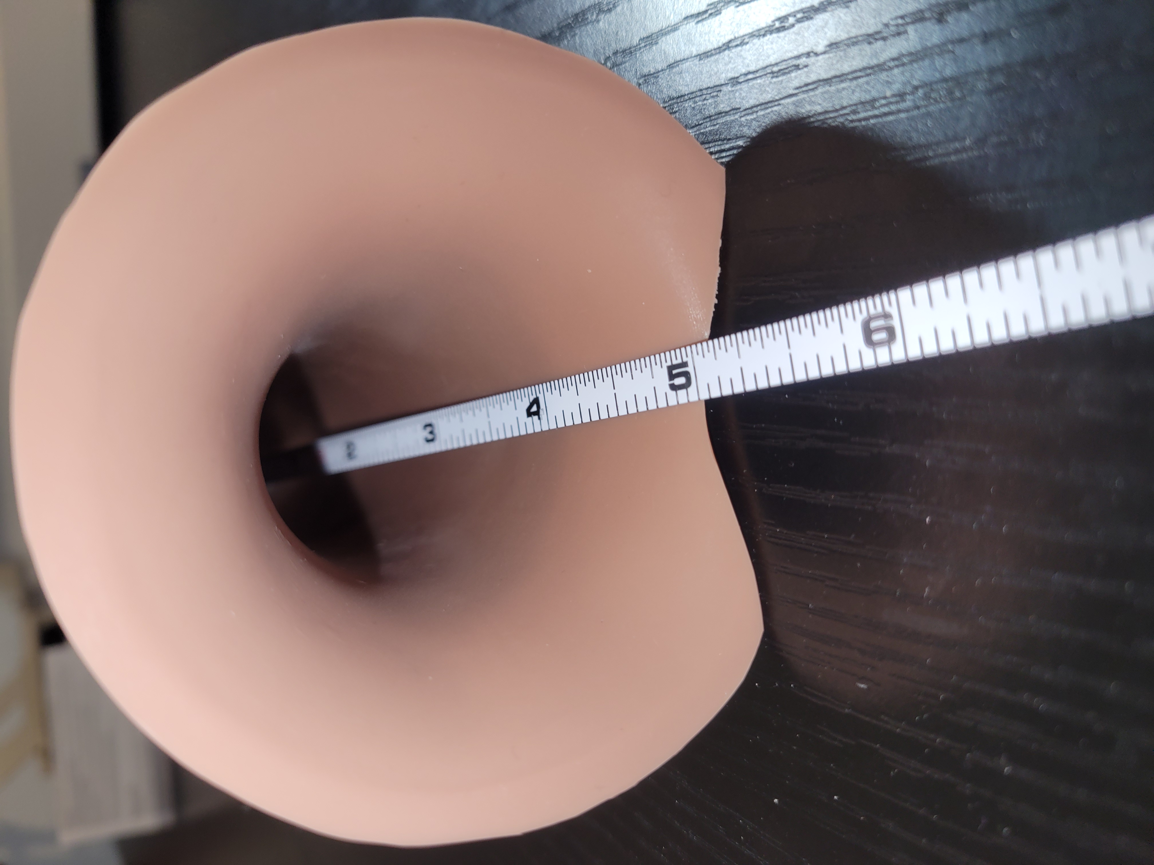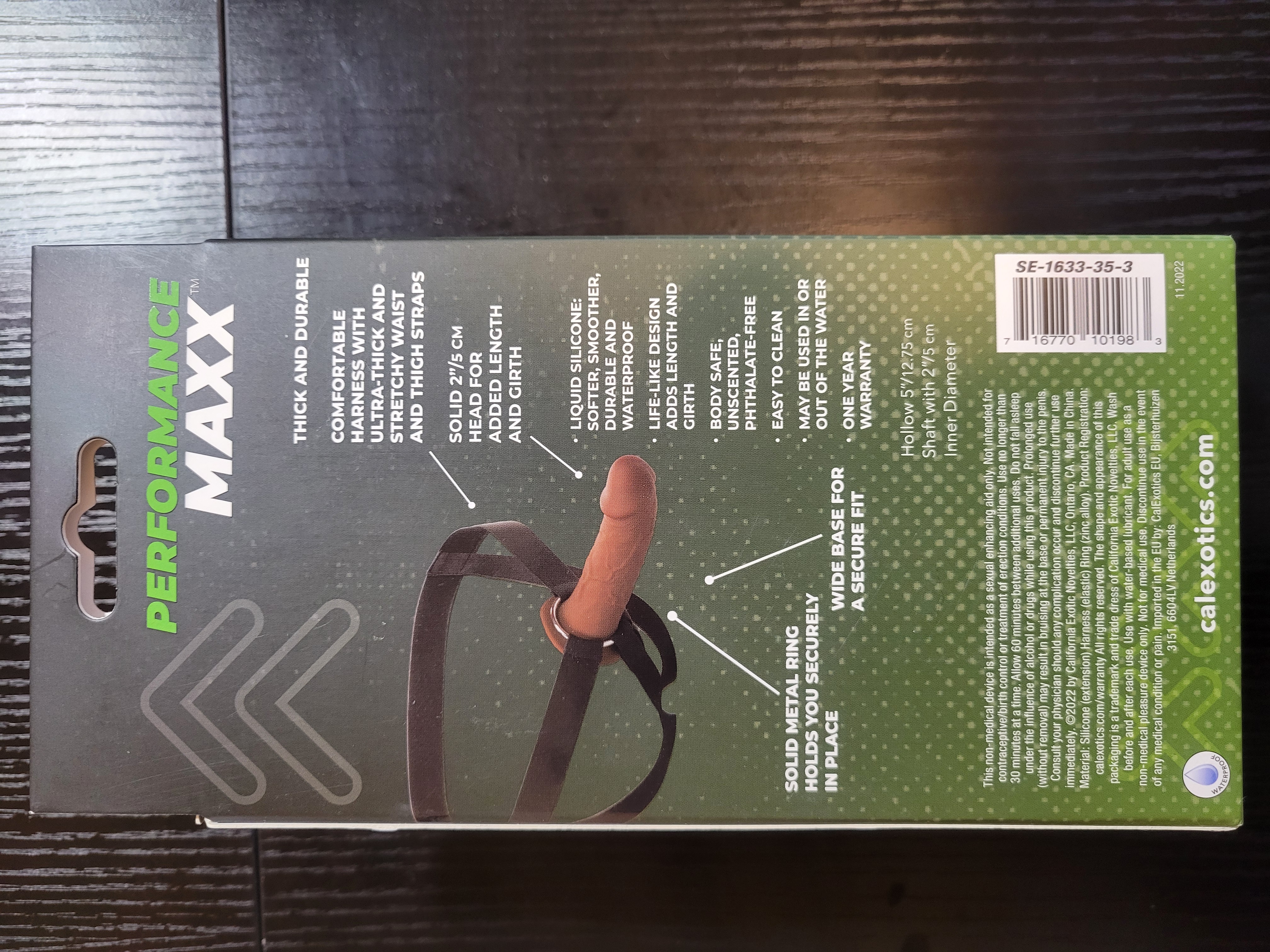 This penis extender with harness is a basic starter kit from CalExotics. This comes in two basic colours of brown and ivory and one colour for the harness. The measurement of the whole toy is 7in (17.78cm) and internally 5in (12.70cm) in length. The opening of the toy isn't very big for someone's penis. It measures to about 1.25in (3.175cm) in width and could not even fit a FTM pack and play packer. The harness was a "one size fits all" and very stretchy. The material was just a basic elastic with the jockstrap style for the harness.
