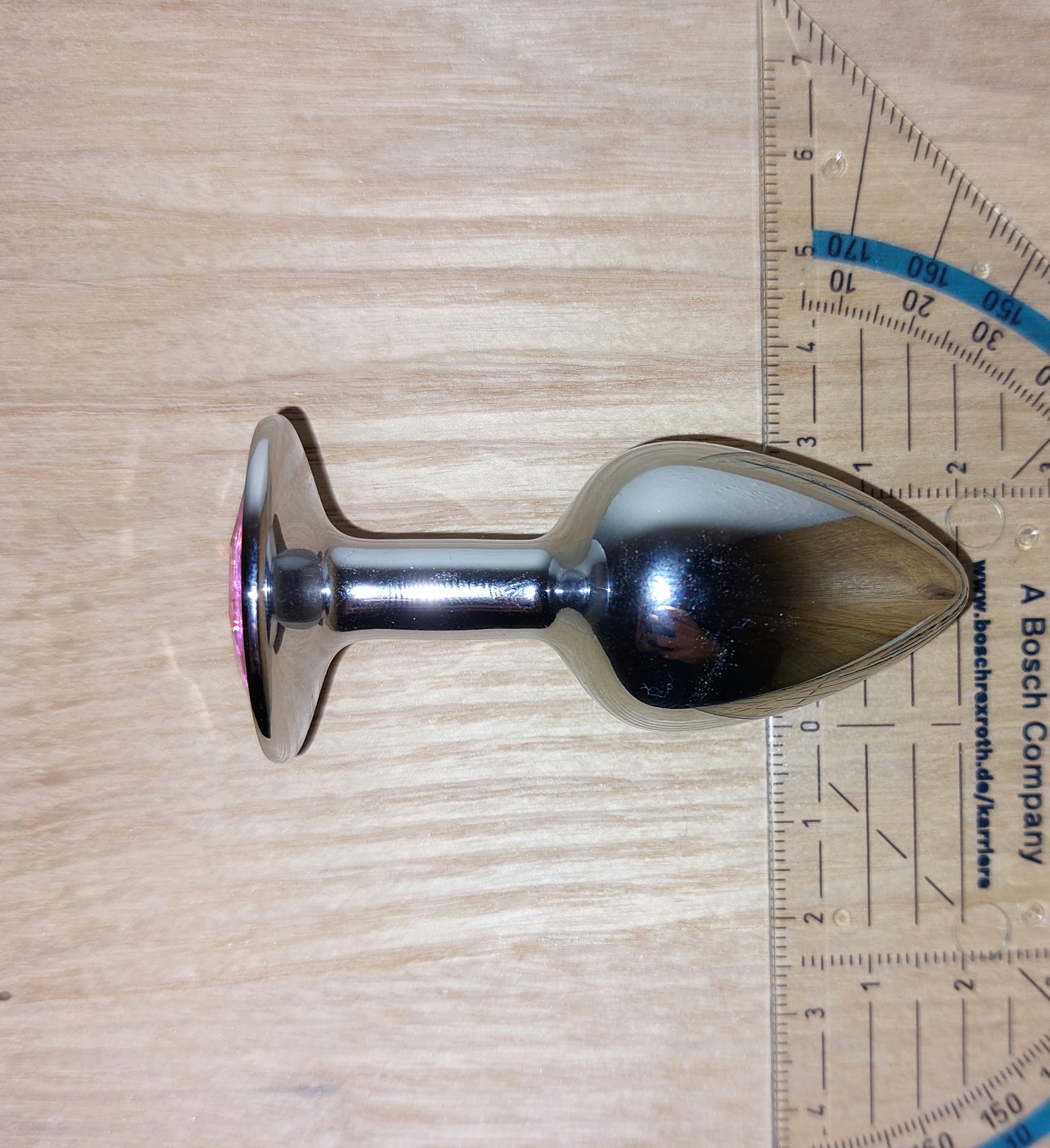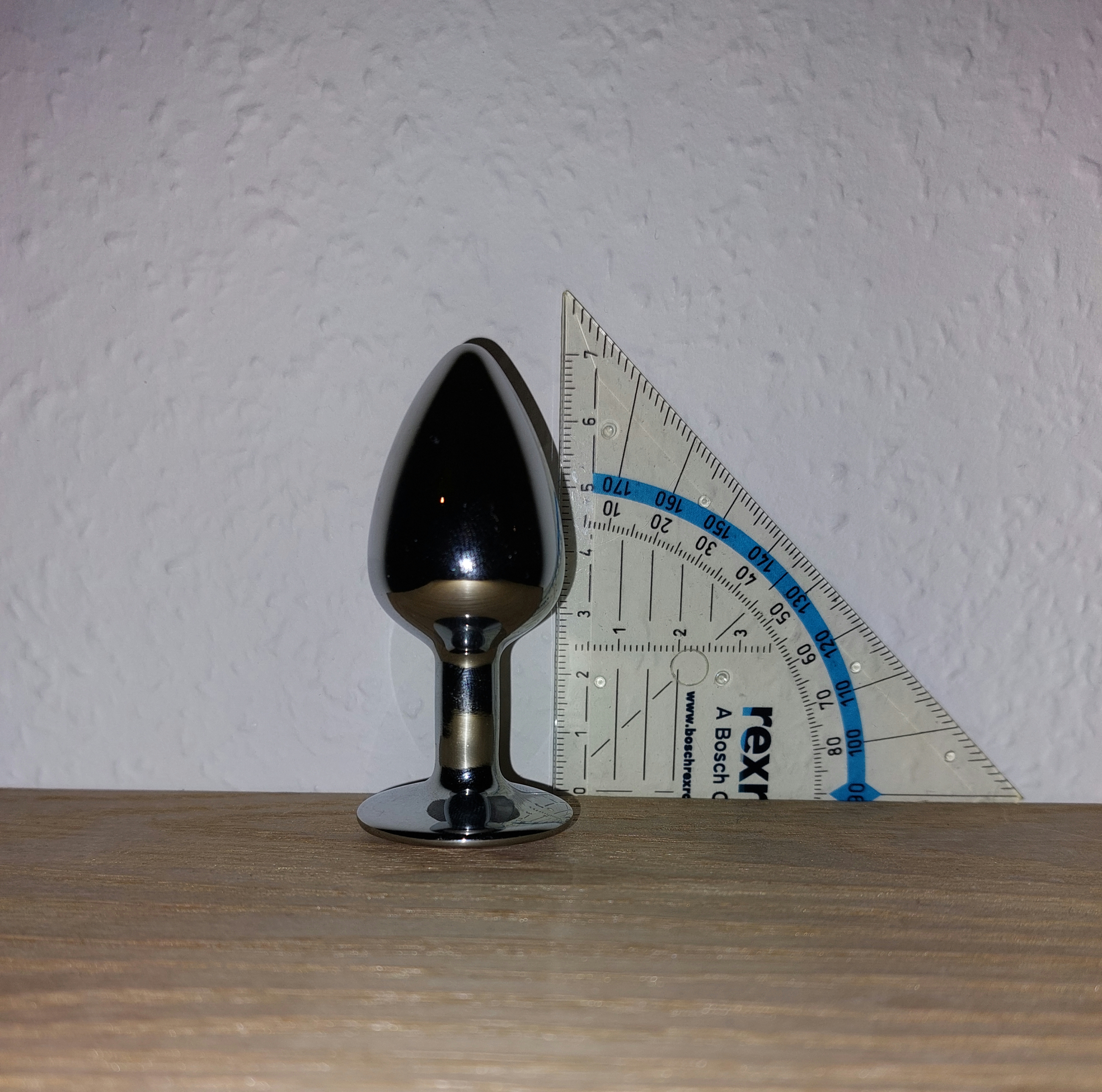 A text book example of an butt plug. Simple characteristic butt plug shape. 7cm total length (not just the part that goes inside of you). About 3cm width for both the base and the main part. Made out of aluminum and is probably empty inside, which isn't too bad because it is lighter that way which can be more comfortable if you are new to anal play. At the bottom of the base is a nice little crystal made out of acrylic. This does look kinda cute and can be a nice little surprise for your S.O. when you put it in before and wear it during your special time without telling him/her for them to discover.