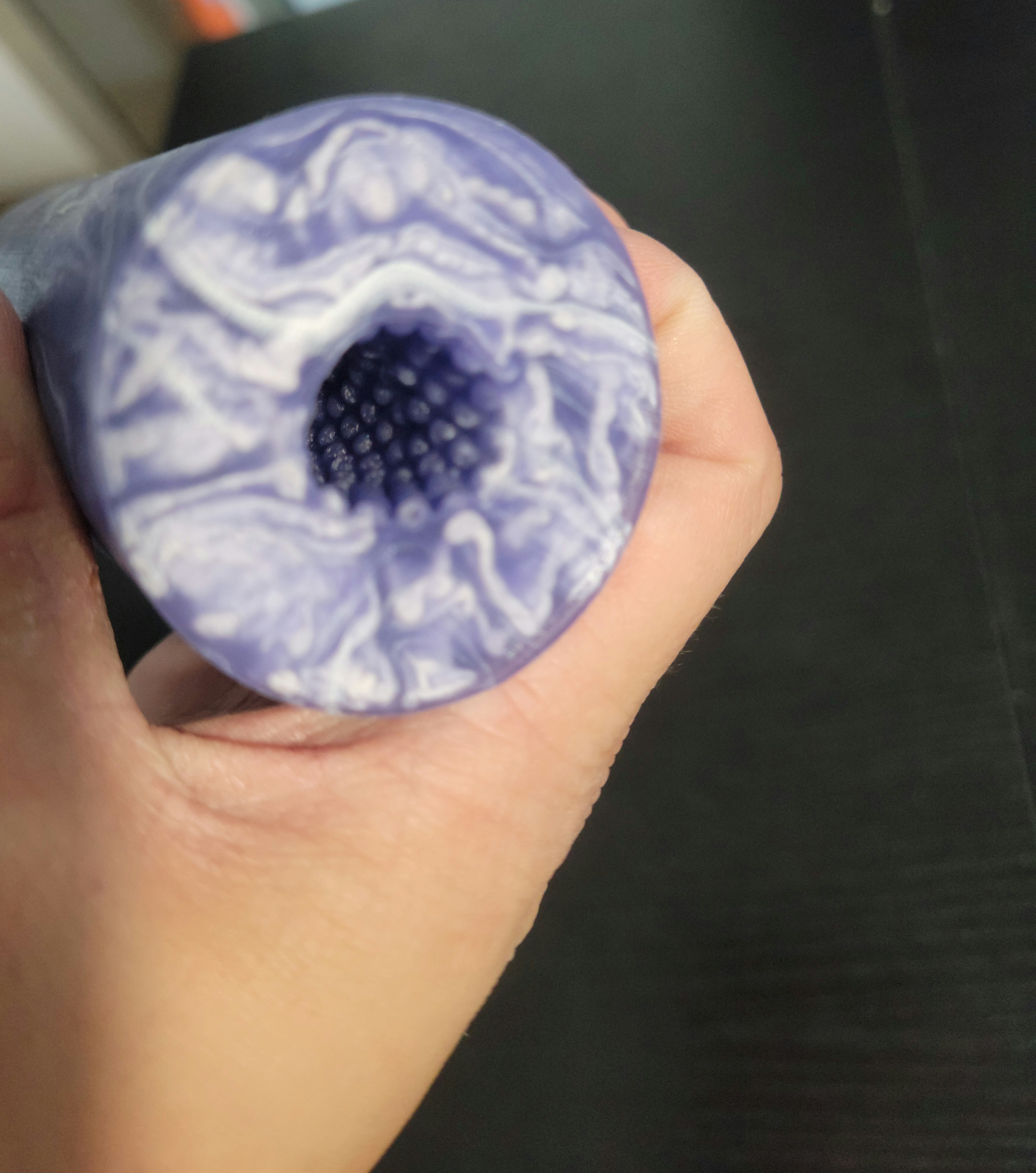 This ftm stroker called the Fascination Sleeve from Gender Cat has a very simplistic design and is very easy to use. It is made from 100% body safe silicone and is safe, even on sensitive skin. It is hand poured and has a unique marbling design on each stroker. You can choose from 14 different colors, two internal textures and three opening sizes to fit one's needs. The two internal textures come in "bumps" or ridges" and the opening sizes are 1/2in (1.25cm), 3/4in (1.8cm) and 1in (2.5cm). The opening sizes are not exact due to the product being handmade and subject to minor creation flaws. The entire toy measures from approximately 3 1/2in (8.89cm) in length to 2in (5.08cm) in width. This makes it very easy to store. I also find the shape very subtle and easy to blend in, if it is accidentally left on table.