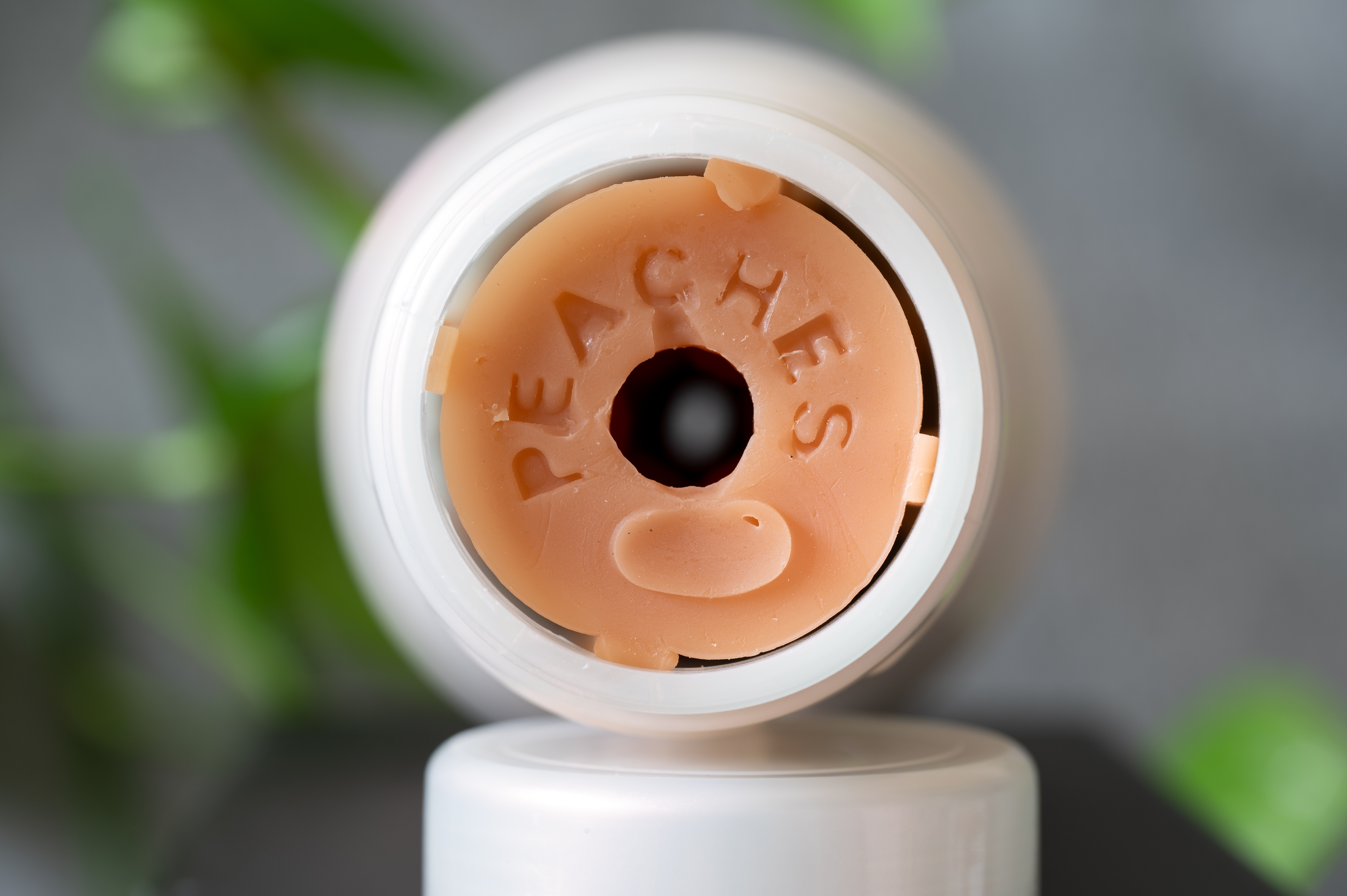 The underside is engraved with “Peaches,” and as always, you’ve got two end caps – one for storage, one for suction. Classic setup, no surprises here.