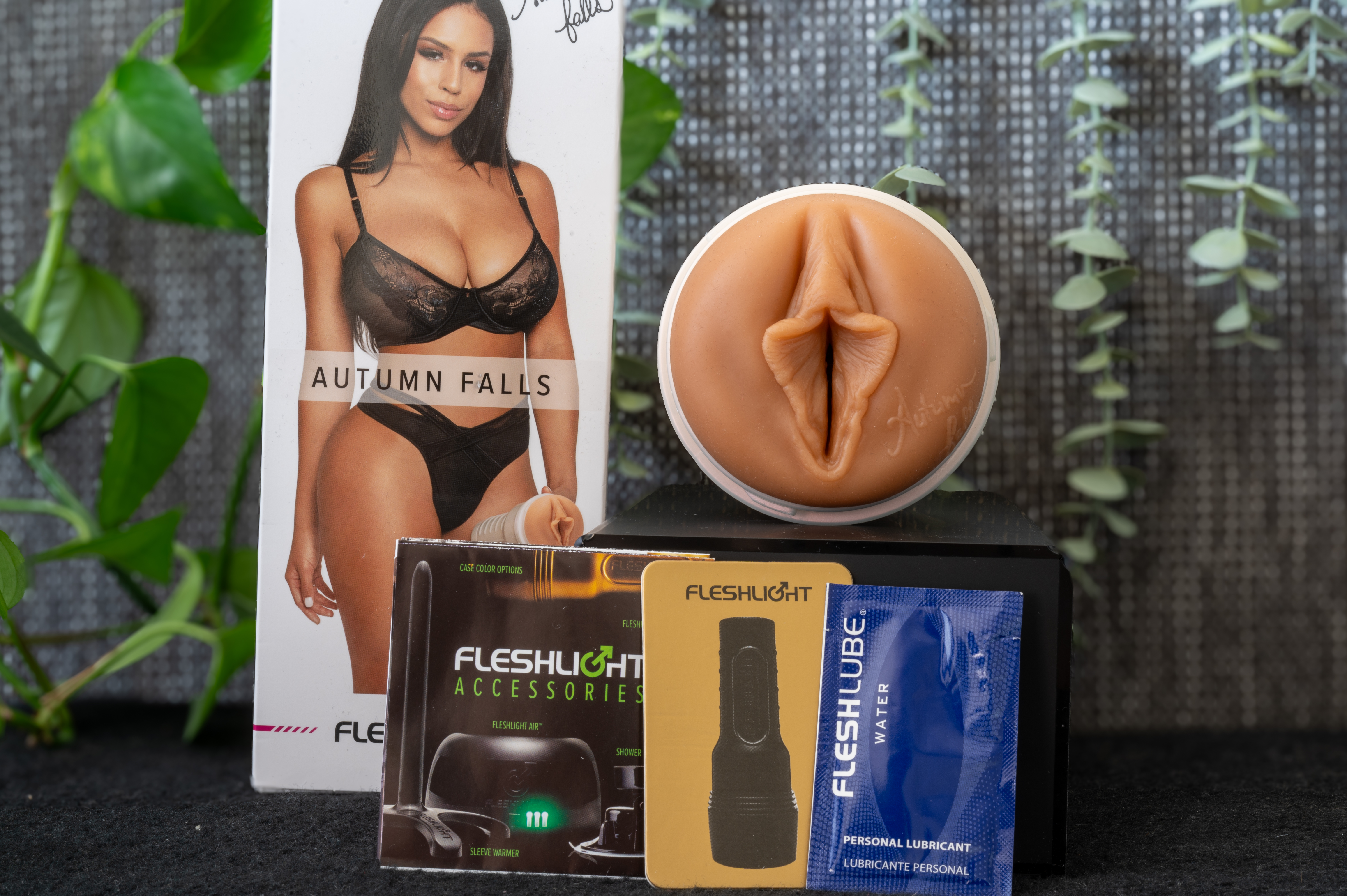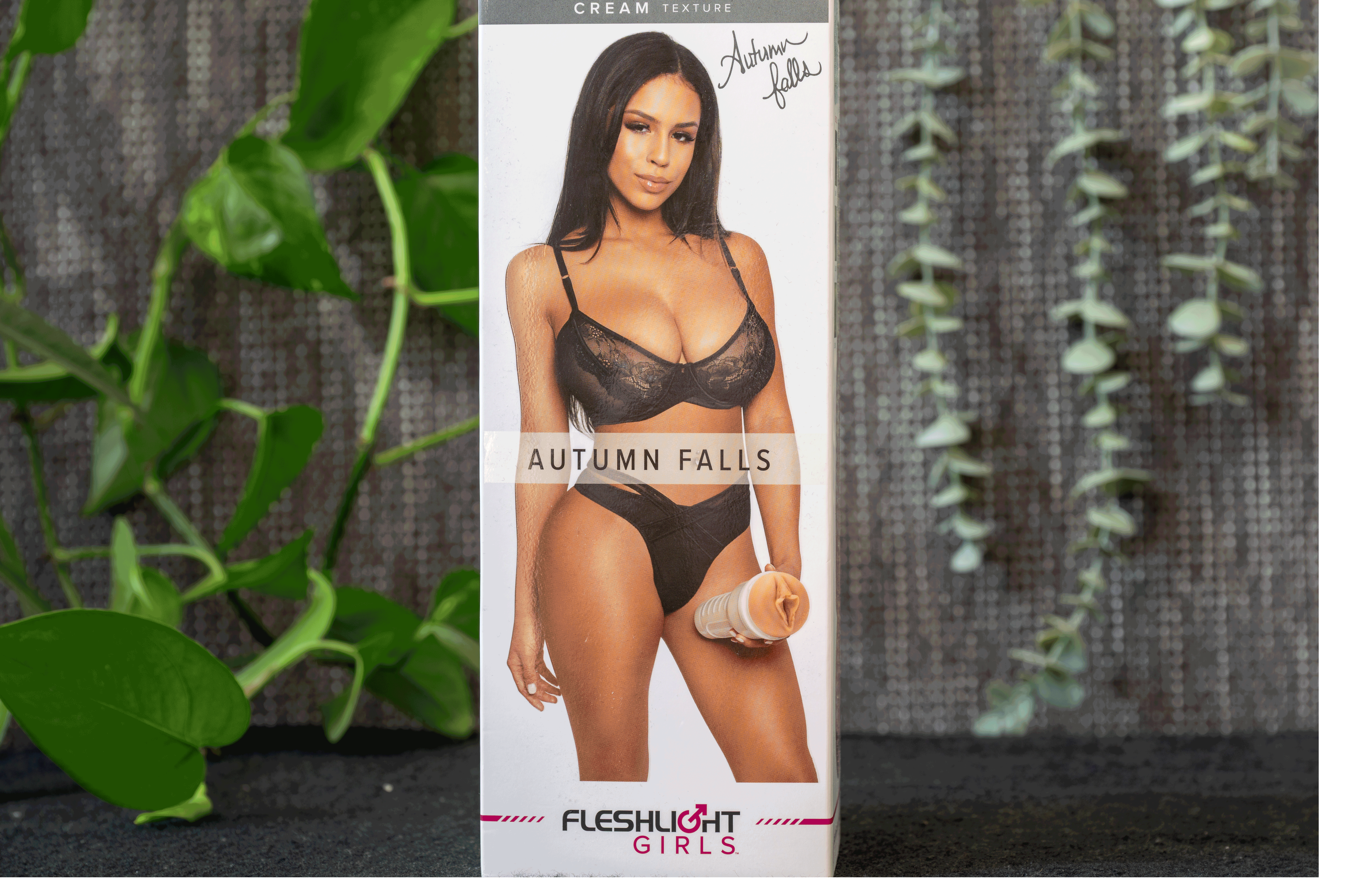 Front of the box: Autumn Falls takes center stage in all-black lingerie, holding her Fleshlight case like she knows exactly what you’re about to do with it. Her name is printed cleanly across the center, and her signature sits in the top right. It's bold, suggestive, and just classy enough not to feel tacky.