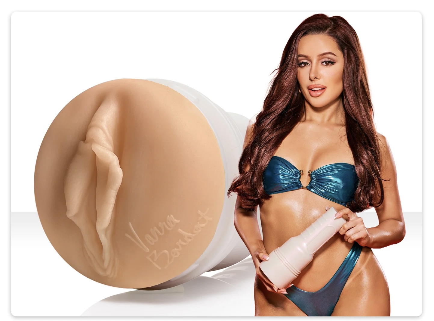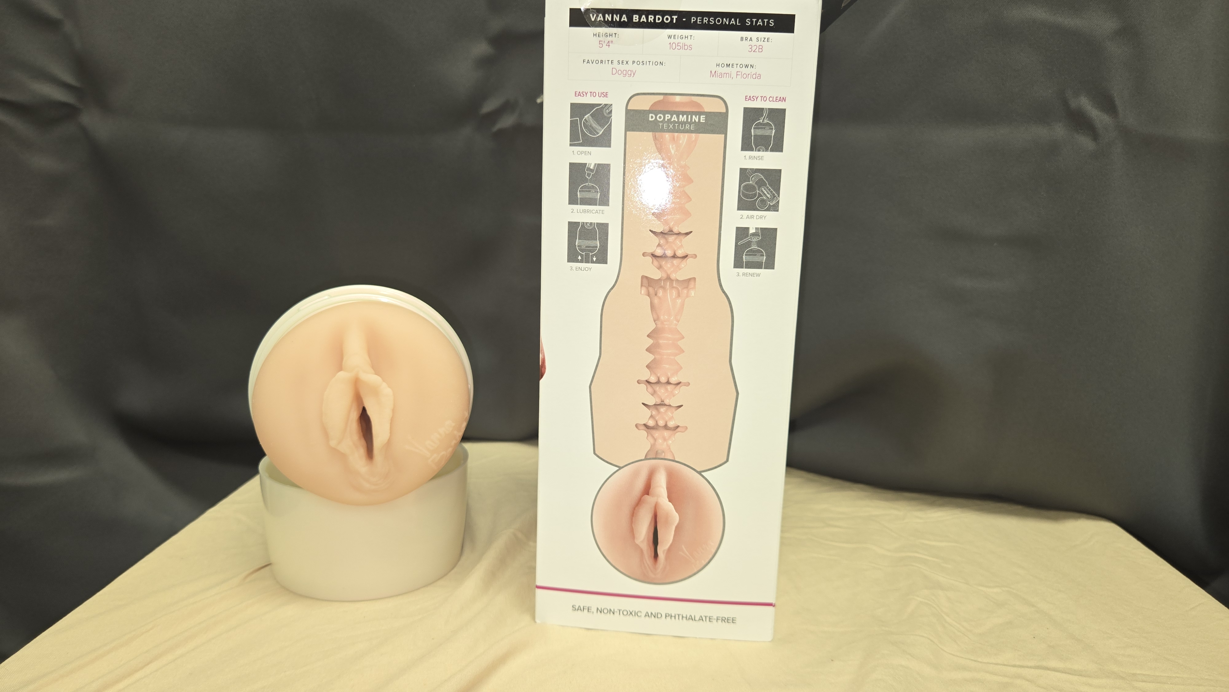 The packaging for the Vanna Bardot Fleshlight follows Fleshlight’s signature style, and that’s a good thing. On the front, you’ve got a high-quality photo of Vanna herself, modeling confidently next to a shot of the toy, giving you a clear preview of what you’re working with. One side of the box highlights the pearl white case, while the other showcases compatible accessories like the Sleeve Warmer or Launch device—great for those looking to level up their setup.Flip the box around and you’ll find a detailed cross-section of the Dopamine texture, breaking down the sleeve’s inner design with clear diagrams on what kind of sensations to expect. Inside, everything is neatly secured: the Fleshlight is held in place by a molded cardboard insert, and you’ll also find a sample packet of lube and a user guide to get you started. Overall, the packaging is clean, visually appealing, and clearly aimed at enthusiasts who care about both form and function.