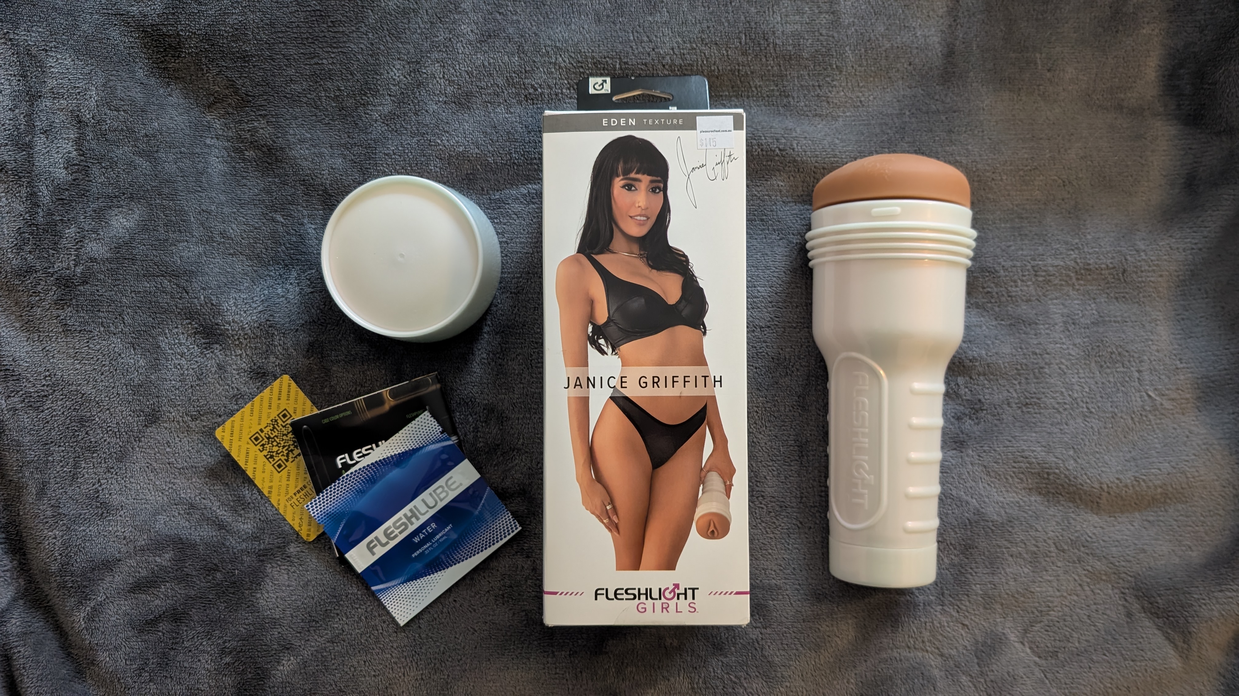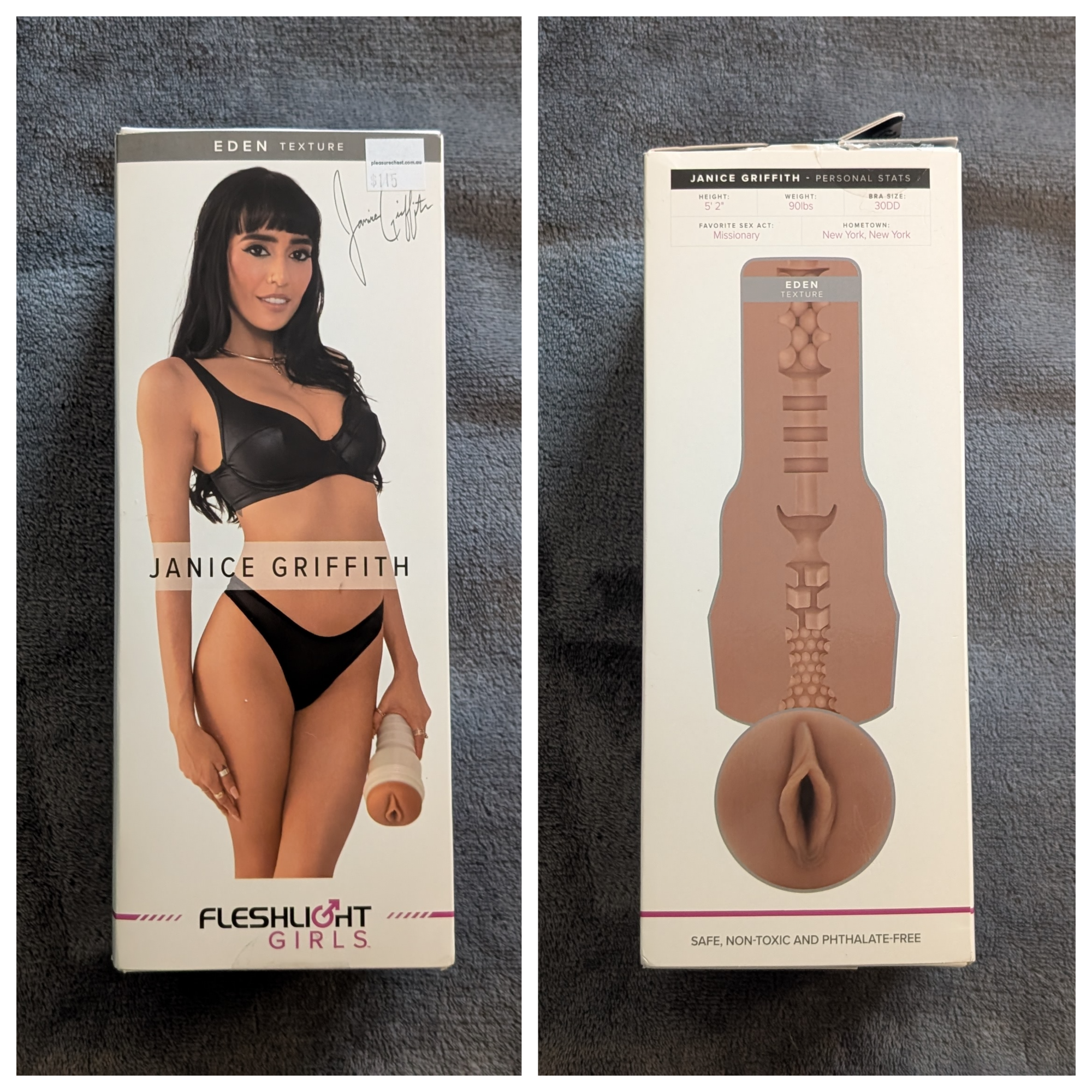 The box for the Janice Griffith Fleshlight is pretty standard for the Fleshlight Girls range—and honestly, there's nothing wrong with that. On the front, you're greeted by Janice’s tight, sweet body (my god she’s hot). One side shows a cutaway of the internal sleeve texture, while the back and opposite side highlight the exterior details and available accessories. Inside the box, you’ll also find a plaque and a sample sachet of lube to get you started.