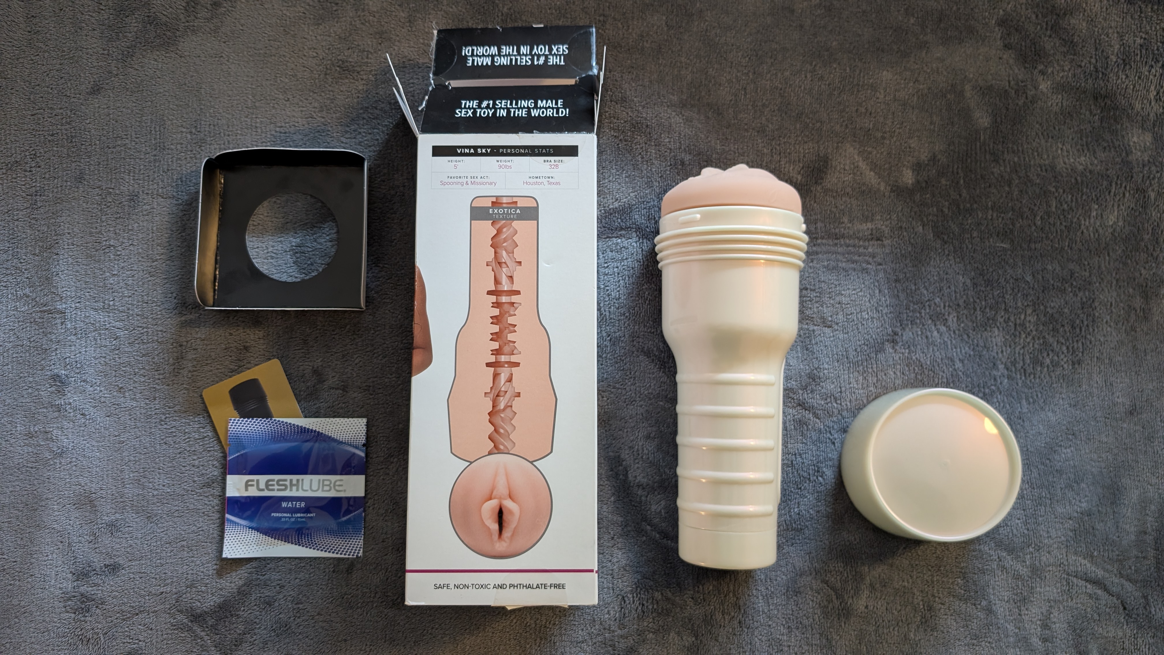 The box for the Vina Sky Fleshlight is pretty simple and inoffensive. On the front you're met with the photo of the pornstar herself, one panel is basic with the the Fleshlight shape profile, and the other two show off the detail of the sleeve and available accessories. There's also a little plaque and a sample sachet of lube. Overall nothing amazing, but it is nicely designed.