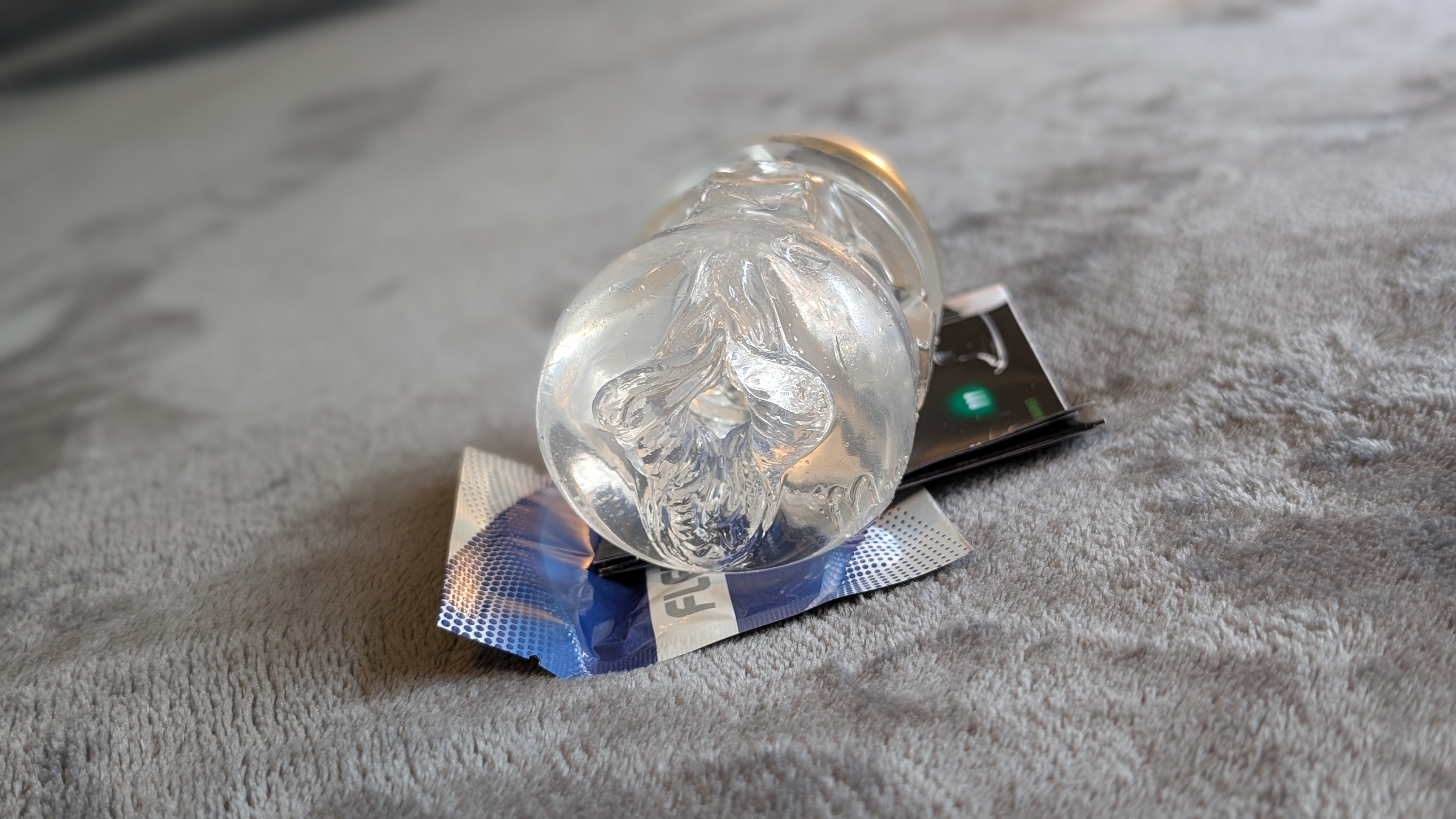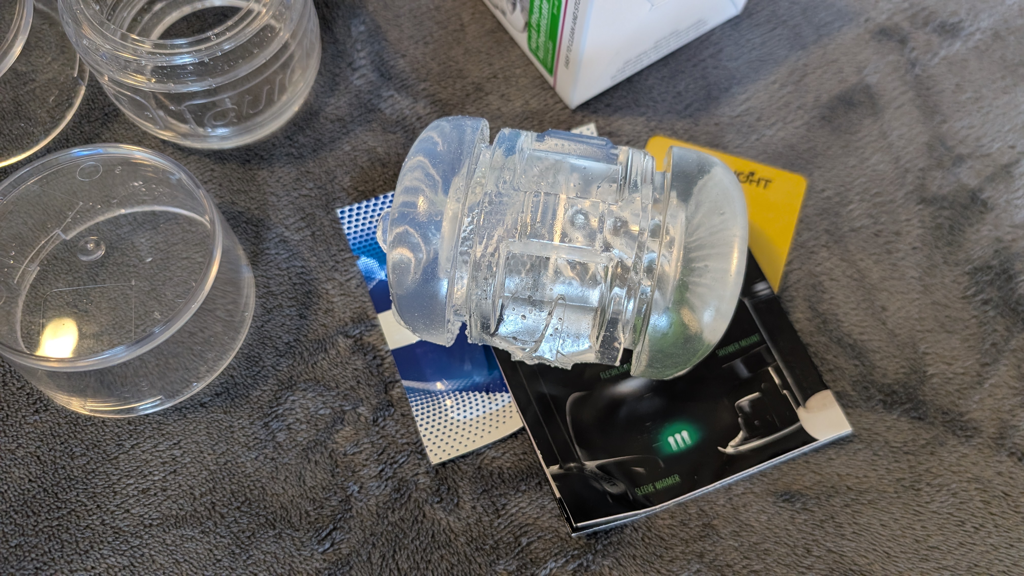 The material is somehow stickier than the standard Fleshlight material and without adding some powder to the outside immediately after cleaning it manages to pick up every stray piece of lint that may be lying around. It's not a deal breaker but it is something that I found a little annoying. It also removed the glacier clear finish which is a bit of a bummer.