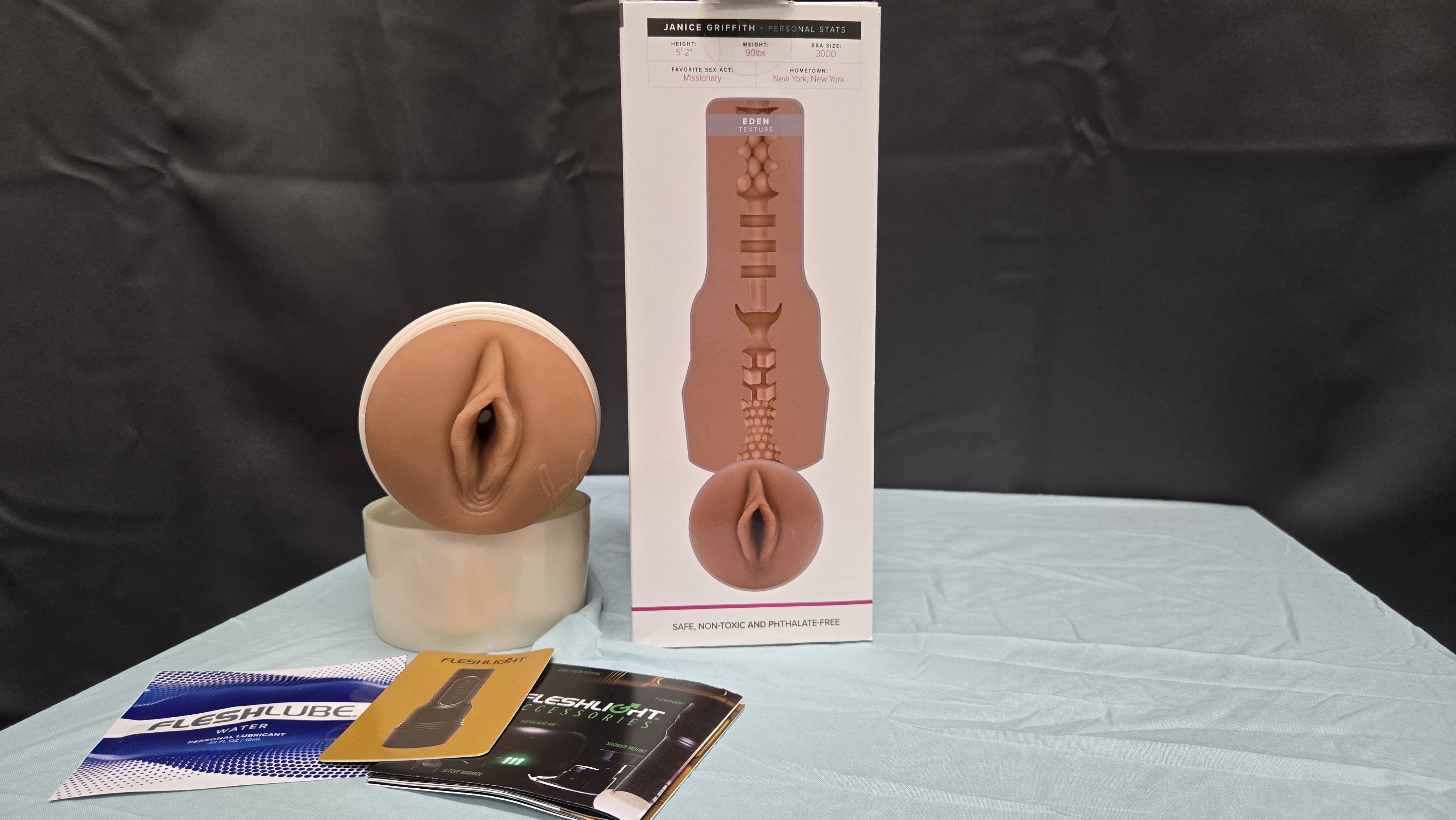 The packaging on the Janice Griffith Eden Fleshlight hits that perfect middle ground between classy and sexy-as-hell. You get the classic tall rectangular box that Fleshlight fans know all too well—clean white background with Janice Griffith herself modeling front and center, looking like a straight-up goddess and showing off the goods. Flip it around and boom: you’ve got a full cross-section of the internal texture printed on the back, so you can start mentally preparing for the ride before you even crack it open. Sides of the box are all about the accessories, branding, and some generic info—but hey, you’re not buying this for the fine print.
