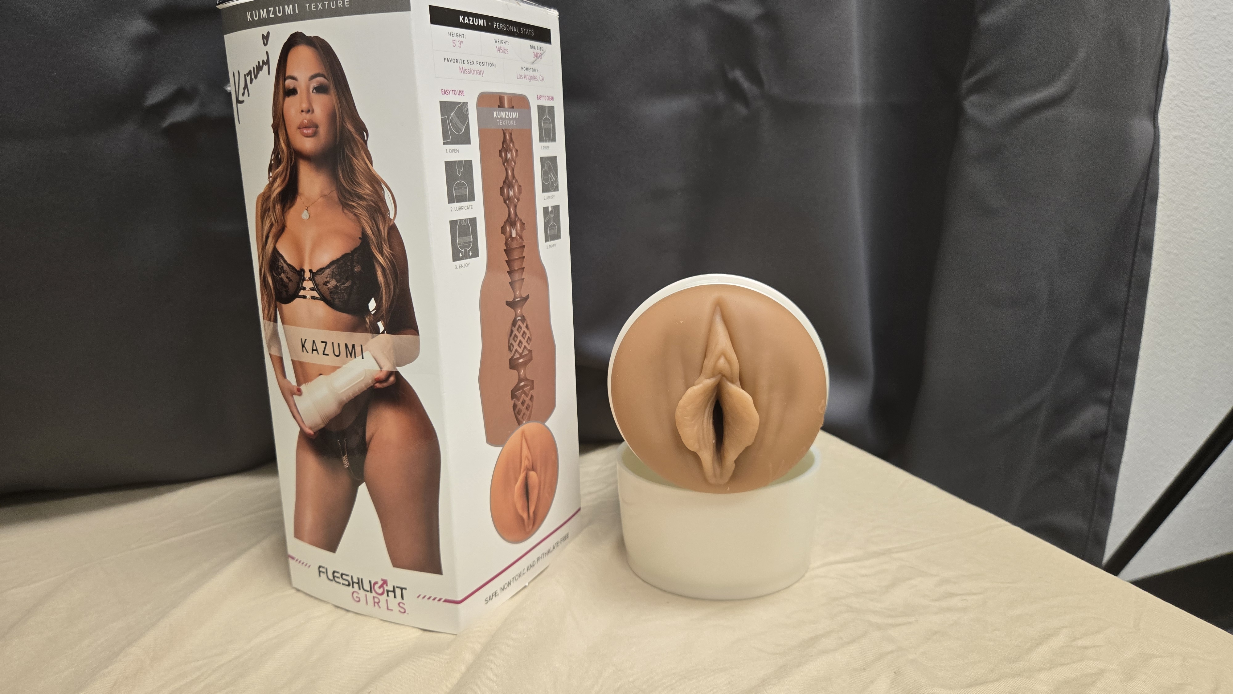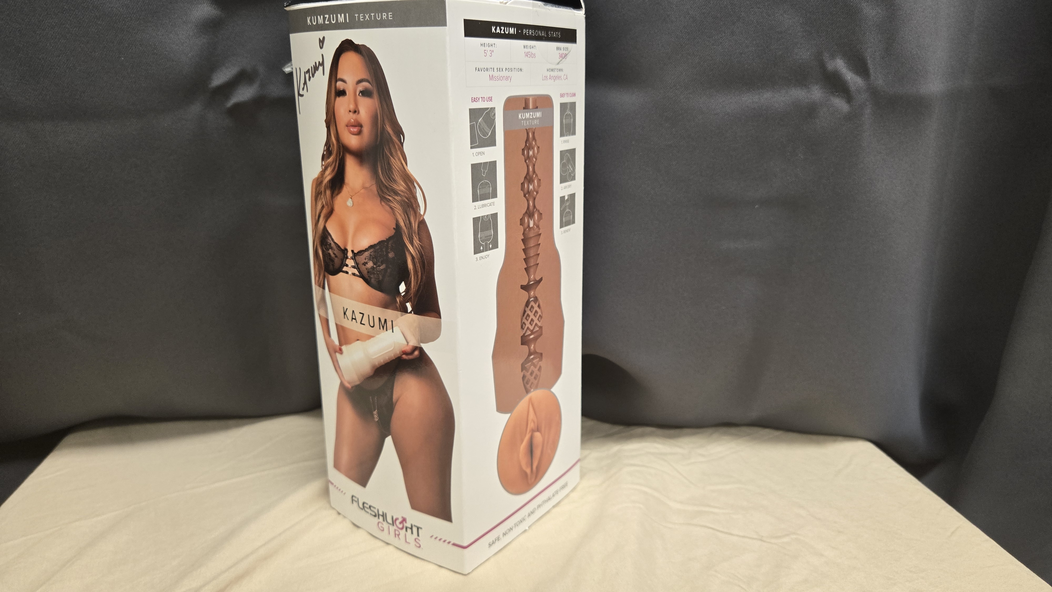 The packaging for Kazumi’s Fleshlight is seriously slick and got me hyped right out of the gate. Front and center, you’ve got Kazumi looking absolutely stunning, showing off her signature curves right next to the toy—instant fan service, no question. Flip the box around and boom, there’s a detailed cross-section of the sleeve’s interior texture that totally amps up the anticipation. One side flexes the included accessories, while the other shows off the sturdy, sleek case you get to keep it all protected and ready to roll. Honestly, it’s the kind of packaging that makes you want to unbox it ASAP and dive right in. Everything about it screams premium and exclusive, and it definitely delivers that collector’s vibe.
