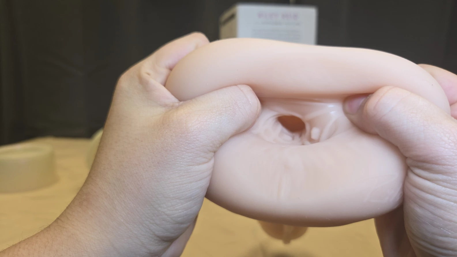 Ah yes, the classic Fleshlight design—white pearlescent case, main cap, end cap for suction control… you know the drill. Nothing groundbreaking there, but let’s be real, we’re not here for the case. Pop that main cap off, and boom! you’re greeted by Riley’s meticulously molded backdoor, and let me tell you, it’s got some serious visual appeal. Unlike a lot of other anal Fleshlights I’ve tried, this one has a slightly more gaping look, which just adds to the realism. The crinkled detailing? Chef’s kiss. And the perineum is sculpted in there too, which, honestly, is a nice touch.