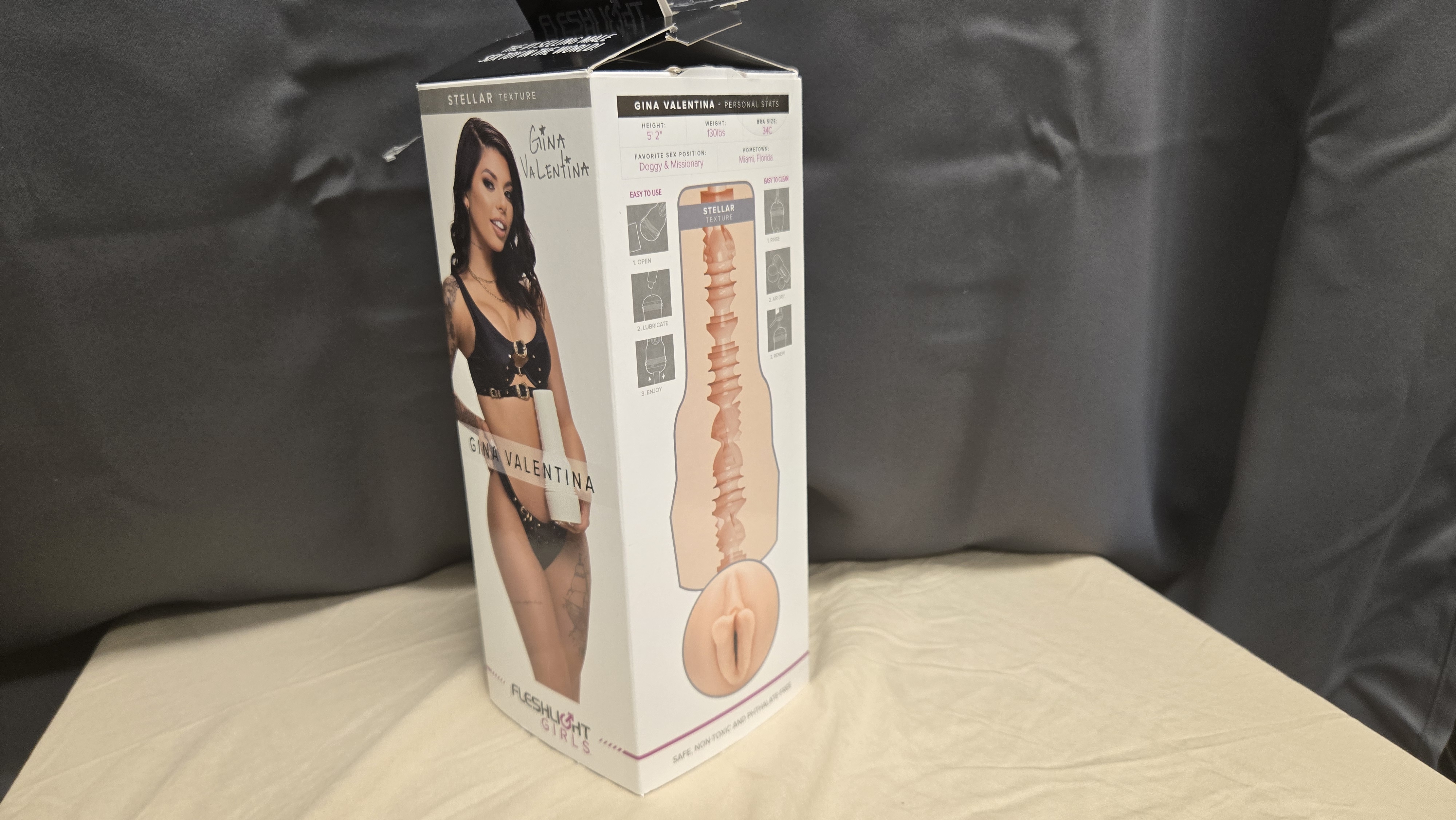 Packaging-wise, Fleshlight keeps it sleek and straightforward with the Stellar. You get the classic pearlescent white case wrapped in a box that puts Gina Valentina front and center—her signature smile and curves practically jump off the package, making it clear who you’re dealing with. On the back, there’s a detailed cross-section showing off the internal texture, so you know exactly what kind of ride you’re in for before even cracking it open. One side highlights the included accessories, like the shower mount and heating/drying rods, while the other side showcases the case itself, emphasizing its solid build and discreet design. Inside, the sleeve is snug in its molded holder, keeping everything secure and ready to go. Overall, the packaging nails the balance of looking premium without over-the-top flash, just like the product inside.