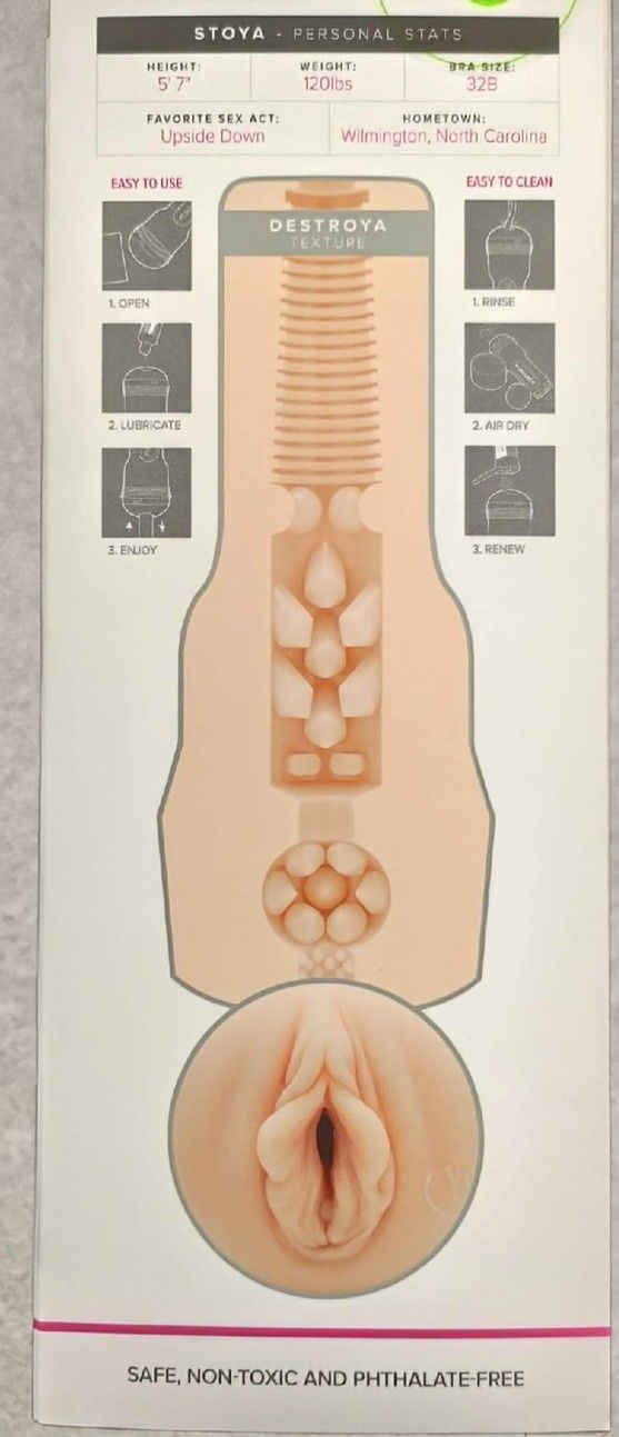 The Stoya "Destroya" packaging follows the standard Fleshlight format. The front features an image of Stoya, while the box displays product views, internal texture details, biographical information, and other available accessories. The package includes standard items: a VIP card, lubricant packet, and instruction manual.