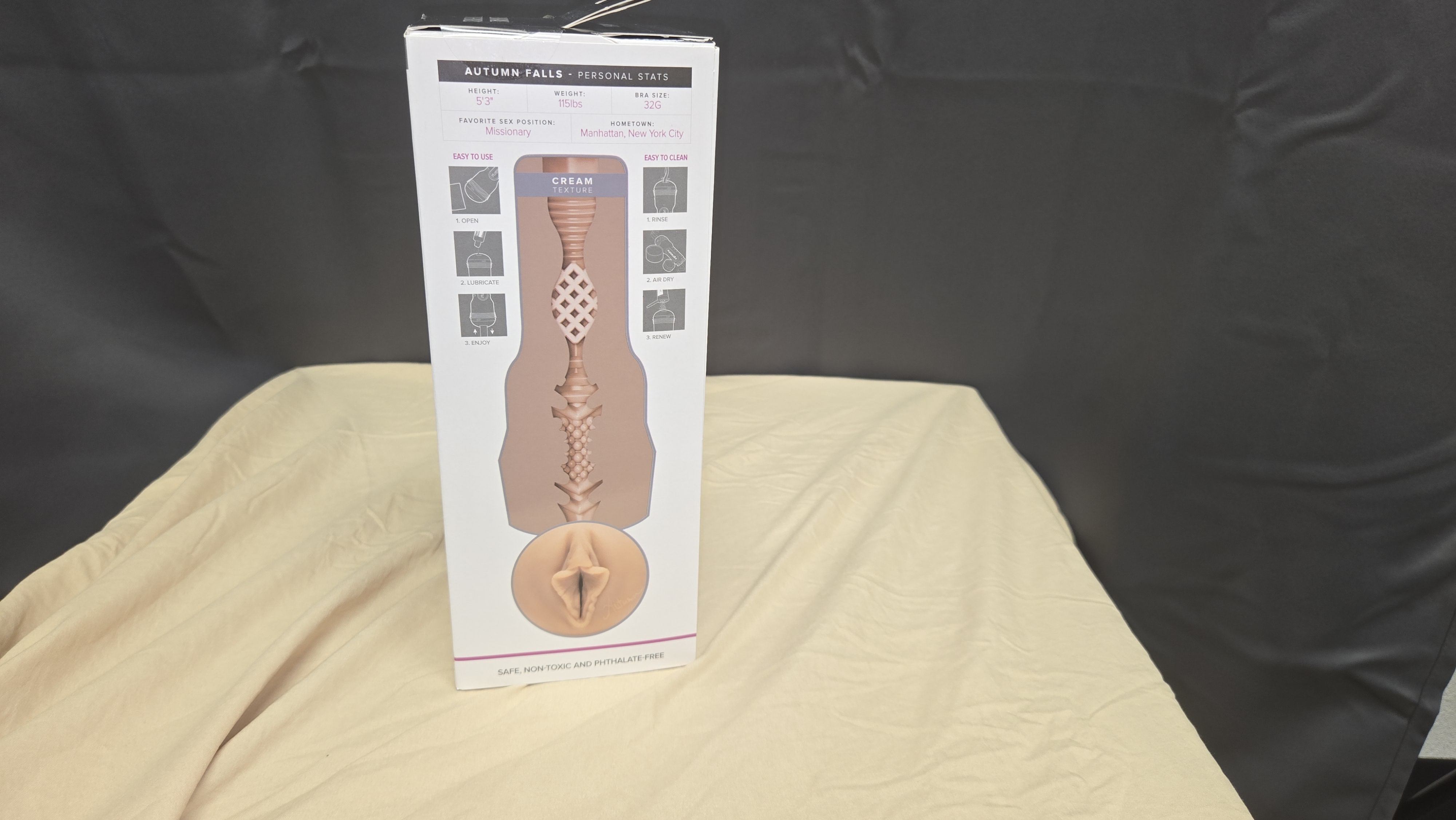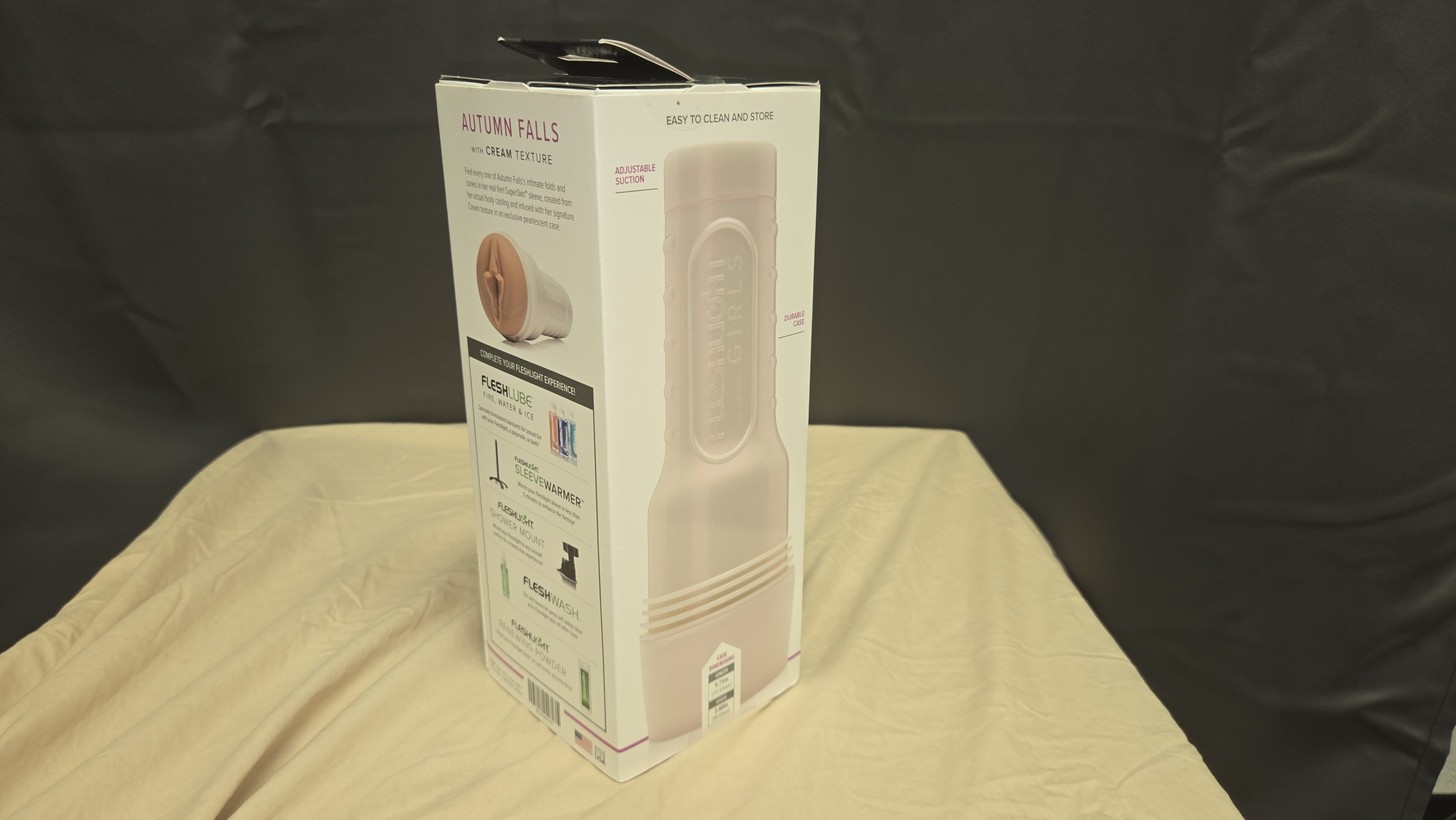 The Autumn Falls Cream arrives in the familiar Fleshlight packaging that is sleek, functional, and unmistakably on-brand. The front features a sultry glam shot of Autumn herself, proudly showing off her assets alongside her toy. Around back, you’ll find a detailed cross-section of the internal sleeve texture, giving you a preview of what you’re about to dive into (literally). One side of the box highlights compatible accessories, while the other shows off the case design.