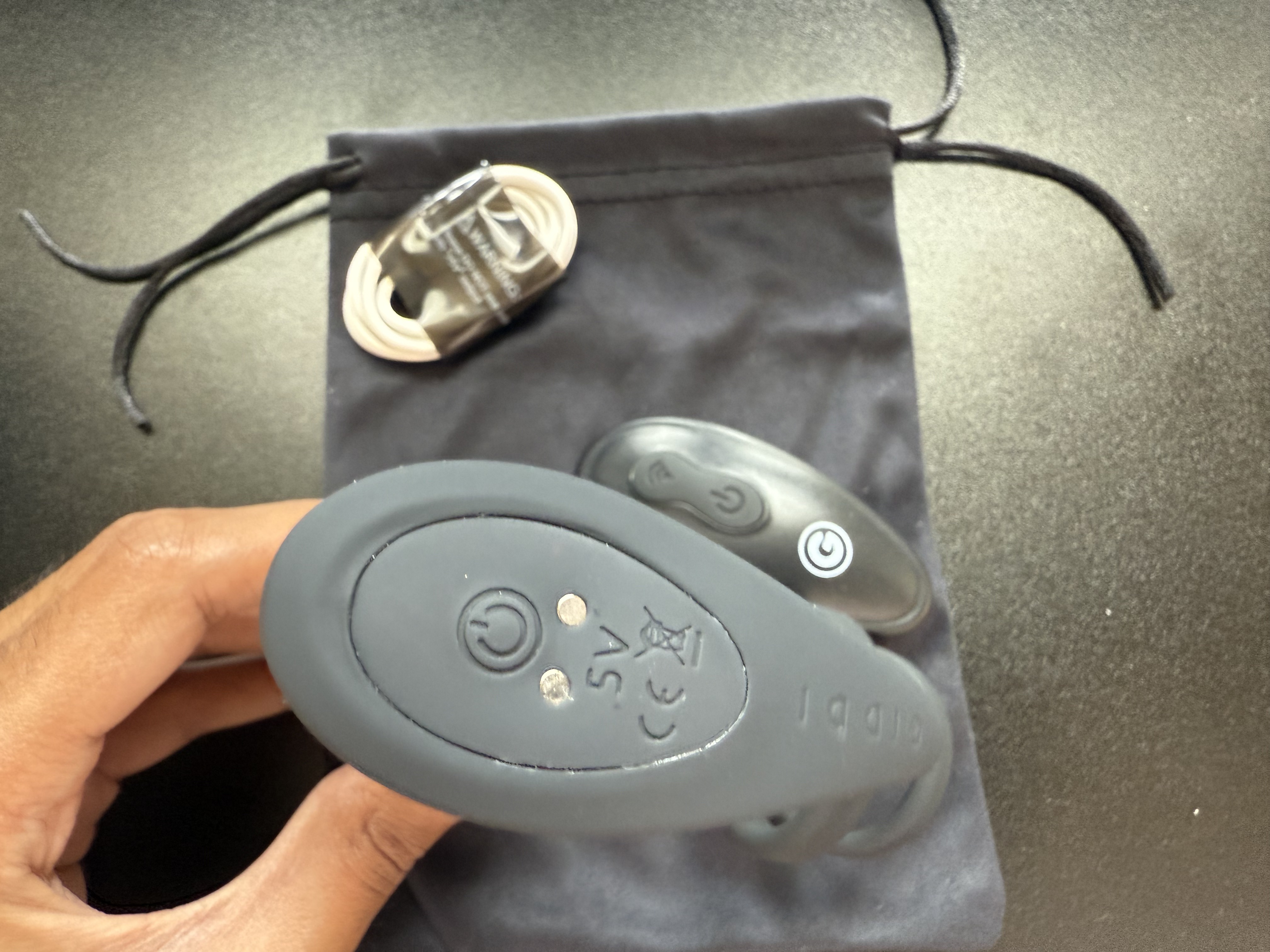 The design of this quite bold, despite being entirely made of soft touch black silicone. The body of the prostate massager is almost banana shaped and fairly thick especially considering it's 1.1 inches wide and almost uniform throughout the ~4 inch insertable section. At the bottom there's a flexible tapered base with a tail that connects it to the cock and ball rings. Under the base of the toy there's a a power button, and the metal charging contacts. There's also an included remote which is made mostly of black plastic with the Giddi logo and rubber power and pattern changing buttons. It has a curved ergonomic design though it was a little small for my hands.