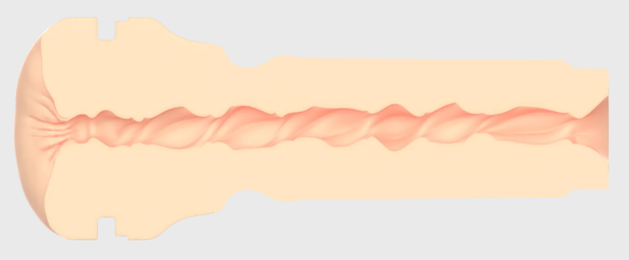 The inside is one long chamber, no “roomy zones” or multiple stages like Fleshlight does. Instead, it’s a spiral of ridges and twisted waves, which gives it a constant grip. It’s designed to feel lifelike, snug, and intense – not to surprise you with five different textures along the way.