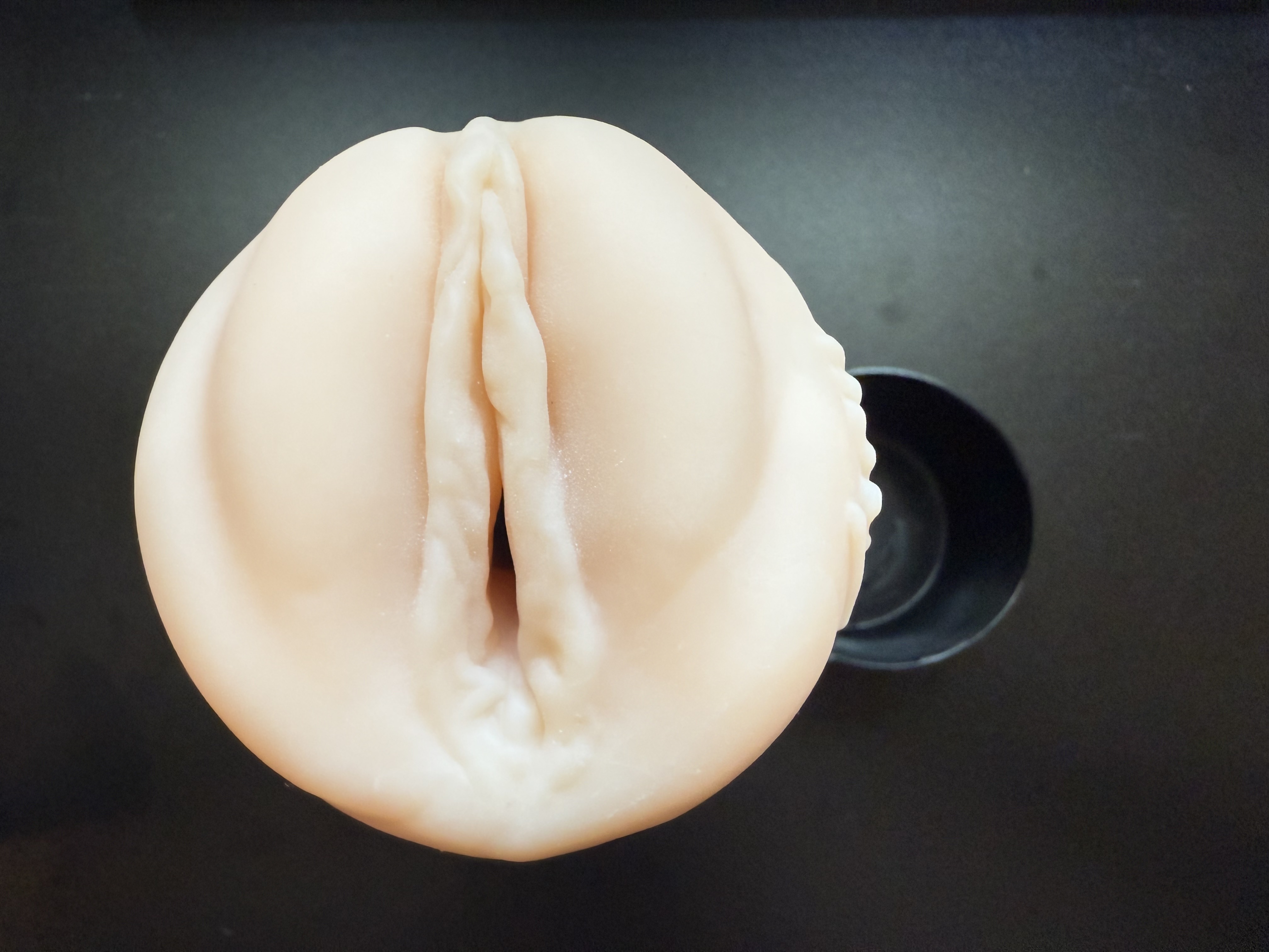 The overall design is quite simple, just a plain black plastic casing with removable caps at either end. The larger top case just pulls off, while the smaller bottom cap unscrews and is used to adjust suction during use. The case itself slims down quite a bit after the top section which makes it much easier to hold than competitors like Fleshlights. I wouldn't call the whole toy discreet at all, but it is simple and smaller than other options which makes it just slightly easier to hide away or travel with. Once you take off the top cap it reveals the realistic vagina opening that is molded after Lacy Lennon, with her embossed signature on the side. As a fan of her work, I have to say the design is really nice, with puffy outer lips and her clitoral hood on display. The actual opening stays just slightly open also which make it even more inviting.
