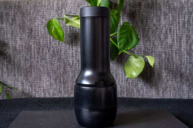 You’re looking at the classic Kiiroo design. The case is made of black ABS/PC plastic with two caps – the protective entrance cover you pop off with a little pressure, and the twist cap at the base to regulate suction. Solid, no-nonsense, and instantly recognizable as part of the FeelStar line.