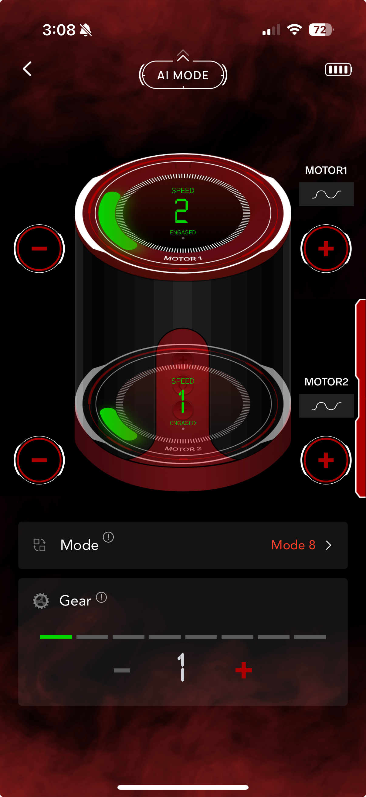 Now onto the actual vibrations! There are two vibration motors spaced equally on the interior of the device and you can feel the round contact plates under the silicone easily with your fingers. My initial impression was that the motors were a little weak, but as you ramp up the speed they can actually get pretty intense. You can switch patterns with the button on the device itself, but the app functionality is where you can customize things a lot more. The app doesn't have nearly as much customizability as other toy maker's offerings, but it's still decent and there are some very unique features instead. You can independently control both motors patterns and speed/strength, or have them paired and use the pre-made combo patterns. The best feature for me was actually the AI mode where the sensor data from the toy is (securely) sent back to the app and it can actually respond to your movements, whether that is stroking or kegels. It dynamically changes the vibration strength and speed in response which makes for a very interesting experience. I also found that this ramped up the vibration intensity compared to other patterns and really increased stimulation. Personally that was my favorite feature.