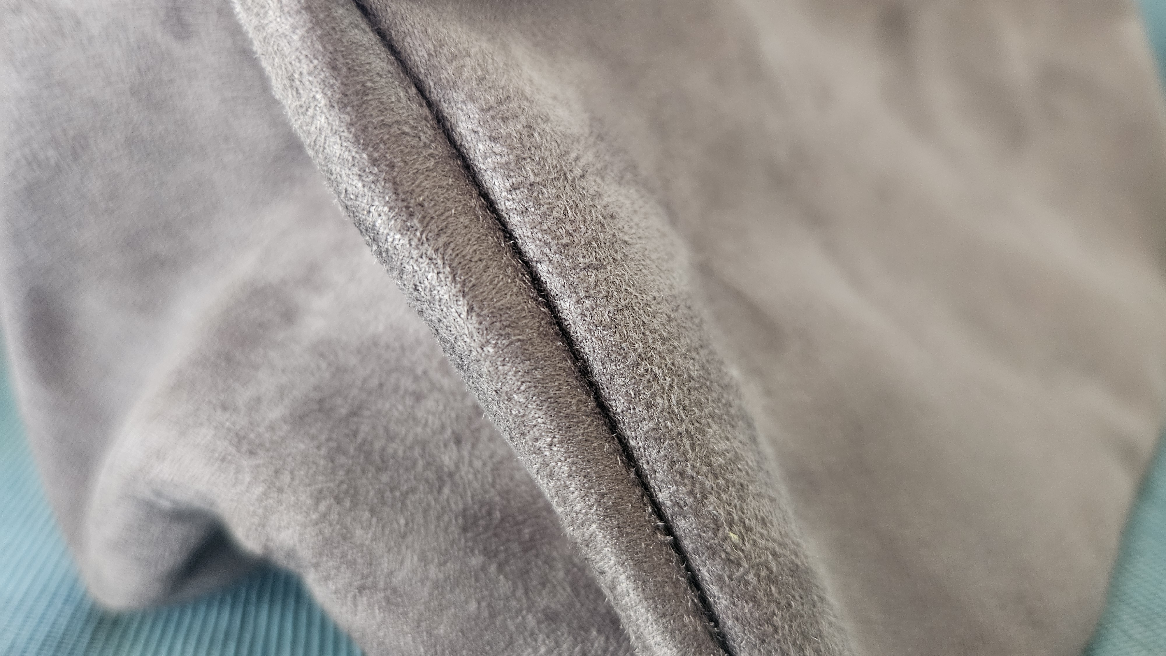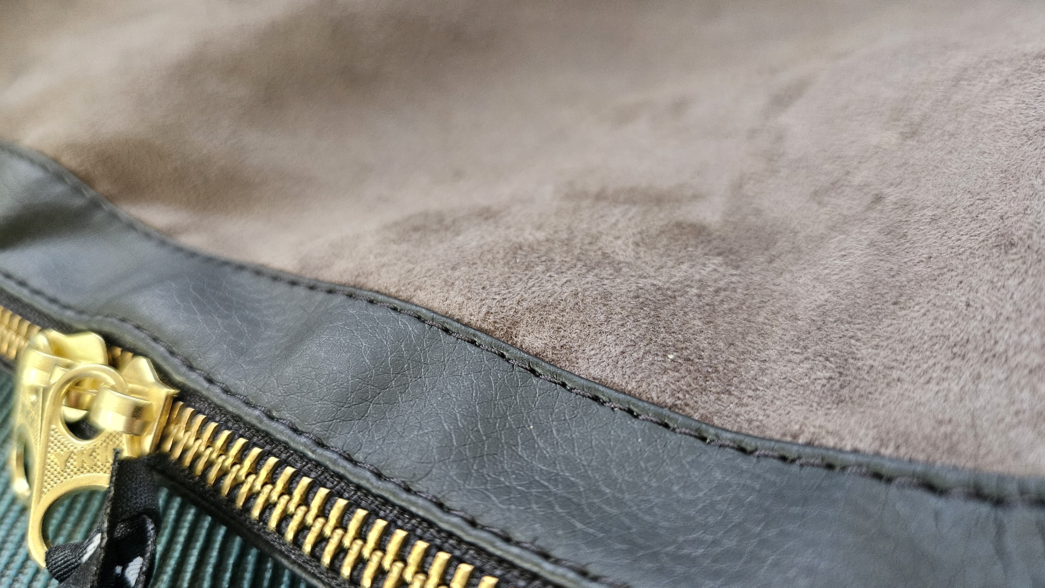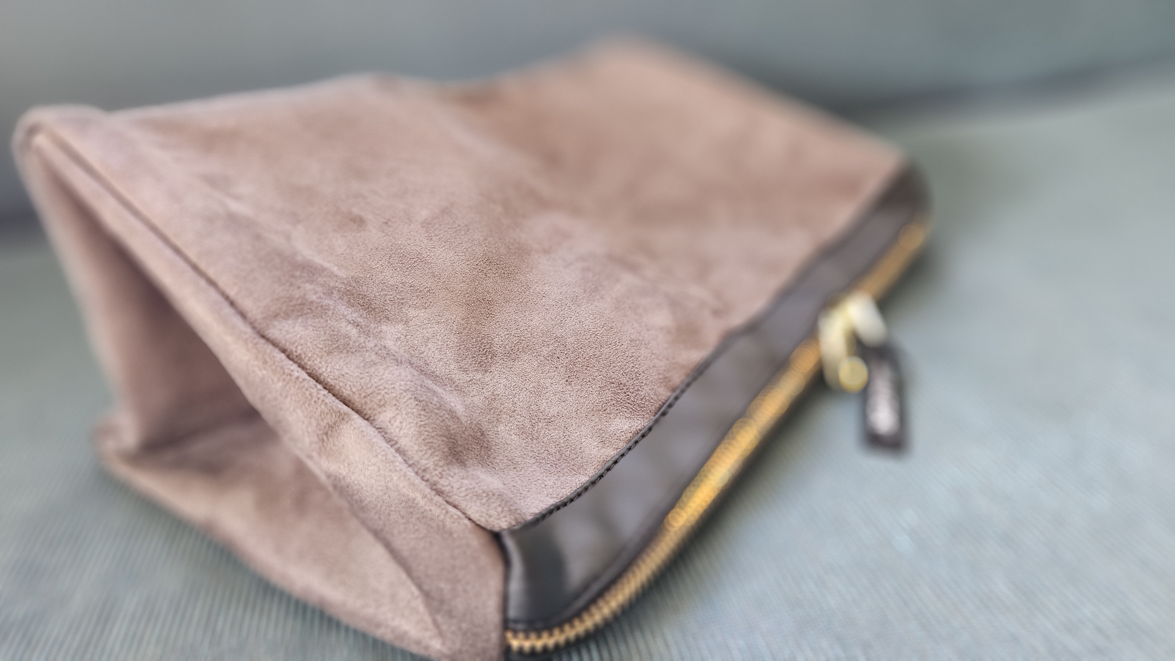- High-end materials & build - microsuede exterior, faux leather trim & solid brass zipper