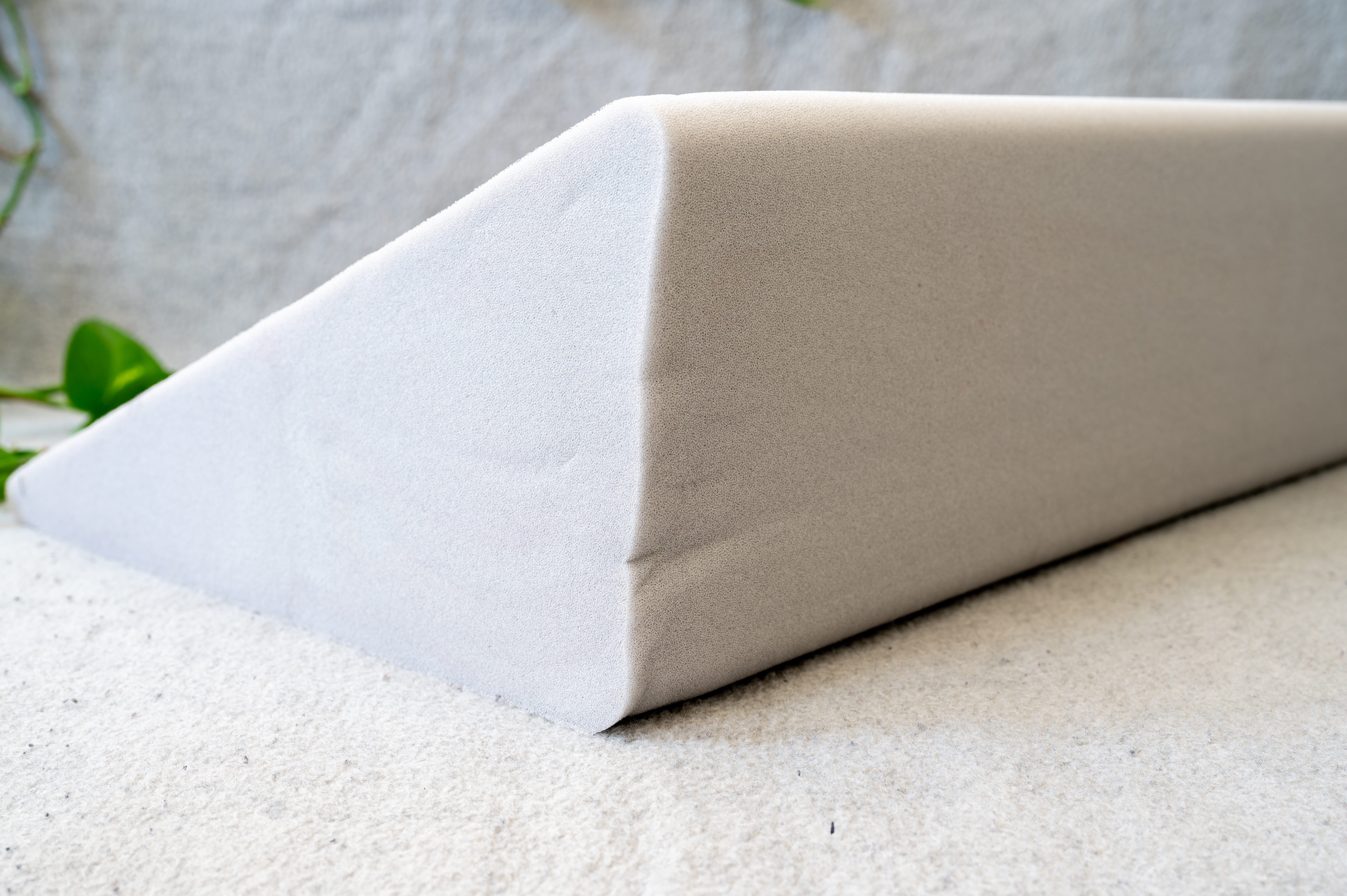 It's a triangular support pillow – dense inside, soft and plush on the outside. It’s designed to lift your hips, your back, your knees – wherever you need a boost. It’s not big or bulky, but it gives just the right amount of lift to completely change the angle (and yeah, the sensation 😉).