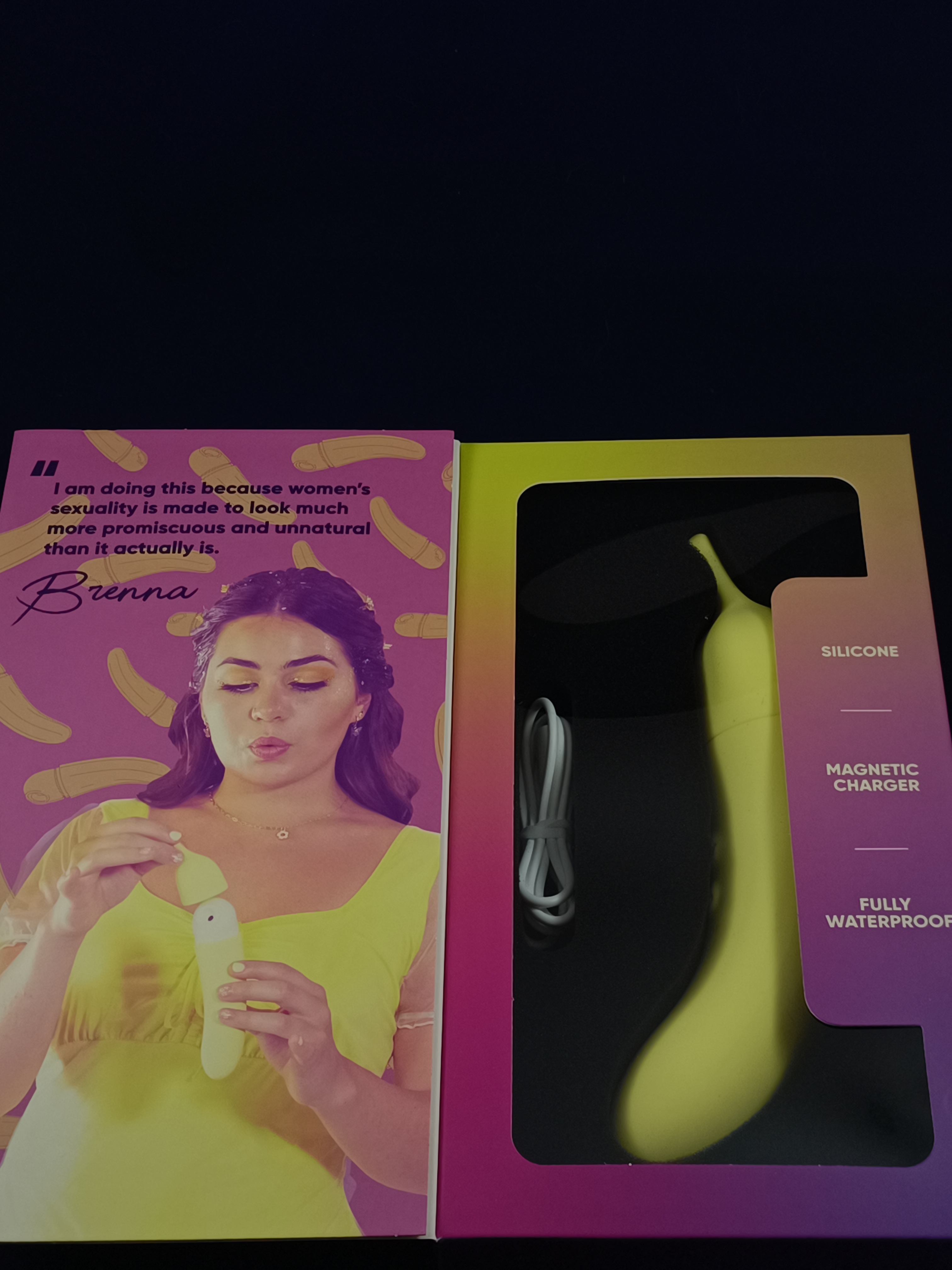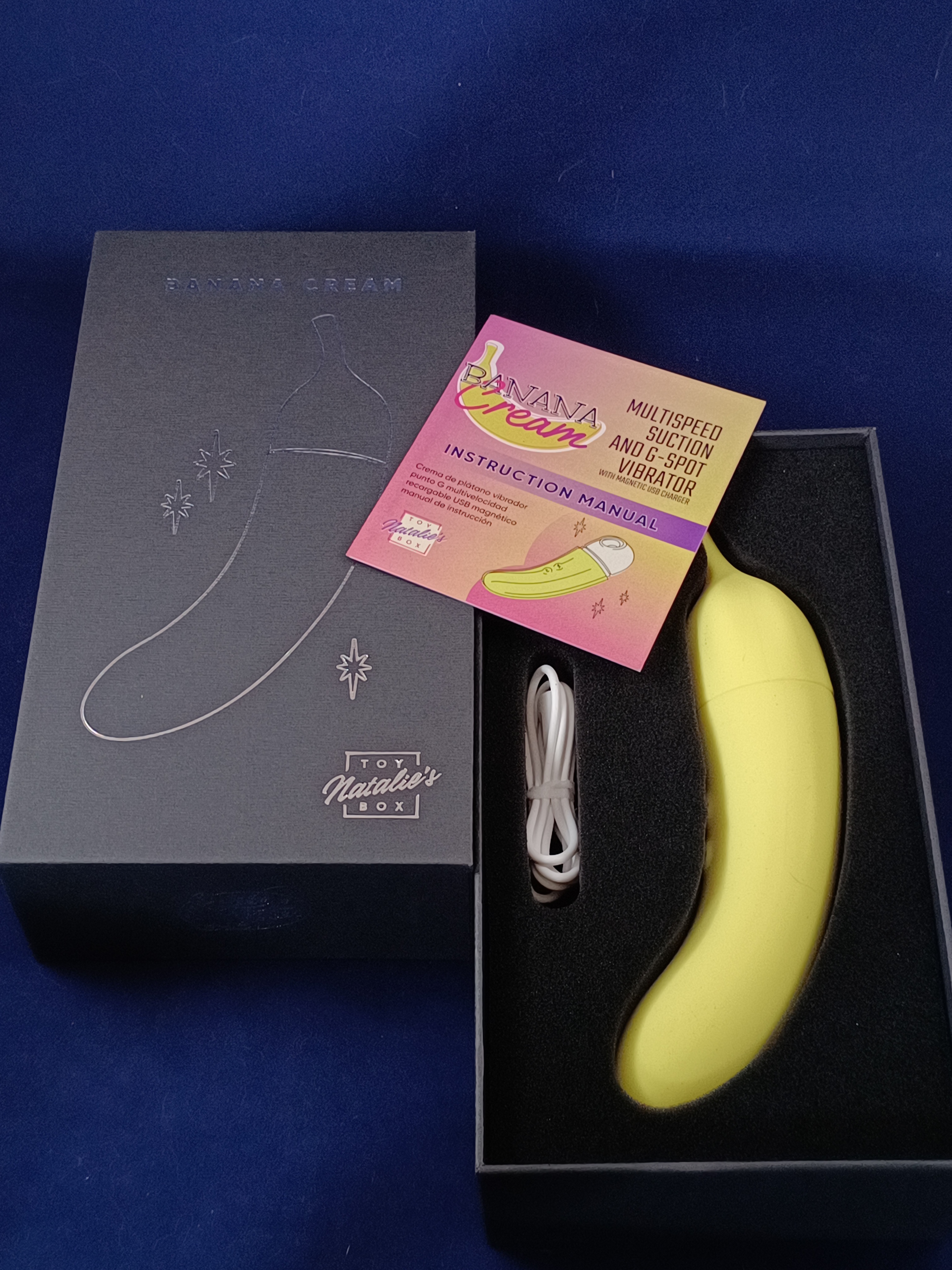 First things first, I'm absolute Bewitched by Like a Kitten's whole aesthetic for this box and the other two boxes I received from them... they're just lovely and utterly delightful in their own ways. It makes me hope that these three devices each make me twitch my nose and feel magical ><". The font choices, stars and overall coloring scheme just make me want to go binge watch the show lol. I also find that I'd accept and have already pictured Fran Drescher being a spokeswoman for it, since the font chosen for "Banana" has The Nanny vibes to me and I just feel it would make CiCi feel uncomfortable and would certainly provoke Niles into getting her a basket of them lol.