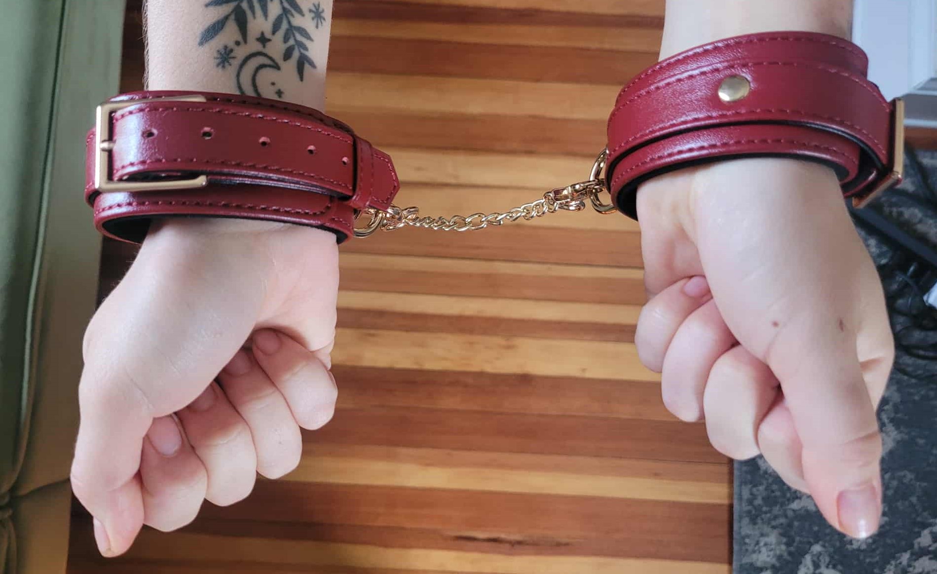While this product absolutely exceeded my expectations on appearance, it was too awkward to actually put on for it to be practical in play. If I wanted to wear cuffs as an aesthetic look at a play party, they'd be perfect, but they're too difficult to fasten for me to use in kink play. It's also worth noting that they didn't close tight enough to keep my hand from escaping - it would have taken effort to do so, but my hand could still slide out. I don't have especially small wrists for a woman, so I imagine a smaller woman would be unable to use them for restraint.