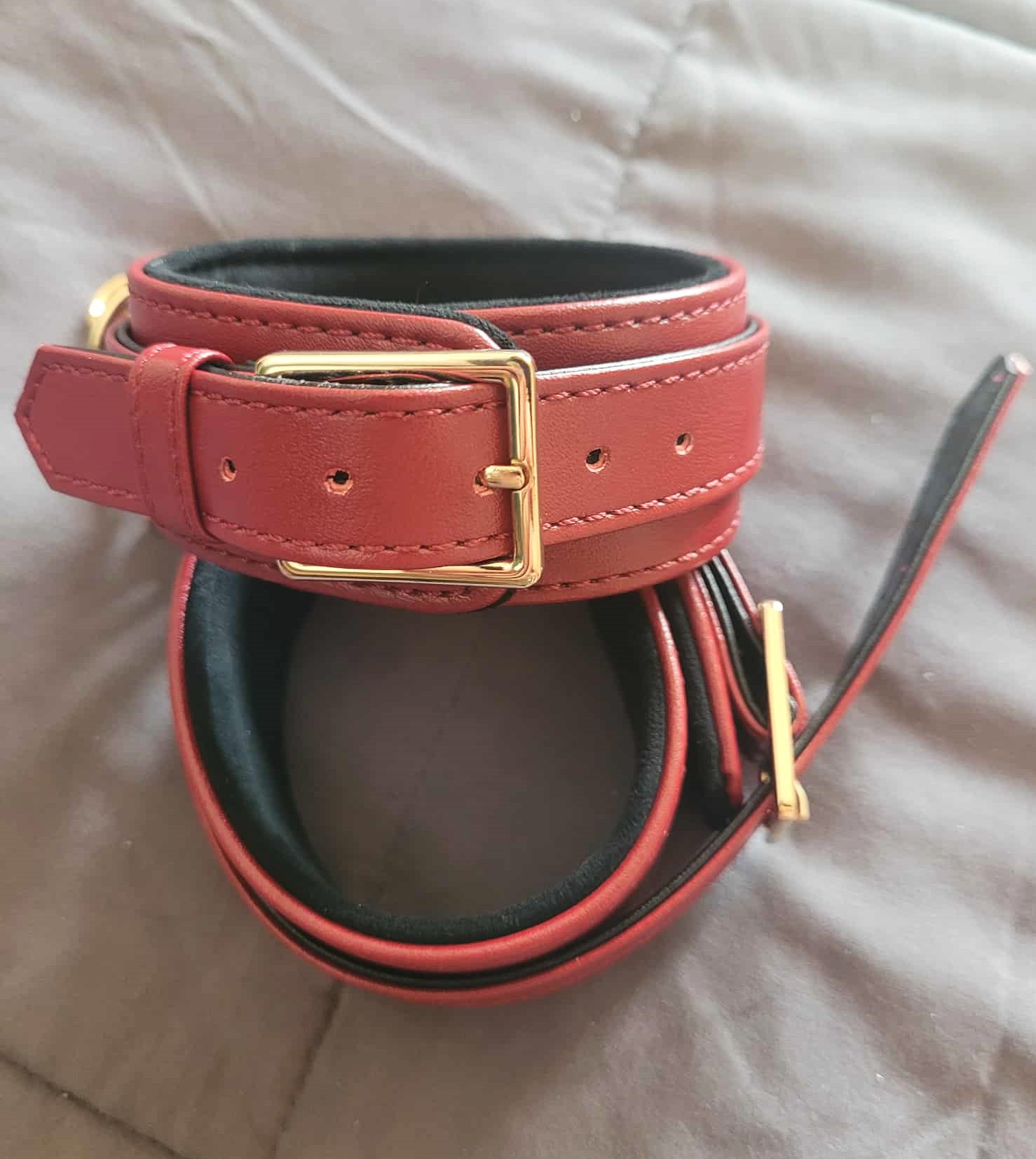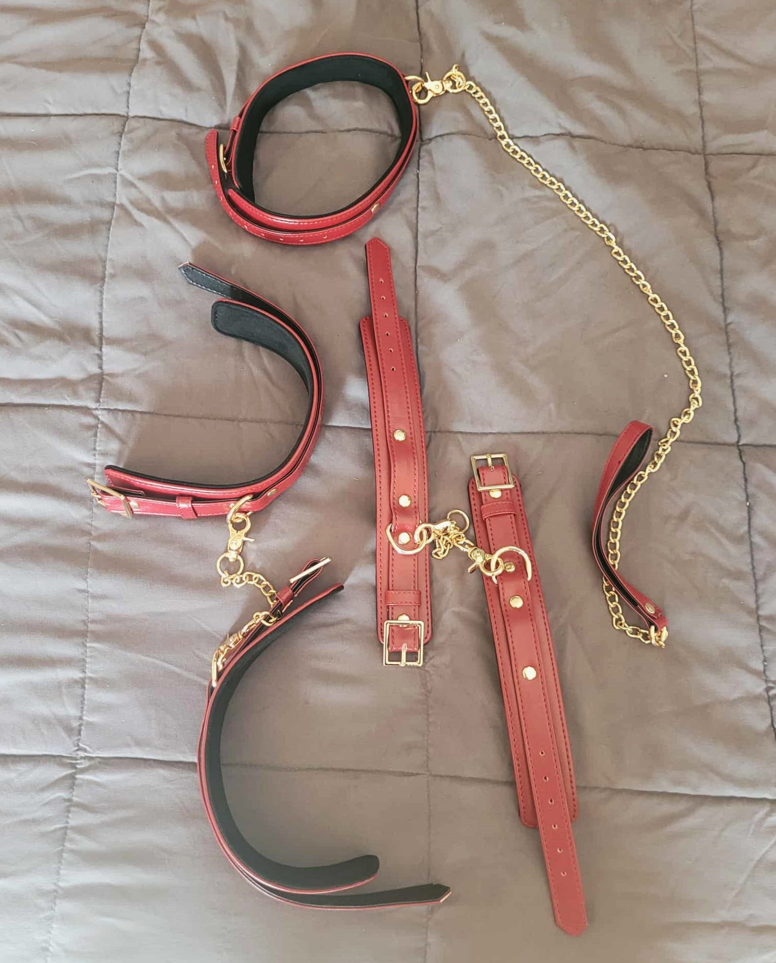 This 6 piece set of restraints is beautiful. I love the red synthetic leather and gold chains. The synthetic leather appealed to me as someone who does not use animal products. The red and gold contrast beautifully, and look elegant yet edgy when worn. The faux leather doesn't look cheap or fake, either. It's easy to tell the chains aren't actually gold, just plated to look that way, but what normal person has ever purchased actual gold chains? (Sorry if you have, it just seems kind of ostentatious and unnecessary to me...I'm a practical girlie). The inside of the cuffs and collar are padded with soft microfiber, which makes it extra comfortable to wear. This is important for if you're doing any kind of pulling on them.