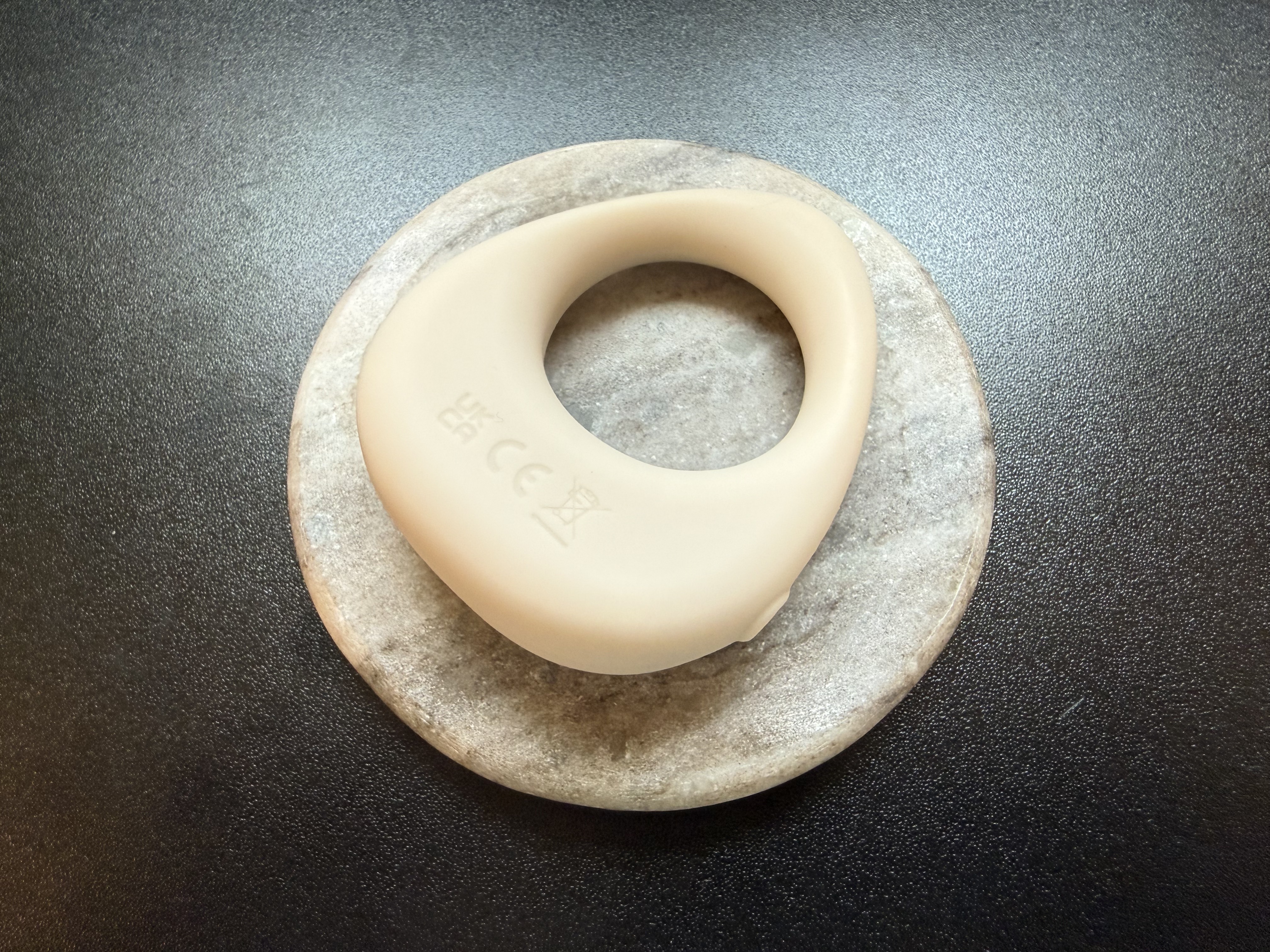 This cock ring has a very simple but functional design, and it's unique enough for Maude to have a patent pending! The entire exterior of the device is covered in an silky soft FDA grade platinum cured silicone, with just a single button on one side to control it. The thinner side has a sort of pointed end to it, while the other side is thicker and contains the vibration motor and battery. It has an opening diameter of 1.4 inches, and overall width and height of 2.4 and 2.9 inches respectively. It's a pretty compact toy and would be very easy to travel with or even slip in a pocket. They have two color options, grey and charcoal, though I'll note that they "grey" I have here looks more like a beige or oatmeal to me.