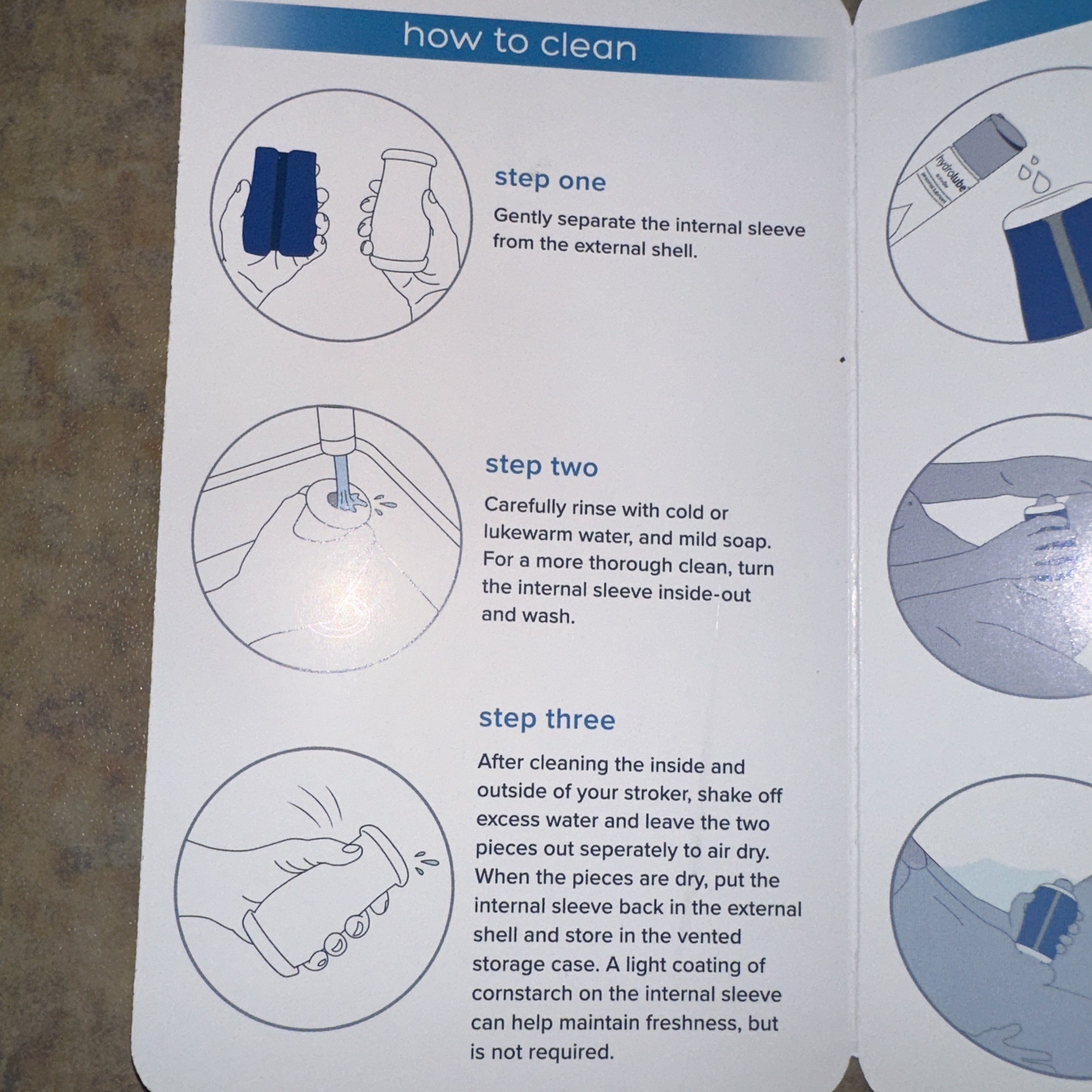 I bought mine from Walgreens, so it came in a cardboard box that, when opened, comes with the holding case (with the silicone stroker and outer shell in it) and brief instructions on how to use and clean the stroker.