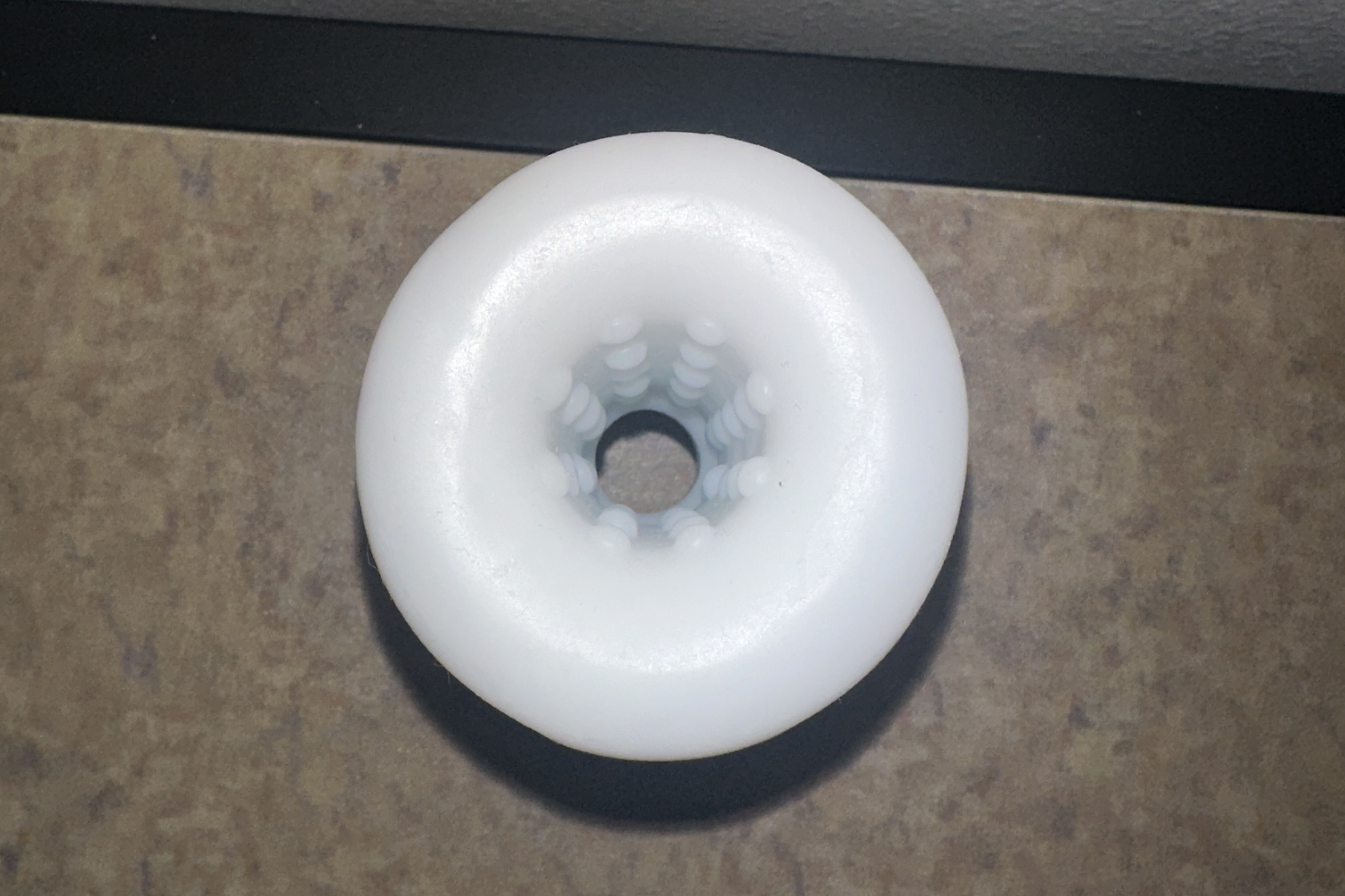 The inside of the stroker has two different textures that you'll feel, whether you enter through the bigger hole or the smaller hole; it just determines which one you'll feel first. If you enter through the bigger side, you'll feel little ribs, which feel meh, but then once you go around 3 inches deeper, the space will get tighter and you'll start to feel little beads.