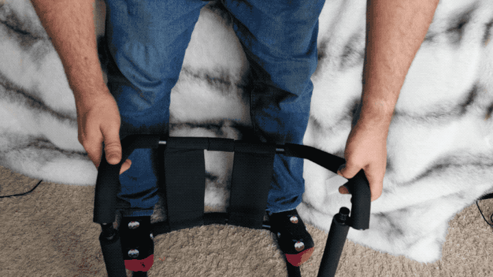 For this position, the receiver places their belly onto the stretchy part of the stool, with face and arms hanging off the end. Essentially, it’s doggy style with belly support. And in theory, this is brilliant; the straps let you bounce them back and forth.