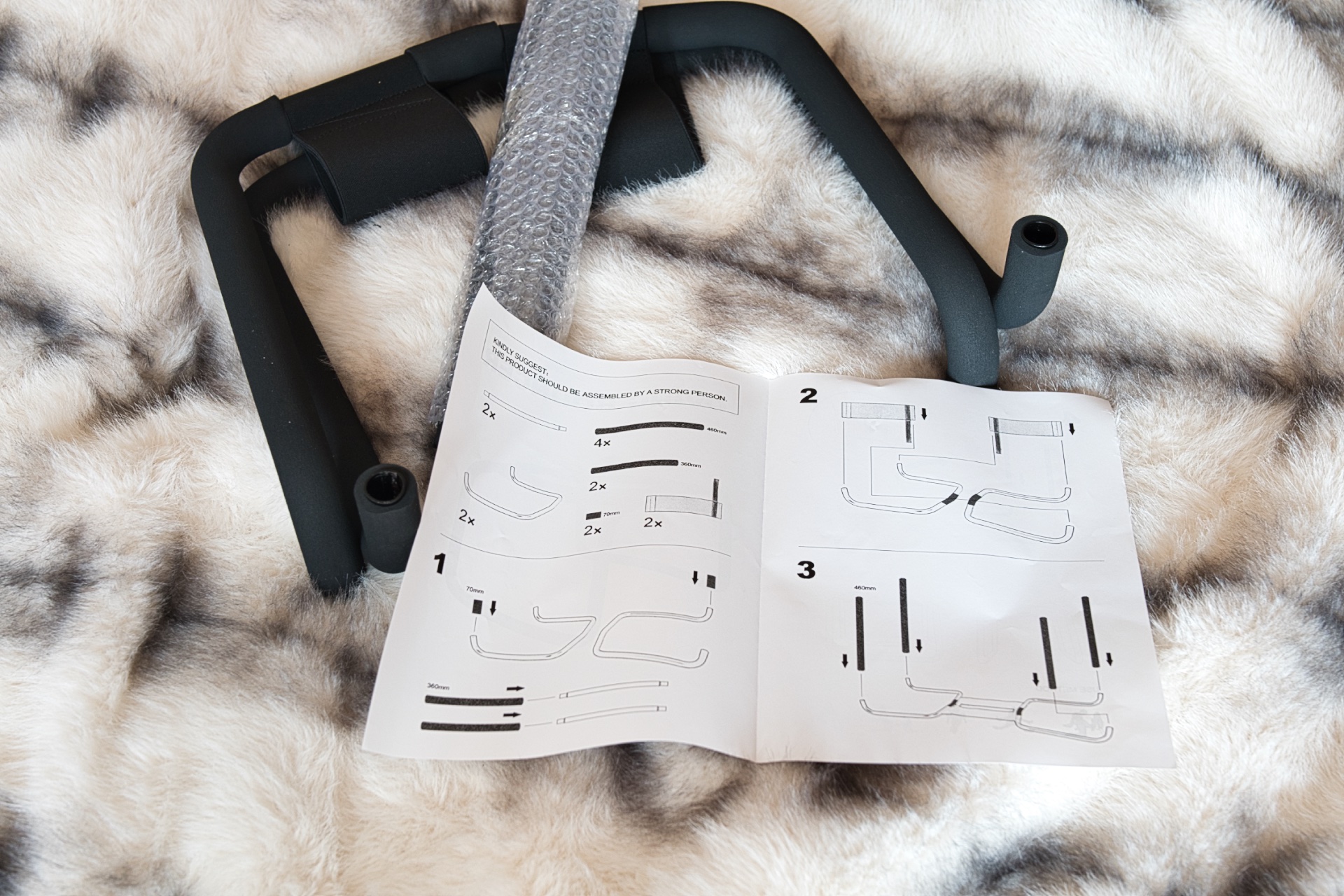 The manual states "kindly suggest: this product should be assembled by a strong person", and it's not kidding. The elastic straps are incredibly strong, and you'll need to stretch them to about twice their length to place the two halves together. That alone is no easy task, but doing so while also attempting to thread two legs into the right hole is a bloody workout.