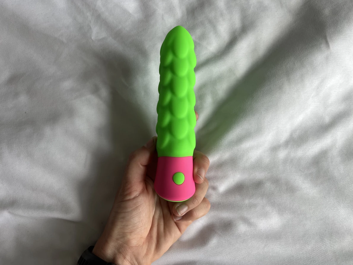 The Rave Ripple by Calexotics is designed to be fun. The packaging, title, and toy itself is meant to scream rave. The font on the box mimics the electro-futurist vibe of raves, and the color is fun and wild. The dripping texture on the toy reads almost like dragon scales, though it also gives Christmas tree. It’s a weird looking toy. For me, the aesthetic design direction doesn’t appeal.