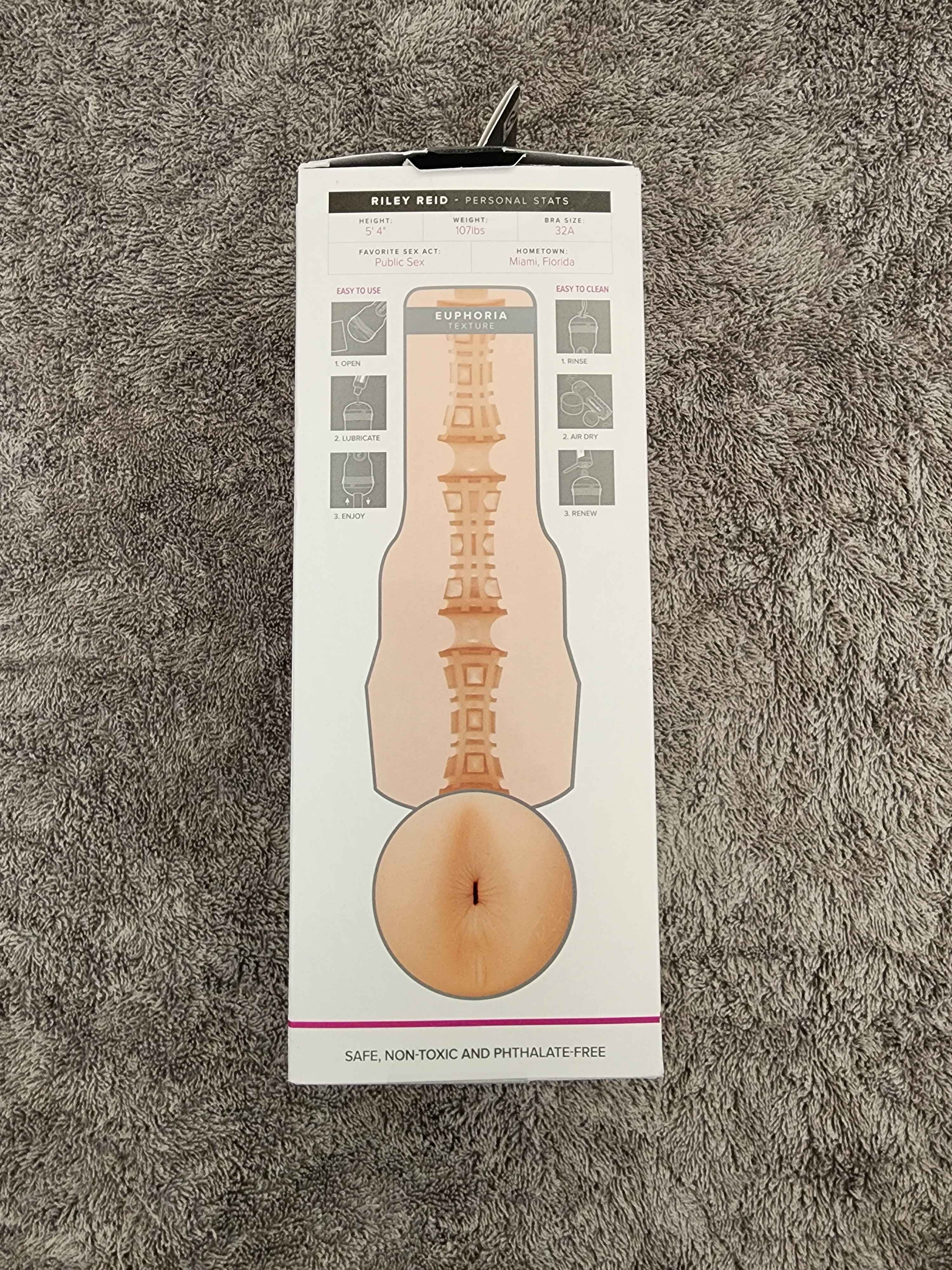 The packaging for Riley Reids Euphoria Fleshlight is just like any other from Fleshlight. Riley is on the front with her ass pointed towards you as you open the box.