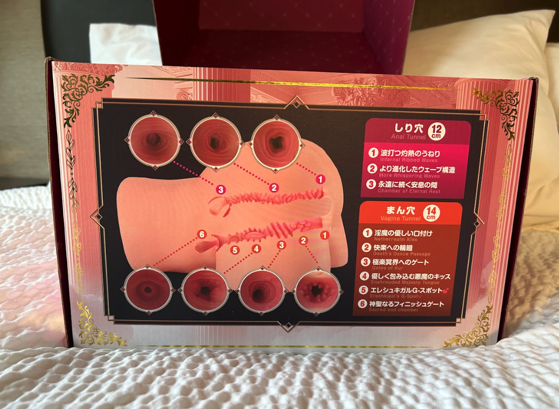 I ABSOLUTELY LOVED the packaging that Ereshkigal came in. My beautiful queen is seen on the front of the box with her ass and pussy lips taunting you. I'm not going to lie, my pants got tight just at the sight of the box. The side of the box has some product specifications that talk about the different chambers inside of her. To be honest I didn't really read about the chambers because I was drooling over how gorgeous Ereshkigal looked. She was standing so naked and pretty, I couldn't take my eyes off of her.
