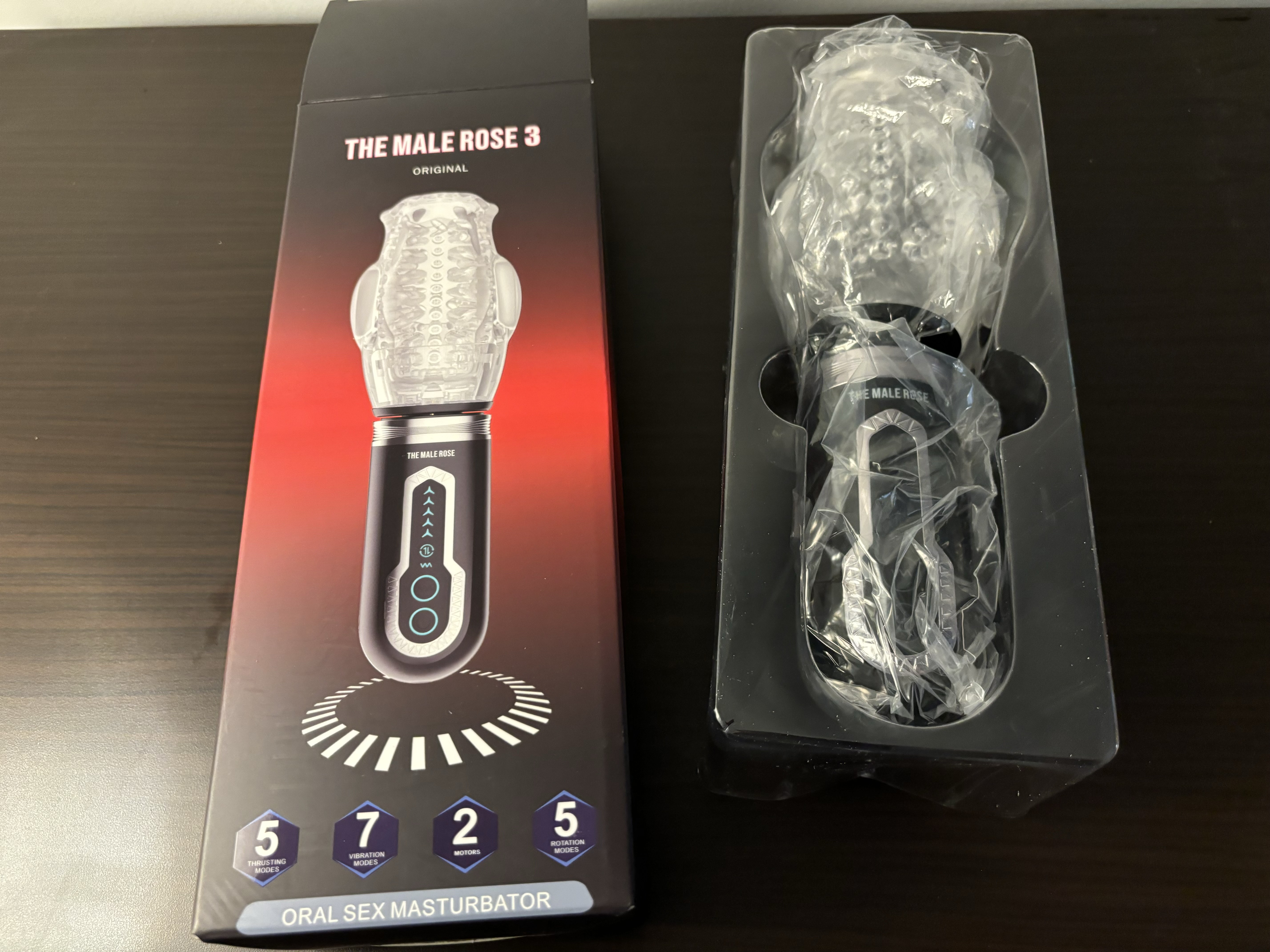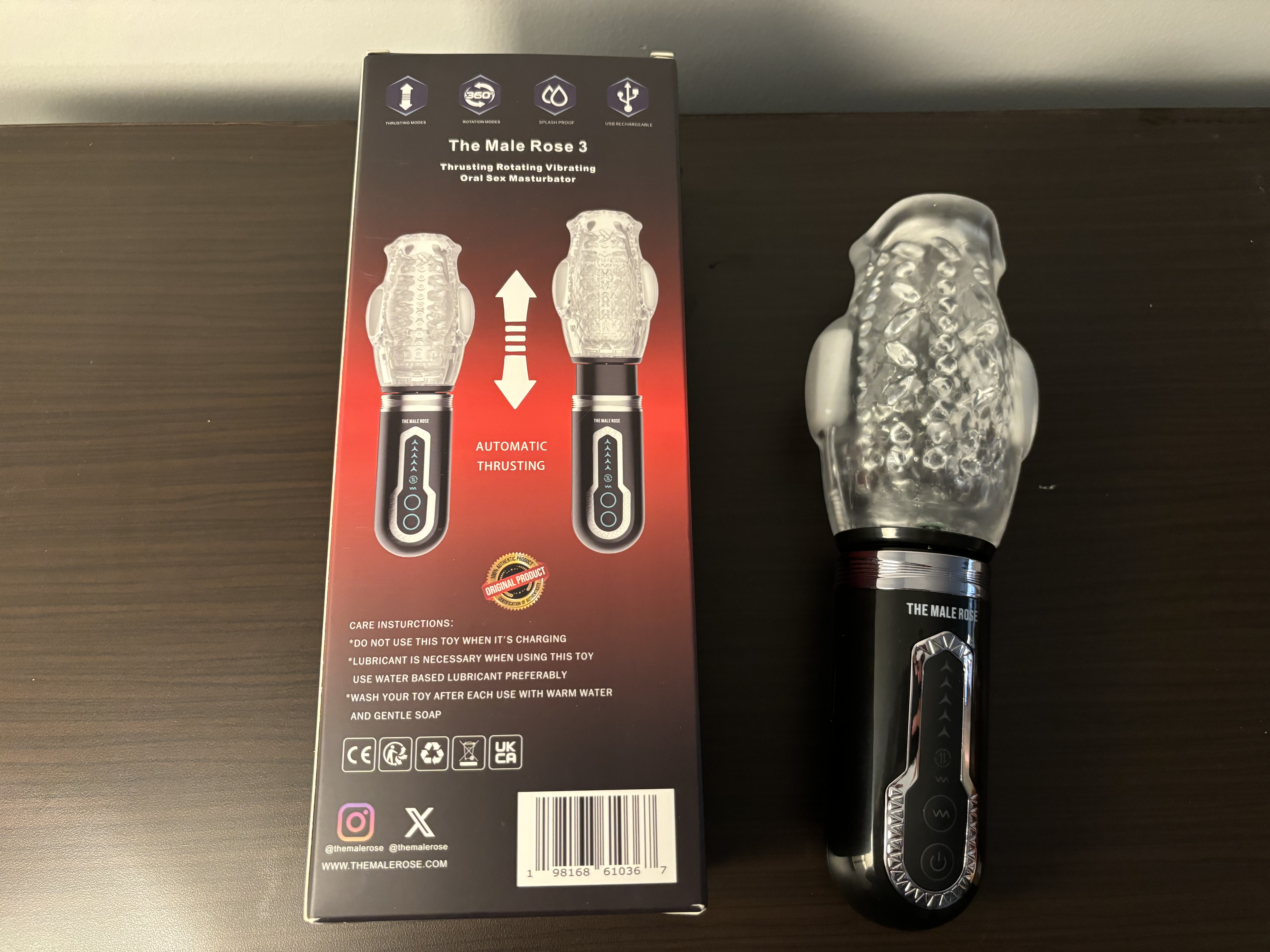 The Male Rose 3 is "3-in-1" sex toy: it thrusts (up-and-down), rotates (360°) and vibrates at the same time. The toy has two main parts- a clear cup and a control handle.