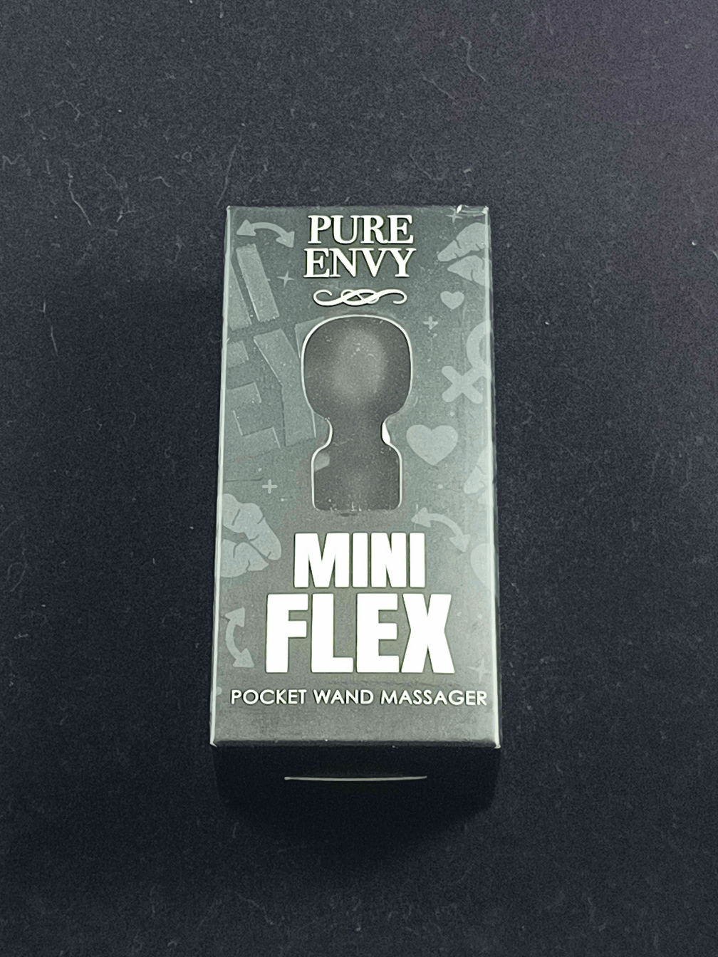 Dressed all in black with white text and grey symbols, Pure Envy's Mini Flex box is quite cute. The front features a window to the product itself that is cut to match the shape of the upper half, the company name is written above it and the product name and description are written below it. One side features the company website, while the other features the box's overall pattern. The back is short and sweet with the company name, 4 icons and short features descriptions, 5 bullets of more feature information and the usual stuff needed to make it a sellable product. The symbols scattered all over the box include: The product name in big letters, hearts, purses, female gender symbol, lipstick marks, double ended arrows, stars, panties, and + signs.