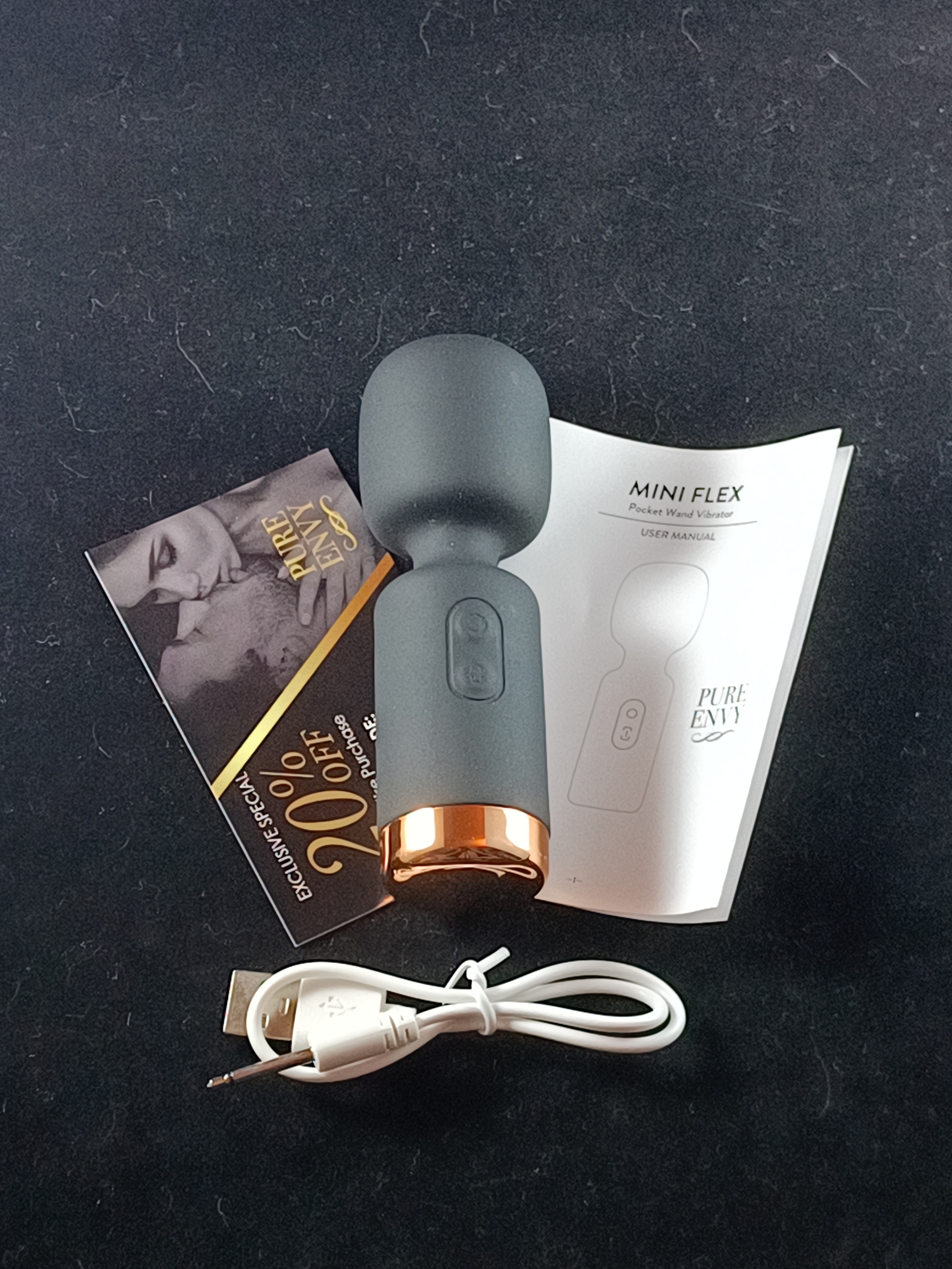 Inside the package: the product itself, a charger, an instruction sheet, and a 20% off coupon. It is very gratuitous of Pure Envy to include a 20% discount card with this product. I find it odd that this was the only product of the six I have received from them that contained one. Disappointed, as always, that there's no carrying pouch for this product, thankfully it's tiny enough that I could potentially get away with keeping the packaging as storage when it's not packed for traveling.