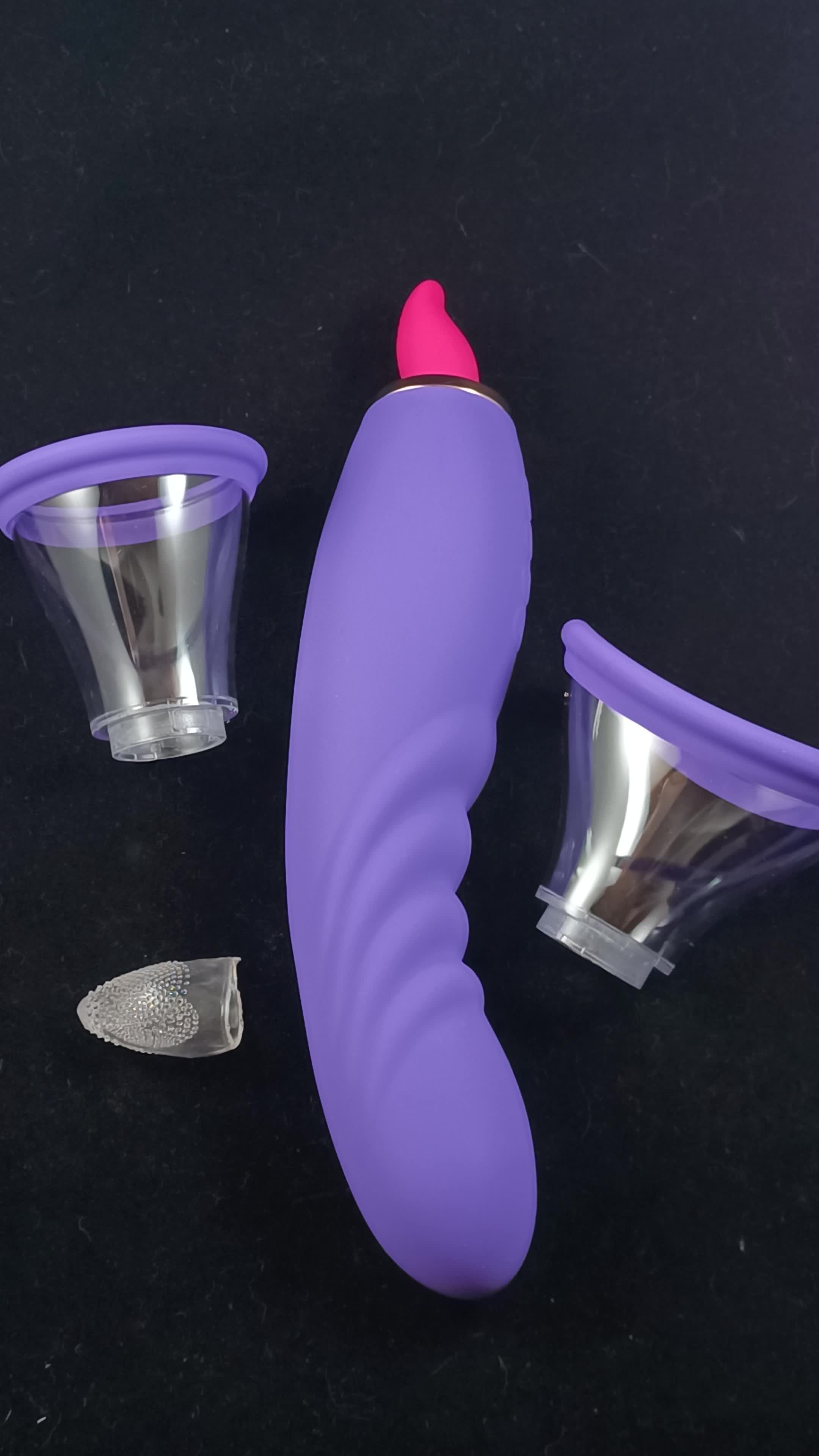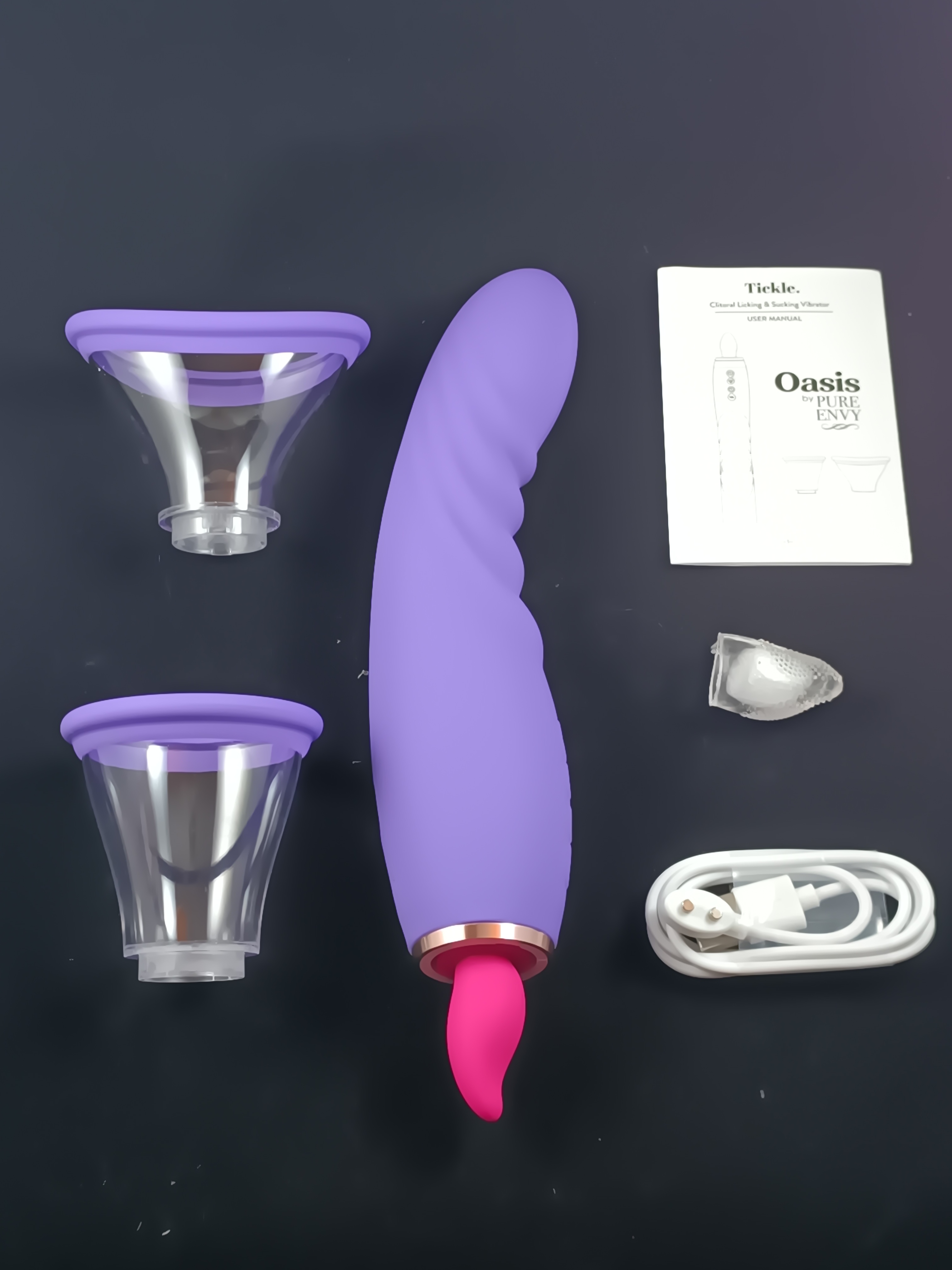 Pure Envy Oasis - An actual tongue looking piece on the end of the device, an optional texture cover for it and 2 different suction cup attachments to place on the tongue end. 7 licking modes, 1 auto suction mode, and 1 manual suction mode.