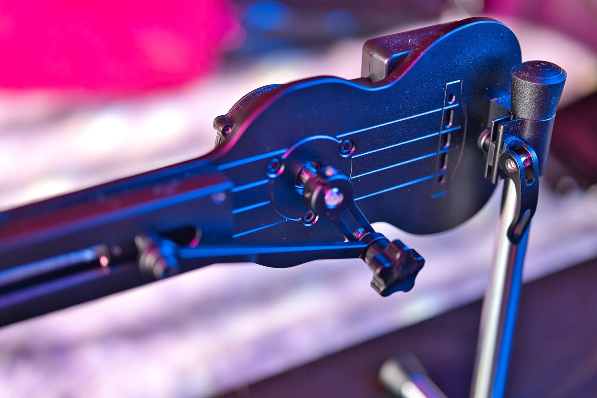 The Sinloli Ukulele looks like… well, a ukulele. Obviously. It’s tiny, at about 41cm or 12 inches long, and collapses down into a small carry bag. Putting it together is trivial, taking less than a few minutes, though the rubber leg caps can be annoyingly stiff. It weighs in at 11 lbs or just under 5kgs (without an attachment), which is light enough to move around, but not heavy enough to stay in place during vigorous use.