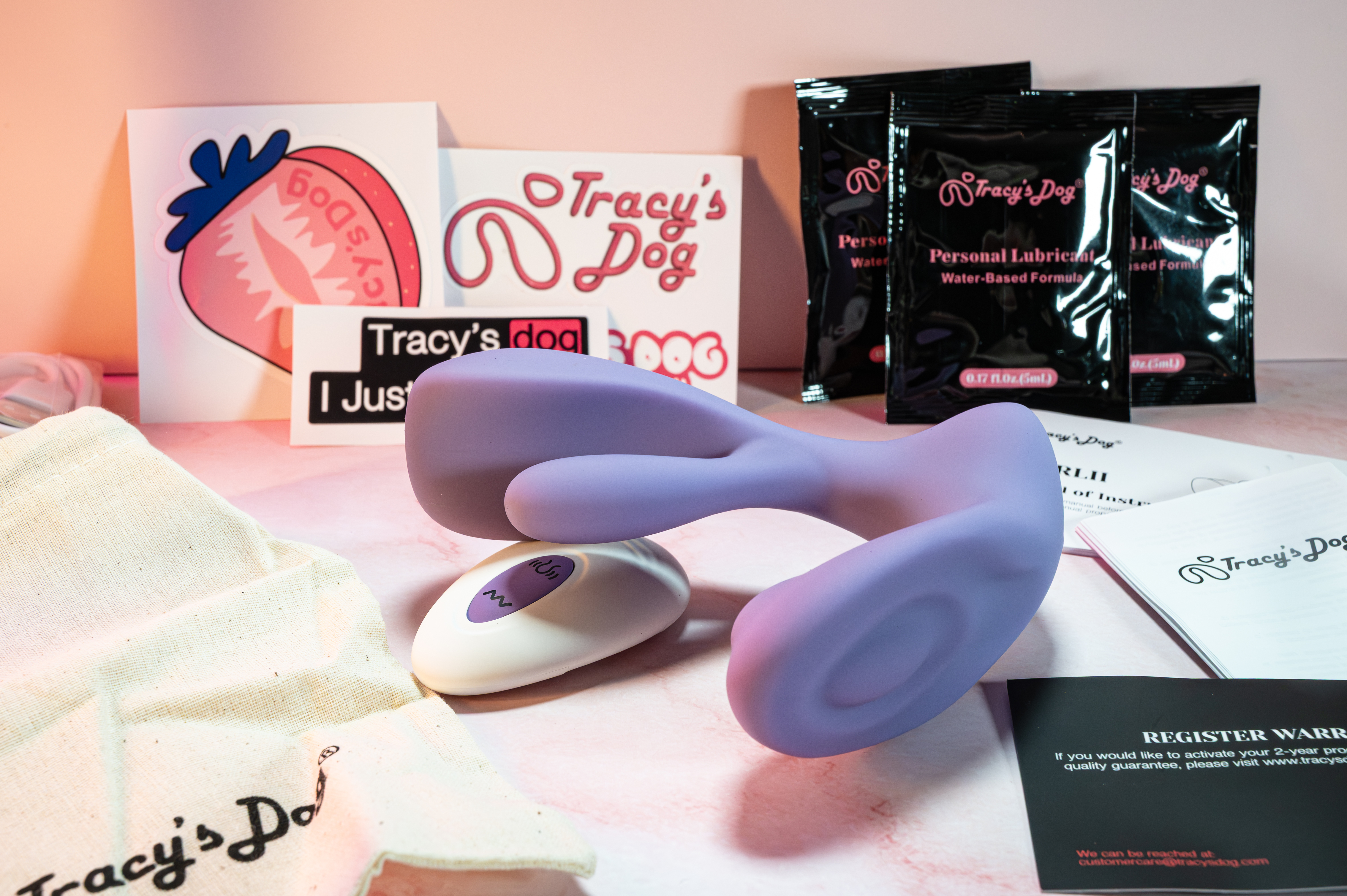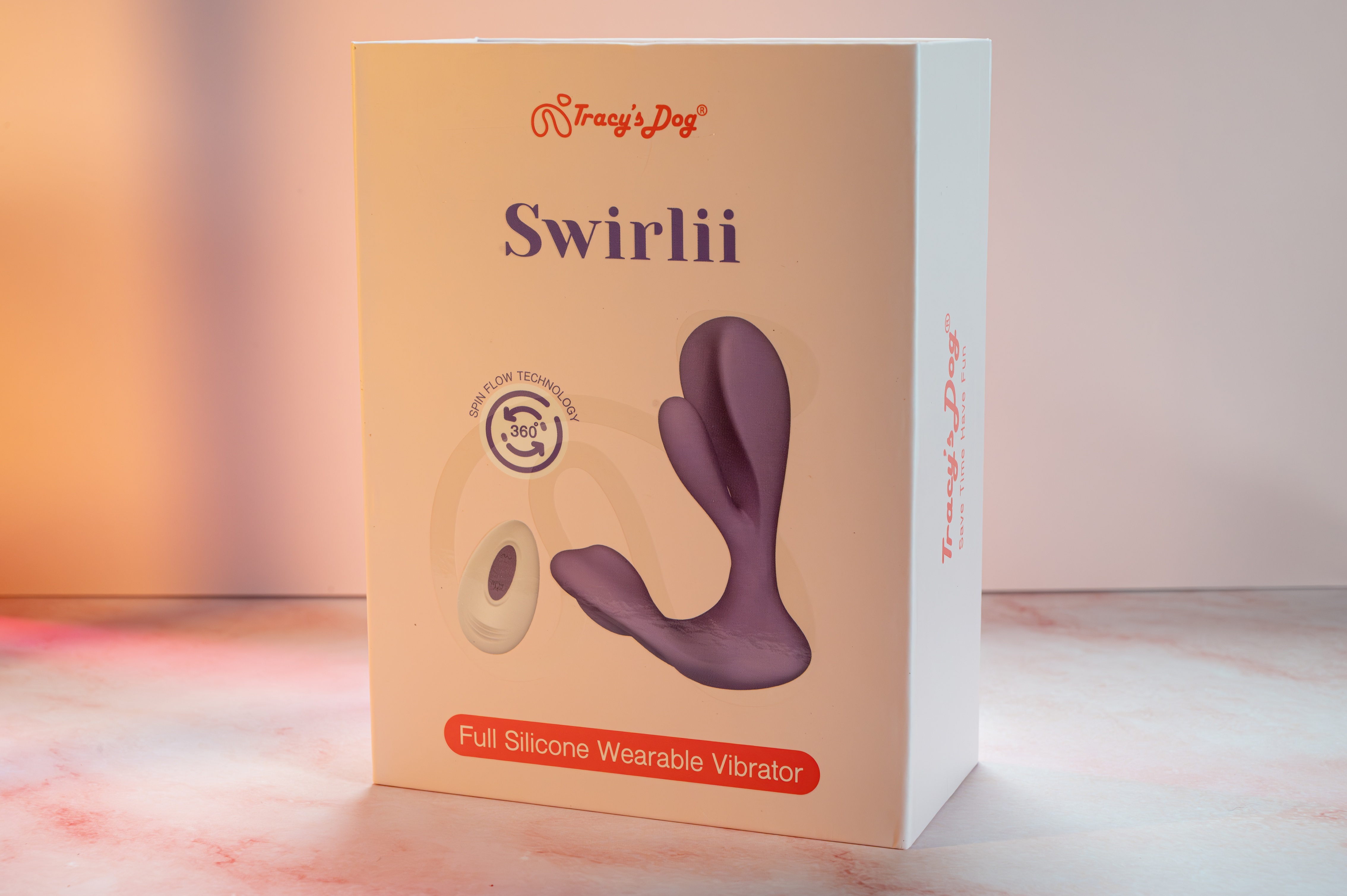 The inside of the package contains the Swirlii and its remote, 3 small packets of water-based lubrication, user and safety manuals, a warranty card, a storage bag, 3 Tracy's Dog stickers, and a storage case. This is more than I usually find within a toy's box, so it was a great surprise!