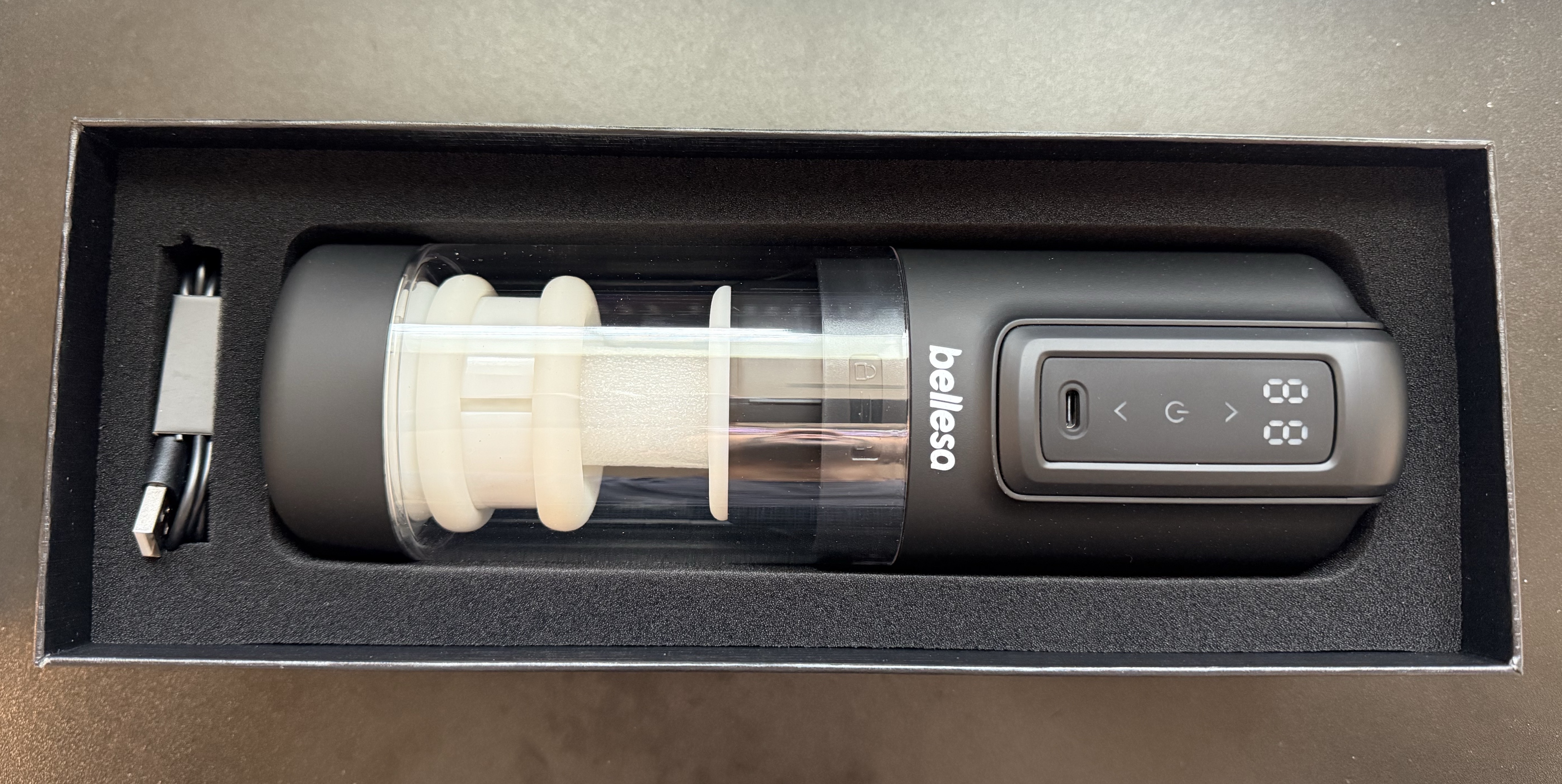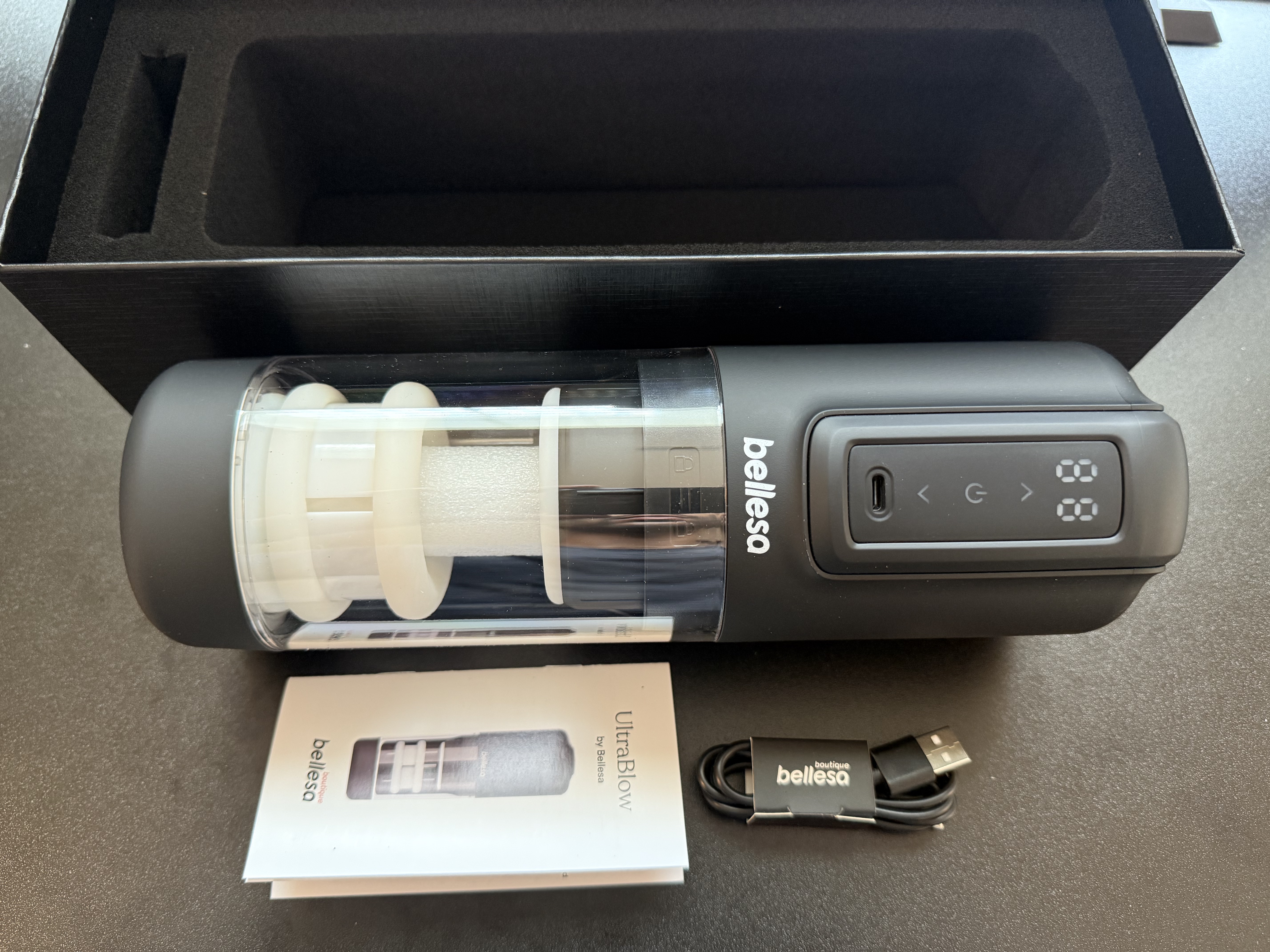 The packaging was very simple, and while not necessarily cheap feeling, it wasn't exactly premium feeling either which was surprising for a toy at this price point. There is a simple two piece box where you take off the top and inside is the stroker itself and the usb cable in foam slots. There is a little booklet of information buried underneath the stroker also with instructions and cleaning information. I would have liked to see some lube packets included considering how much lube it needs or a discreet bag for storage.