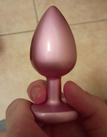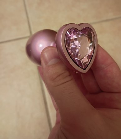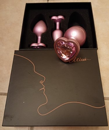 This set has the standard butt plug shape except it's a bit more narrow making it way easier to insert. The major upgrade for these butt plugs compared to normal butt plugs is on the base they have a super cute pink glass heart on them. They chose glass for each of these hearts and I think it's way more visually appealing than any cheap plastic one ever could be. The body of each plug is vibrant metallic pink which is reflective and smooth. The body of the butt plugs are made of nice cold metal and when it's run under warm water can become nice and warm before inserting.